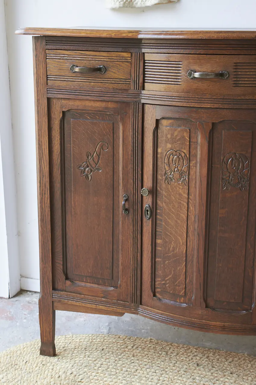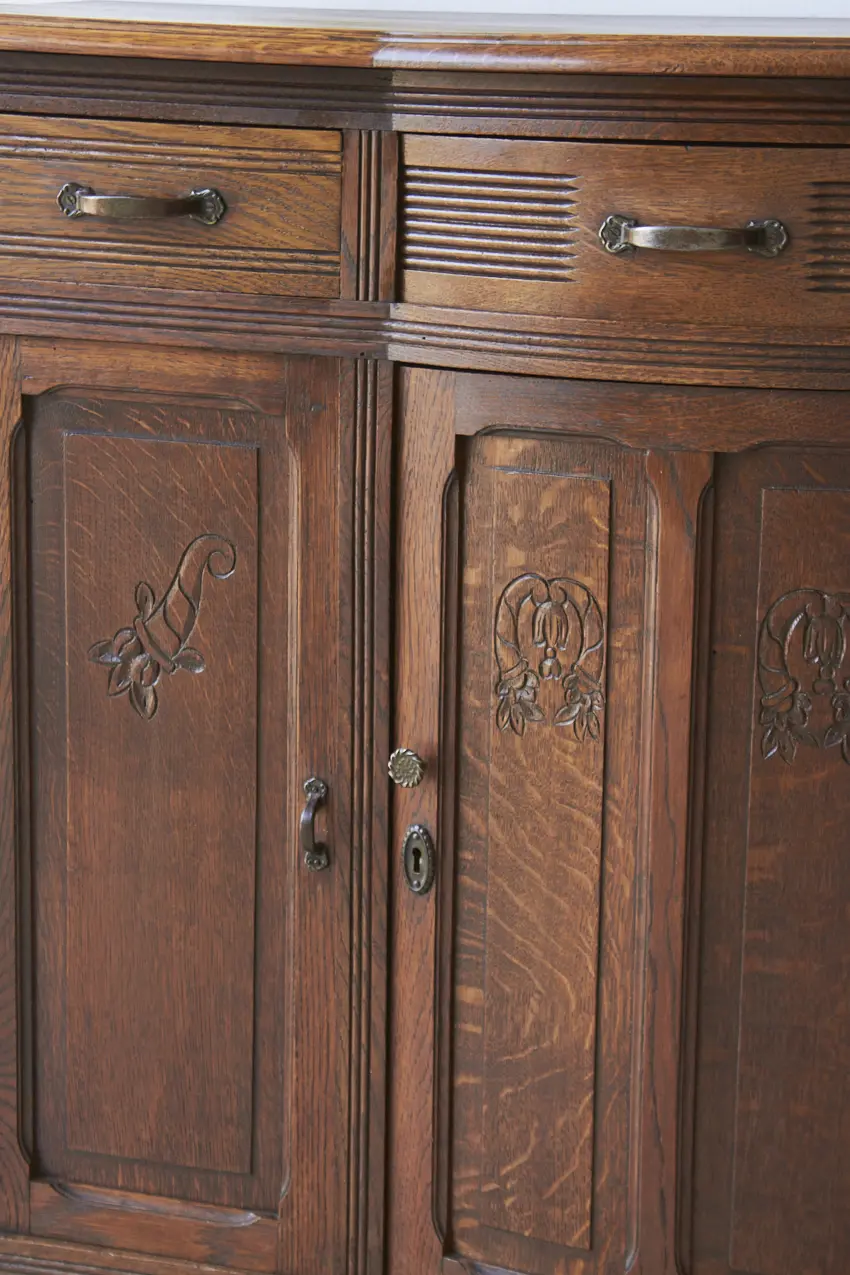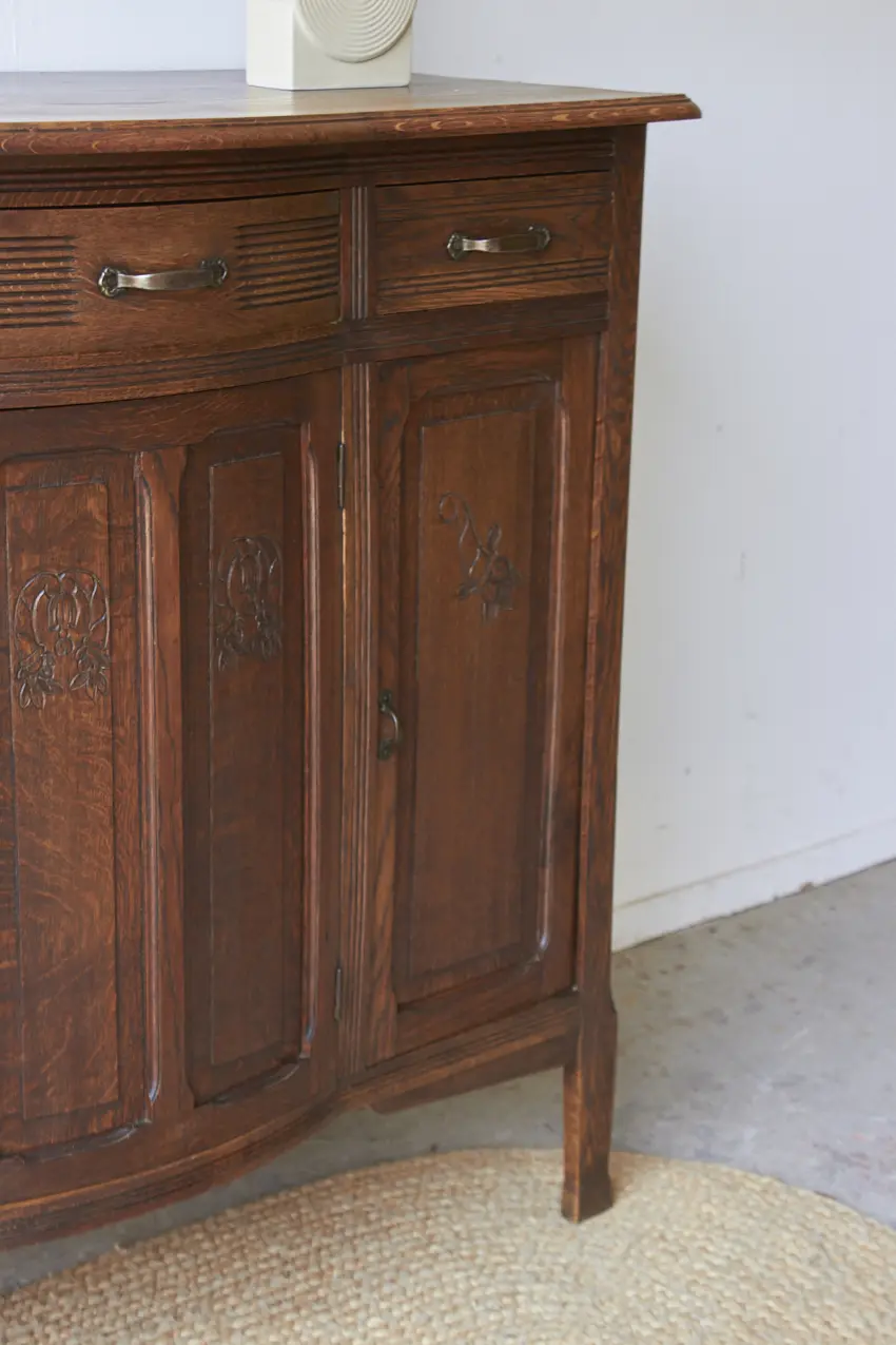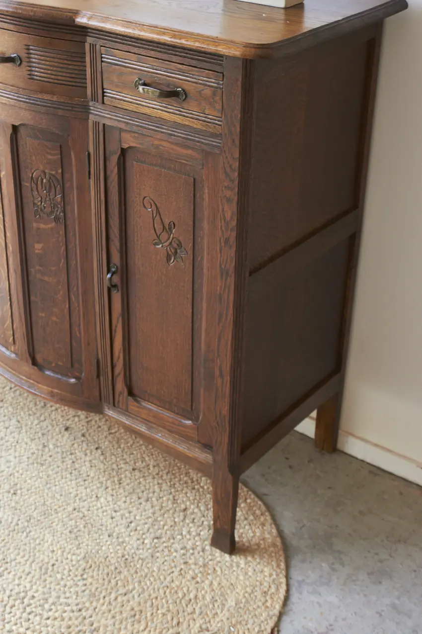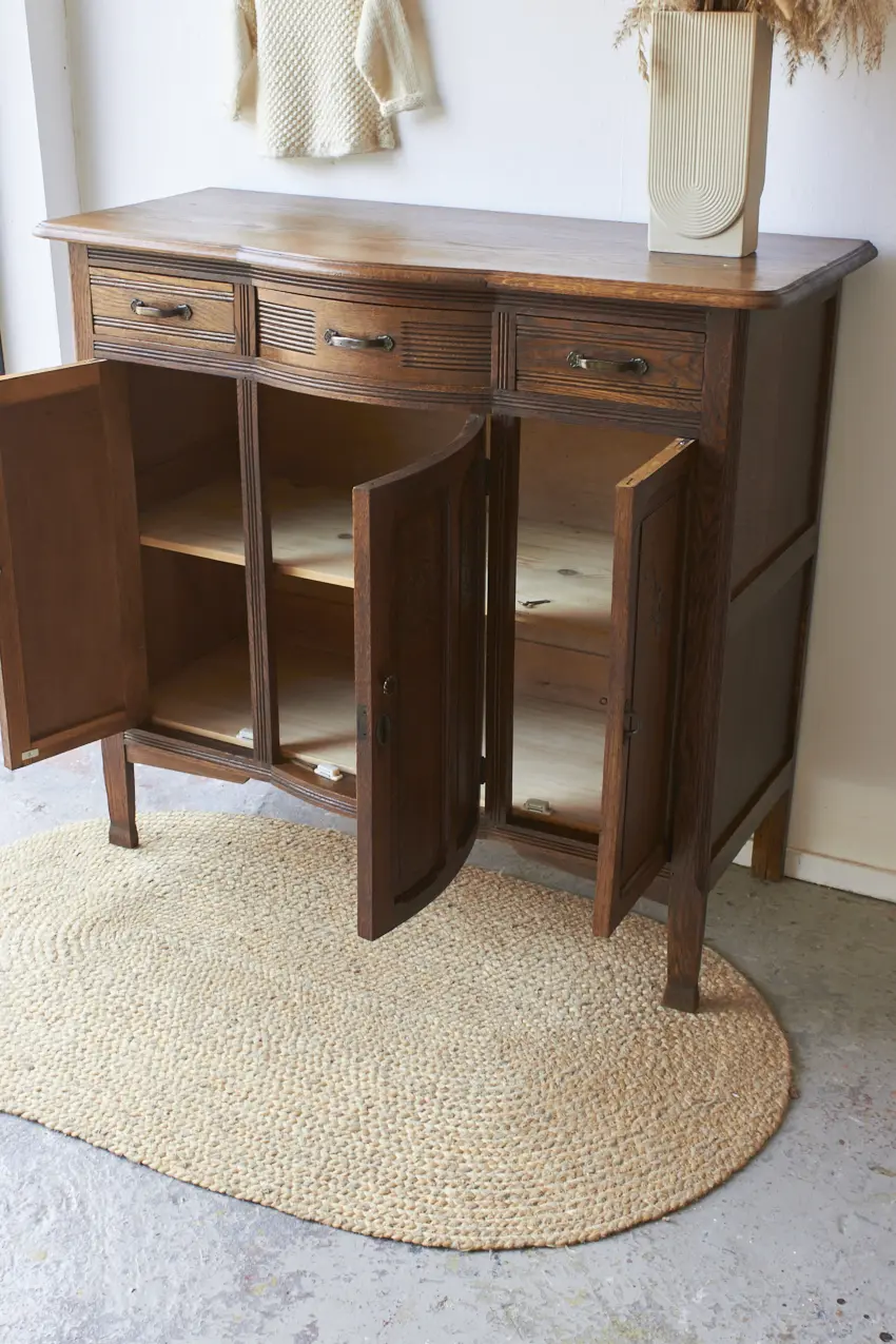We hebben hem goed schoongemaakt en behandeld tegen houtworm. De originele plank hebben we goed opgeschuurd, zodat we deze ook konden hergebruiken. Met de 3 lades bovenin is er genoeg opbergruimte. De commode is licht opgeschuurd en hebben we een nieuwe laag beits en meubel olie gegeven, nu ziet hij er weer uit als nieuw. Wat een leukerd, met zijn originele handgrepen! Alle deurtjes sluiten met een magneetje. Mocht deze commode iets te hoog voor je zijn, we kunnen gemakkelijk nog iets van de pootjes afhalen.