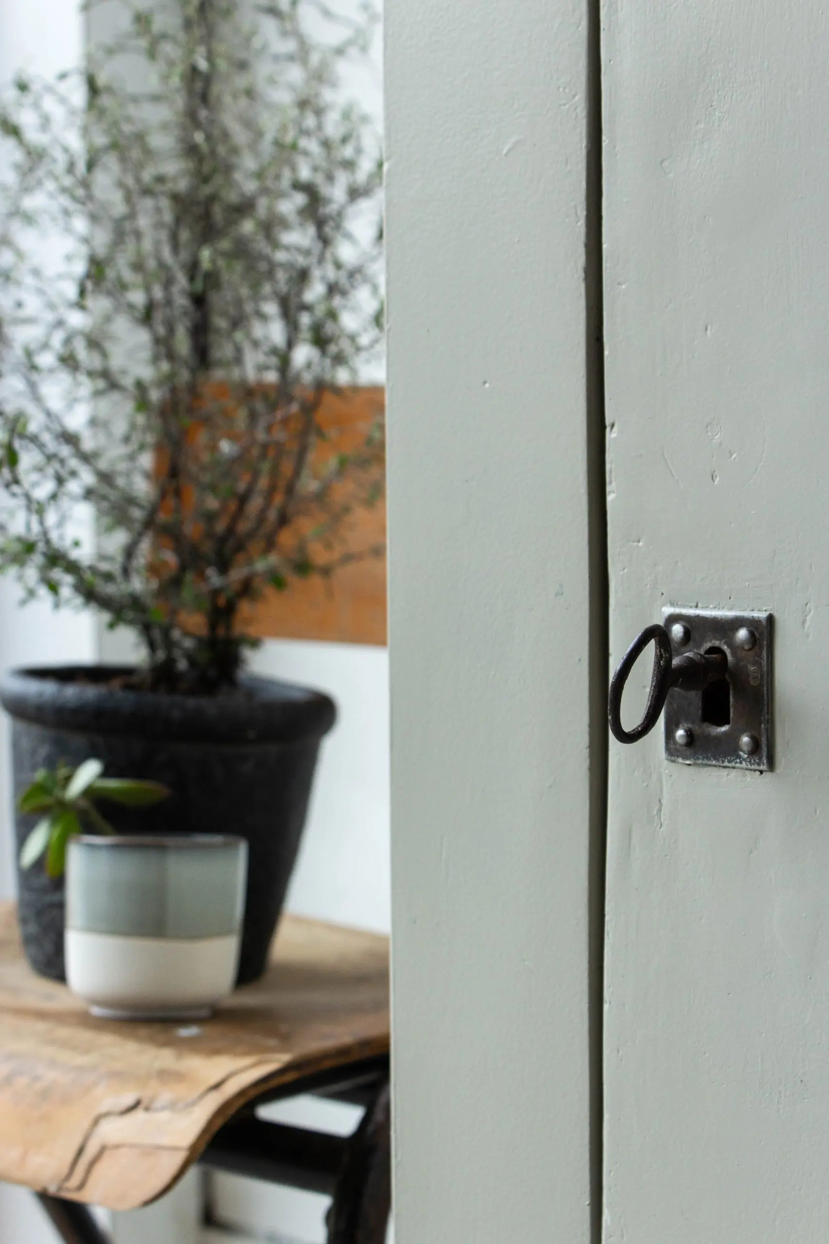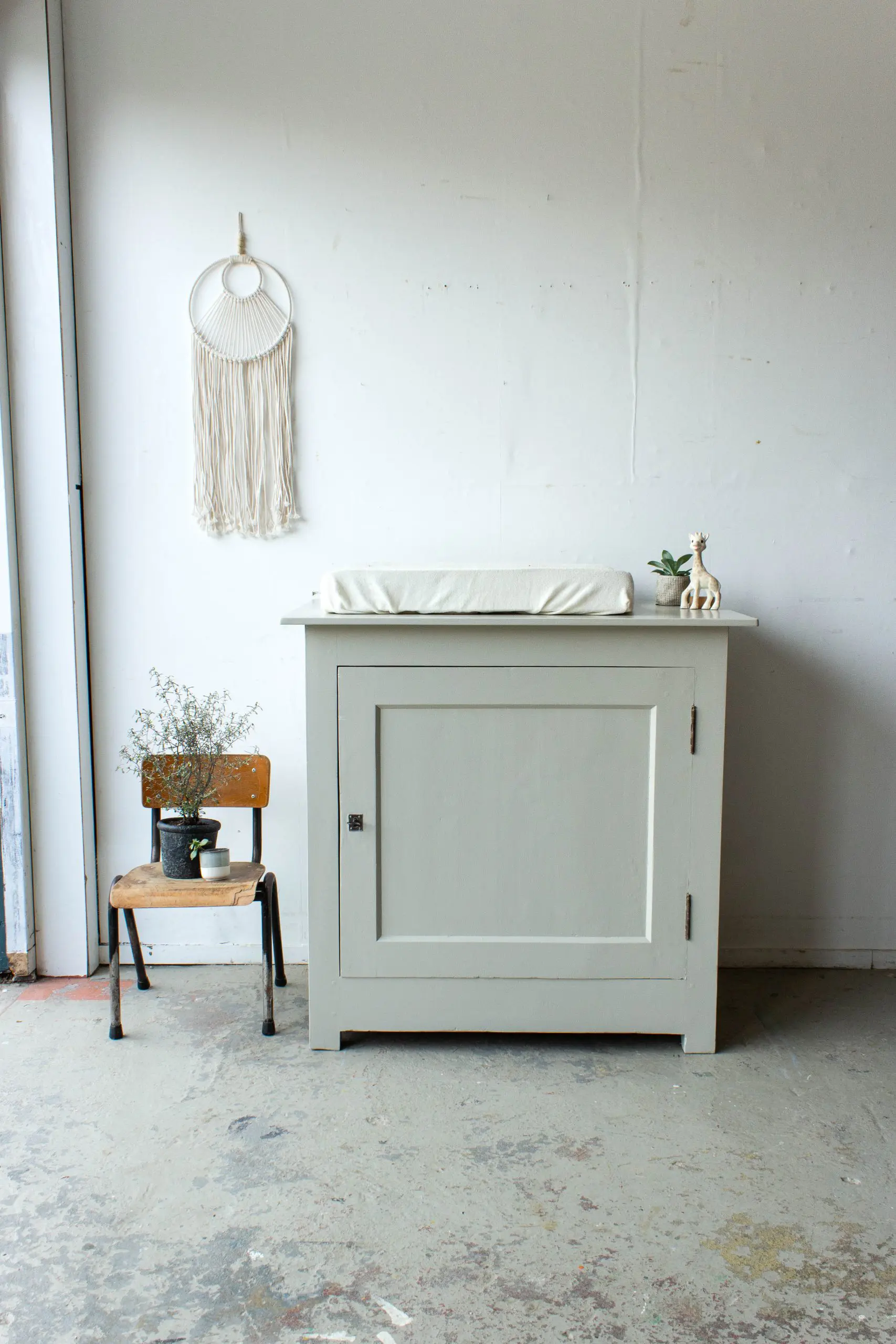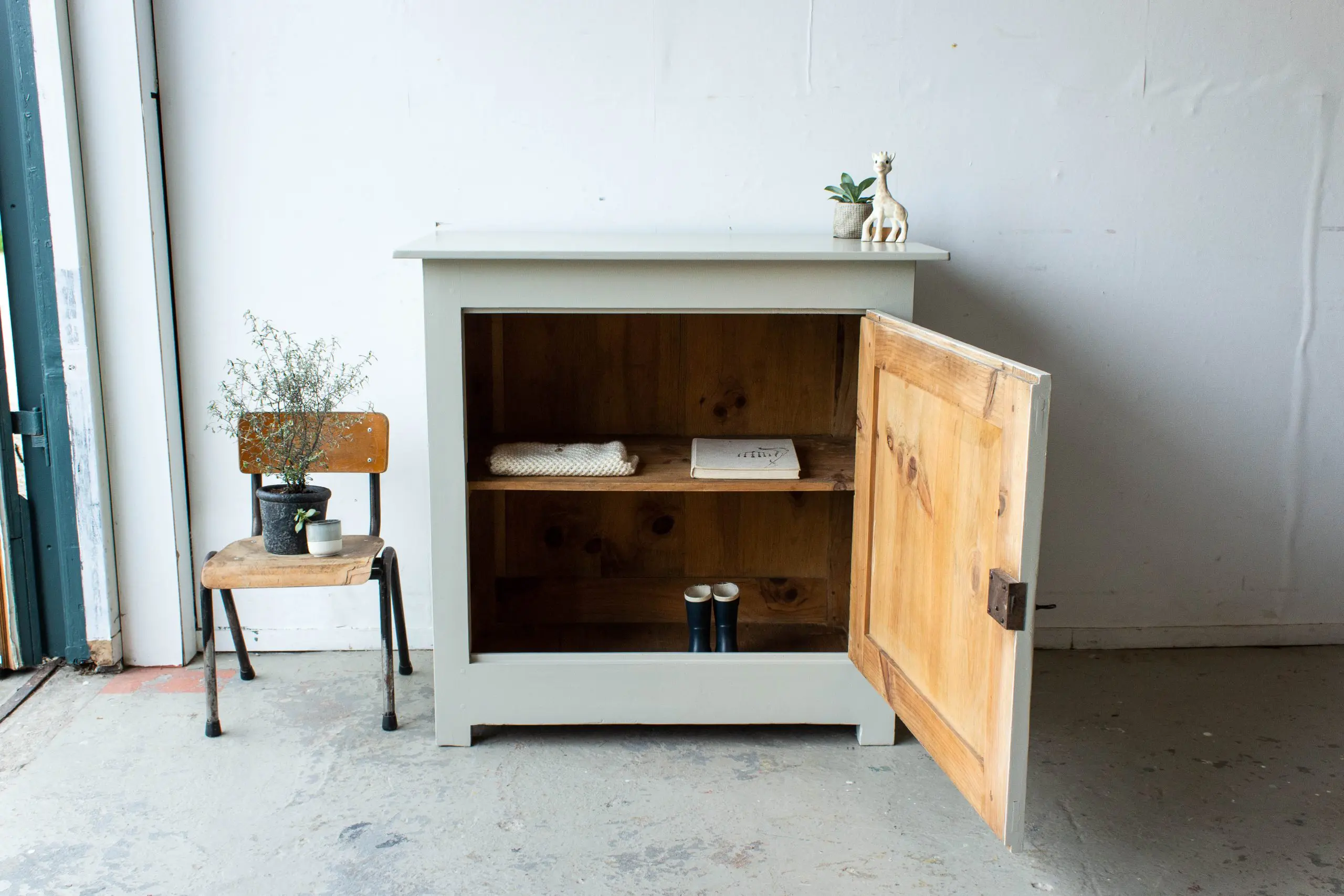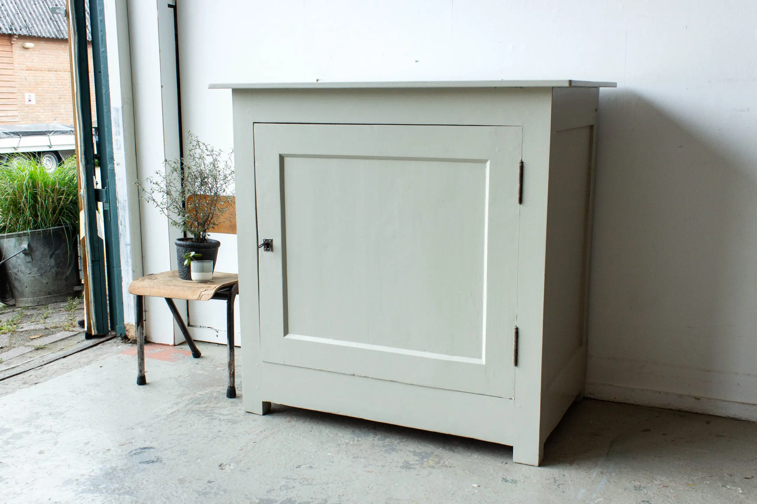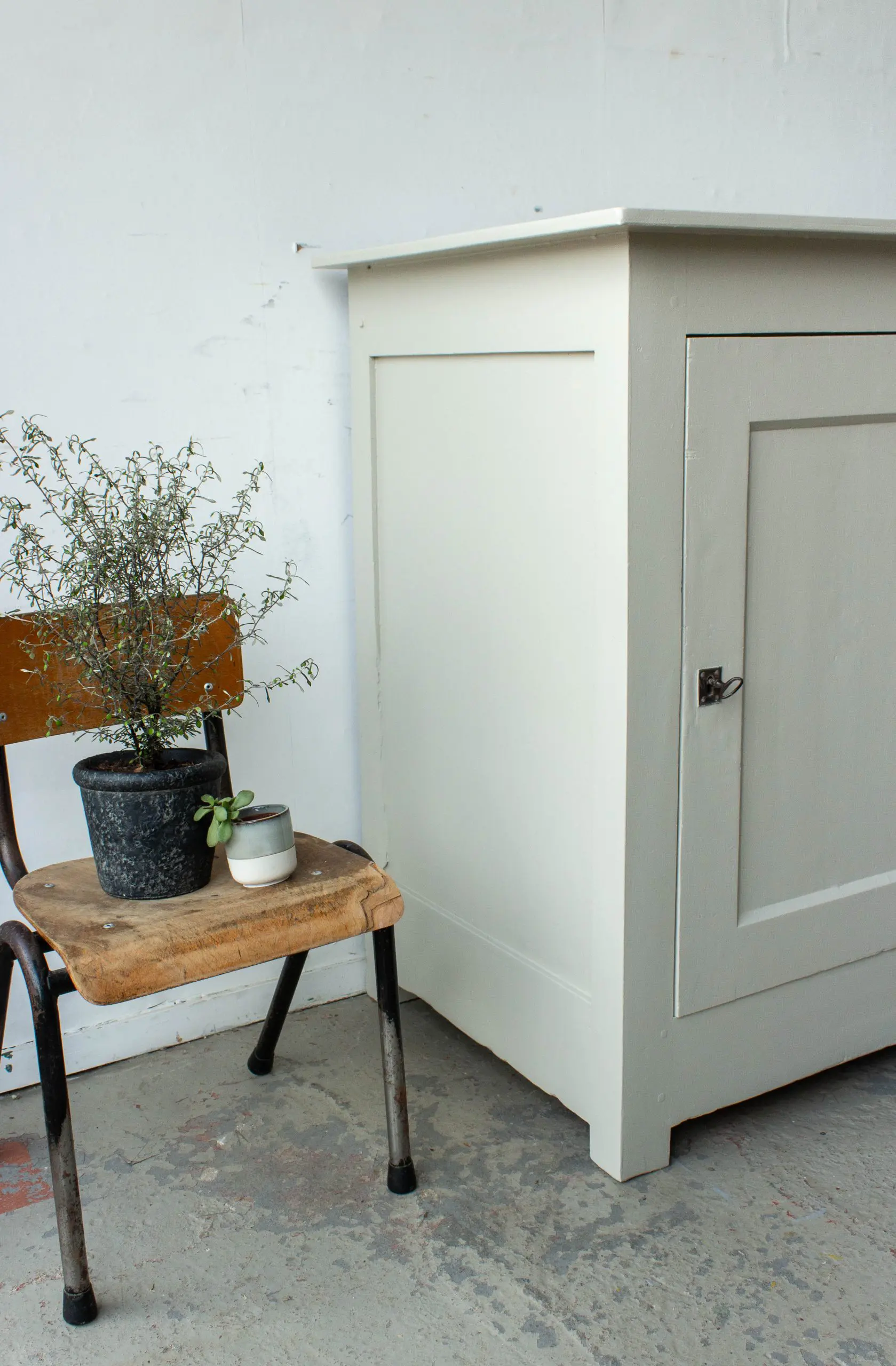 Een mooie, compacte vintage commode uit Midden-Frankrijk. We hebben dit stevige kastje allereerst grondig schoongemaakt en helemaal nagelopen. Daarna is hij helemaal kaal geschuurd en hebben we hem in deze zachte taupe kleur geschilderd. We hebben daarbij het sleutelgat en de scharnieren ongeschilderd gelaten, want dat vormt juist een mooi contract met de lichte kleur van de commode. Het kastje is te openen en sluiten door middel van de sleutel. En zo is hij weer helemaal klaar voor gebruik!
