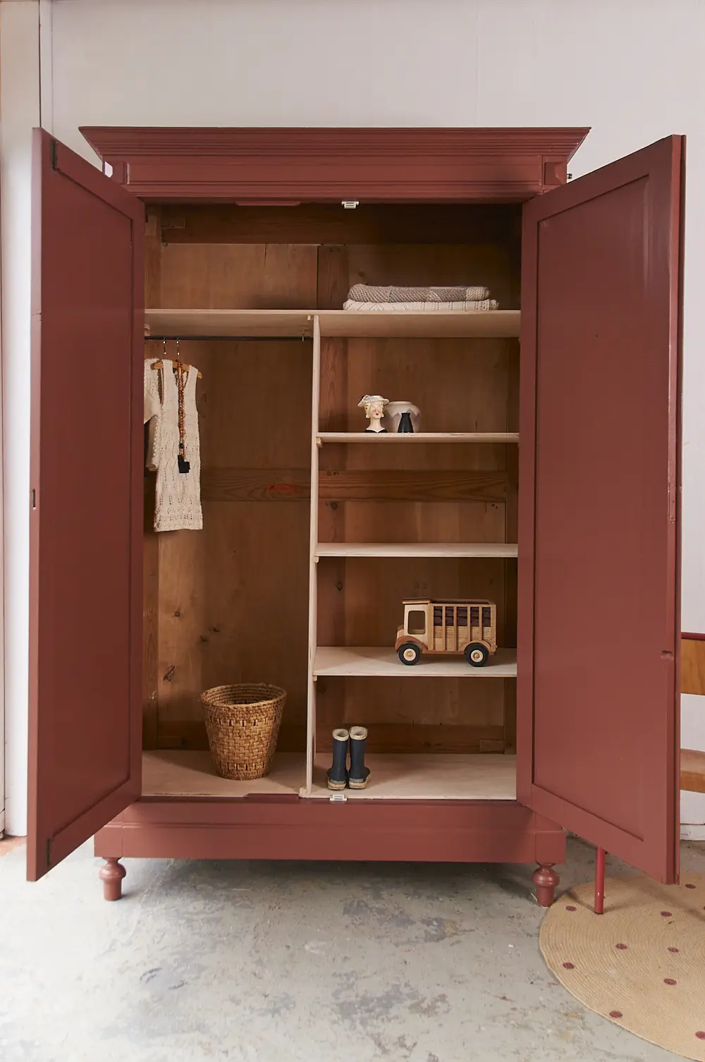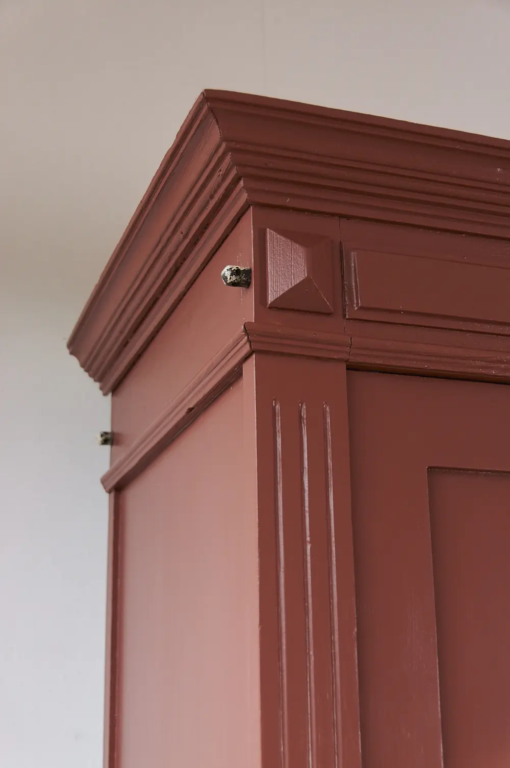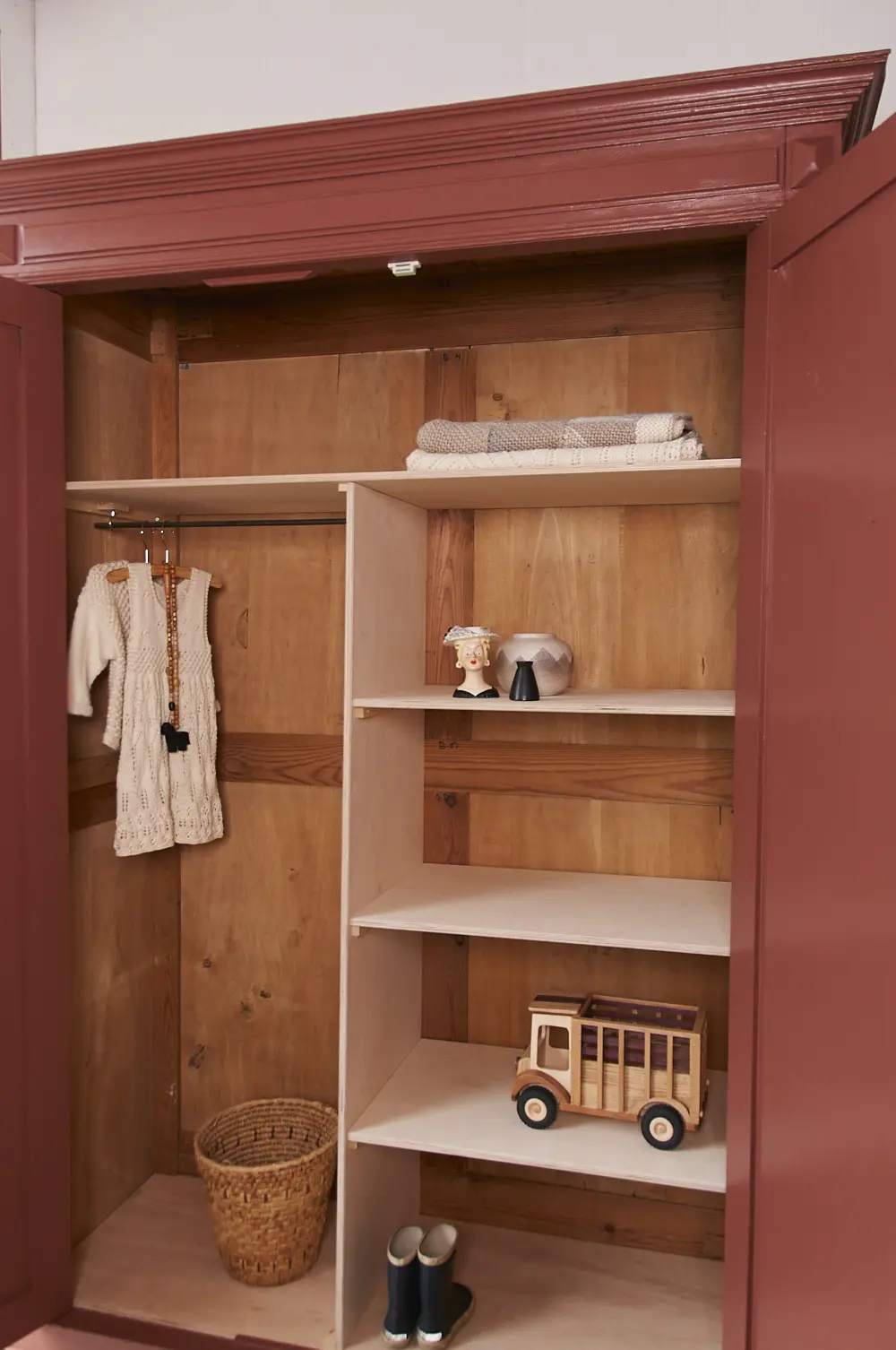 Wat een prachtige kast uit Belgie is dit! De paneel deuren vinden wij heel mooi, helemaal in combinatie met de kroon en de pootjes. Hier en daar een kleine beschadiging maar dat maakt de kast vintage. Alles zit weer stevig vast en de nodige reparaties zijn gedaan. Wij hebben de indeling aangepast, nu kan je er hang en leg kleding in kwijt. Boven aan de kast een plank over de hele breedte, daaronder links een roede en rechts 3 nieuwe planken. Uiteindelijk besloten wij hem deze fijne kleur te geven en hem af te werken met een porseleinen knop. De linker deur heeft 2 schuifjes en de rechter deur sluit door middel van een magneet. Kortom, deze kast is helemaal klaar voor een nieuwe plek!