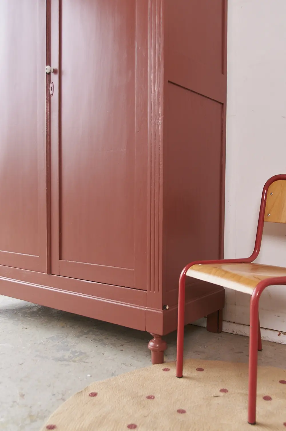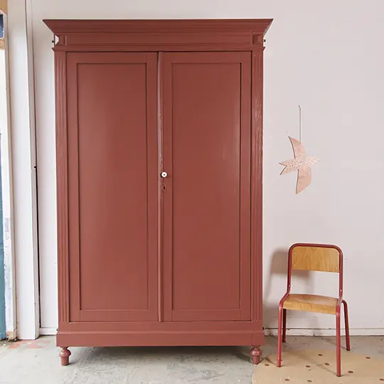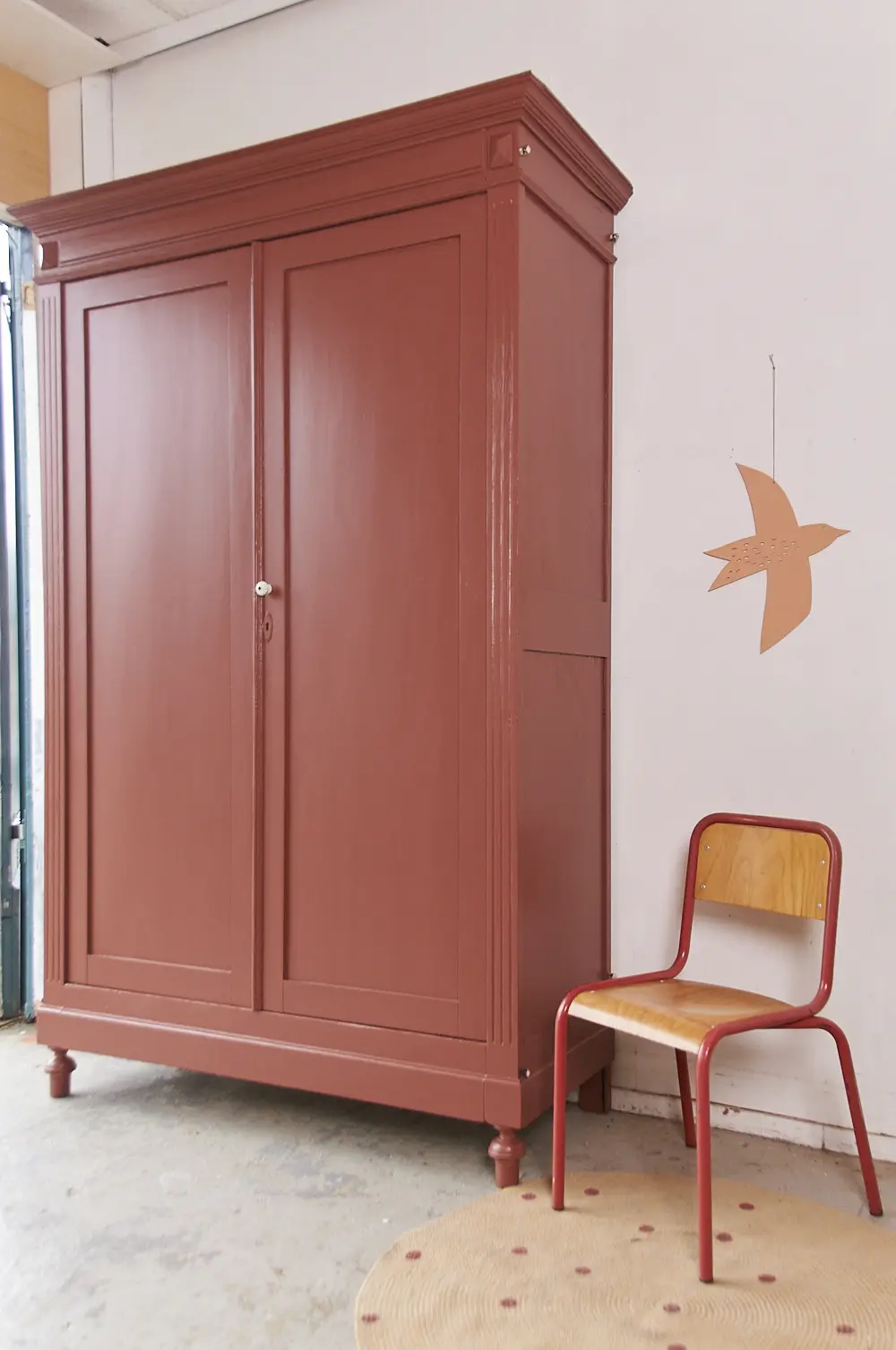 Wat een prachtige kast uit Belgie is dit! De paneel deuren vinden wij heel mooi, helemaal in combinatie met de kroon en de pootjes. Hier en daar een kleine beschadiging maar dat maakt de kast vintage. Alles zit weer stevig vast en de nodige reparaties zijn gedaan. Wij hebben de indeling aangepast, nu kan je er hang en leg kleding in kwijt. Boven aan de kast een plank over de hele breedte, daaronder links een roede en rechts 3 nieuwe planken. Uiteindelijk besloten wij hem deze fijne kleur te geven en hem af te werken met een porseleinen knop. De linker deur heeft 2 schuifjes en de rechter deur sluit door middel van een magneet. Kortom, deze kast is helemaal klaar voor een nieuwe plek!