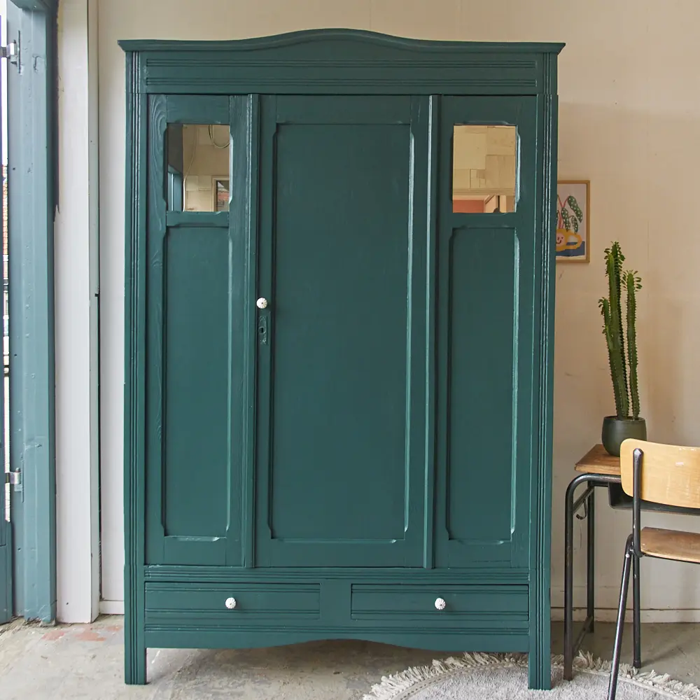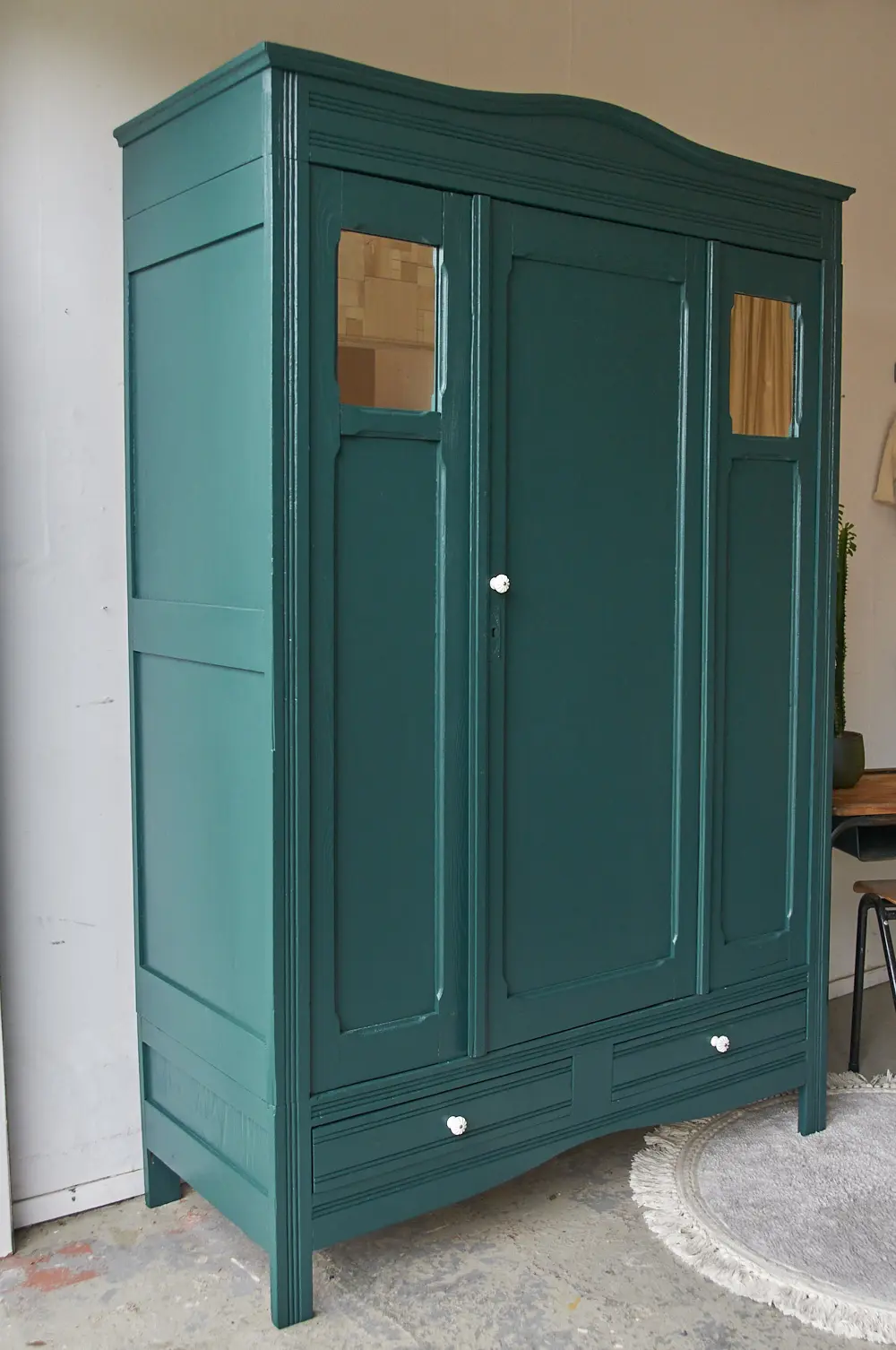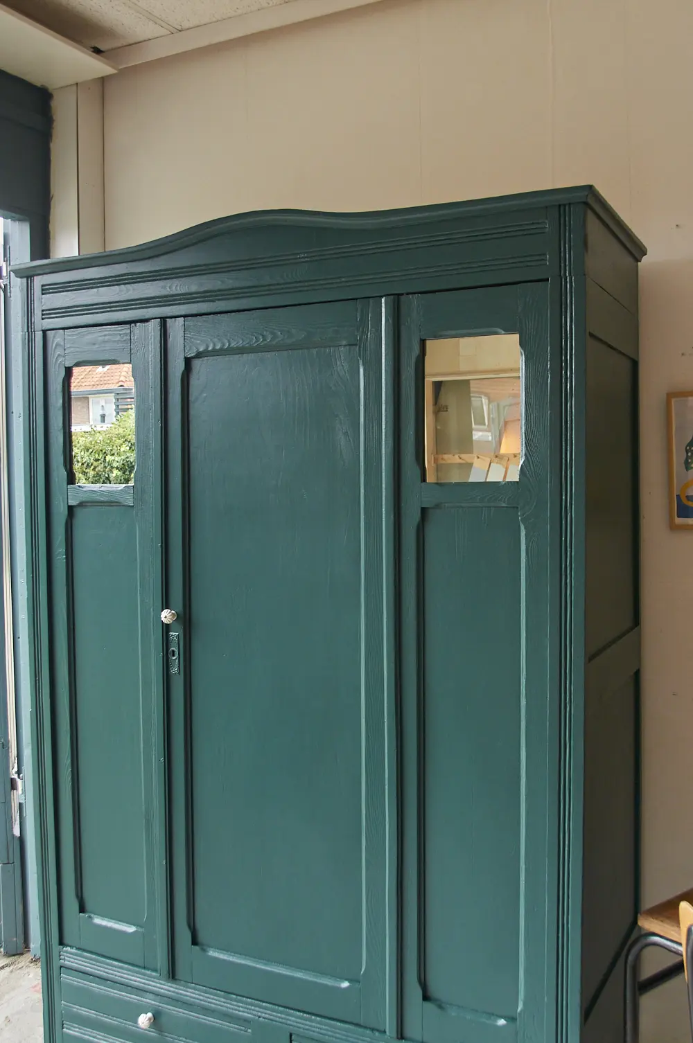 Wat een mooie demontabele kast. Wij hebben hem grondig schoongemaakt en behandeld tegen houtworm. Toen we de kast in elkaar hadden gezet begonnen we aan de nodige reparaties. Beide deurtjes kunnen weer open en dicht zonder dat ze klemmen. Vervolgens gingen we verder met de indeling. Wat een feestje, in deze kast kan je zoveel kleding kwijt, hang en leg! En het ziet er ook nog eens vrolijk uit. Het leek ons mooi deze kast een fijne groene kleur te geven, dus kozen we voor onze kleur ‘Amazone’. Wat een plaatje! Na het schilderwerk hebben we de spiegeltjes er terug in geplaatst en is de kast afgewerkt met porseleinen knoppen. Het linker deurtje sluit met een schuifje en de paneeldeur met een magneetje en nu is hij weer helemaal klaar voor een nieuwe plek!