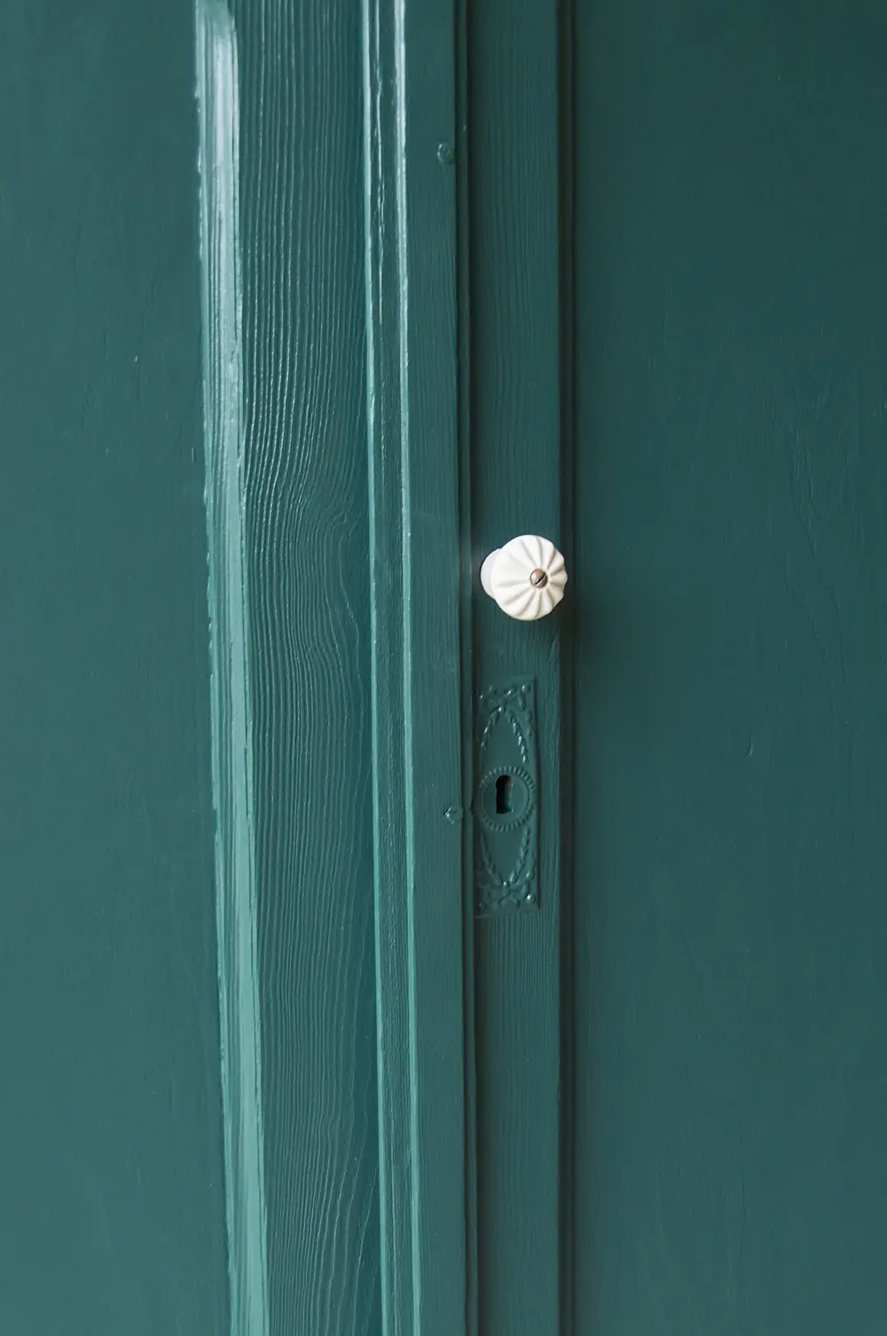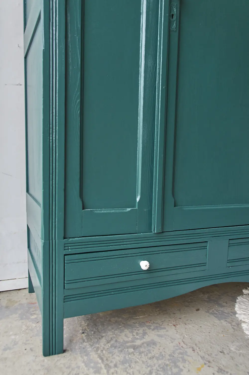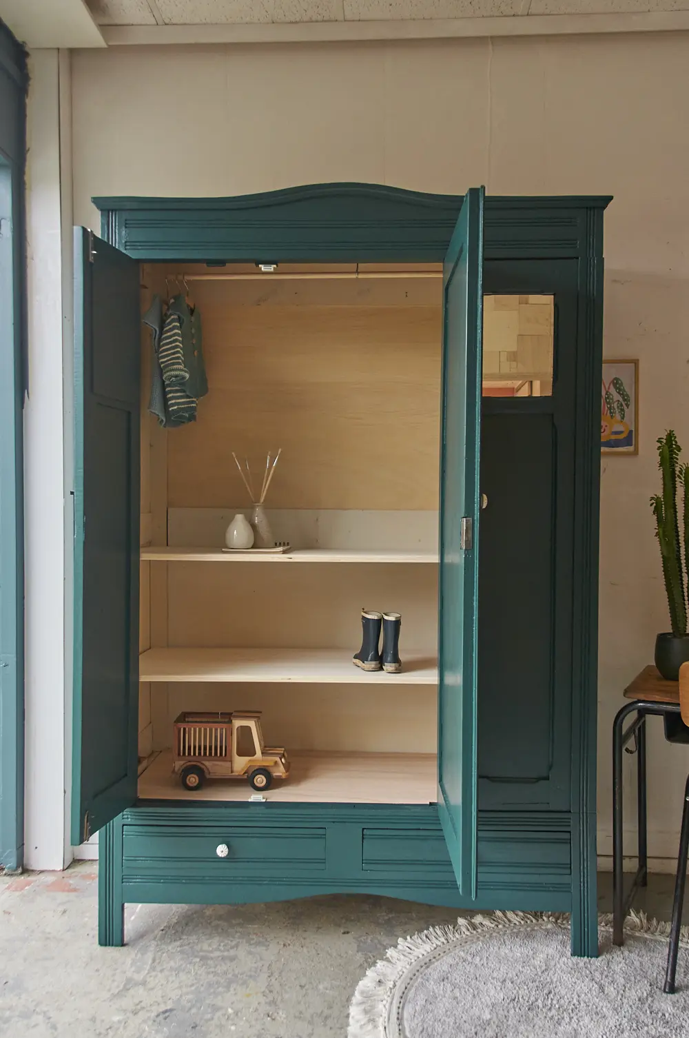 Wat een mooie demontabele kast. Wij hebben hem grondig schoongemaakt en behandeld tegen houtworm. Toen we de kast in elkaar hadden gezet begonnen we aan de nodige reparaties. Beide deurtjes kunnen weer open en dicht zonder dat ze klemmen. Vervolgens gingen we verder met de indeling. Wat een feestje, in deze kast kan je zoveel kleding kwijt, hang en leg! En het ziet er ook nog eens vrolijk uit. Het leek ons mooi deze kast een fijne groene kleur te geven, dus kozen we voor onze kleur ‘Amazone’. Wat een plaatje! Na het schilderwerk hebben we de spiegeltjes er terug in geplaatst en is de kast afgewerkt met porseleinen knoppen. Het linker deurtje sluit met een schuifje en de paneeldeur met een magneetje en nu is hij weer helemaal klaar voor een nieuwe plek!