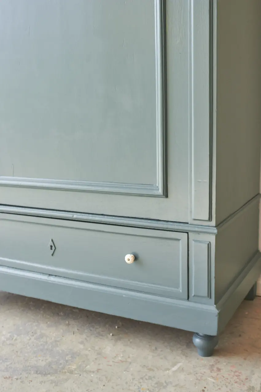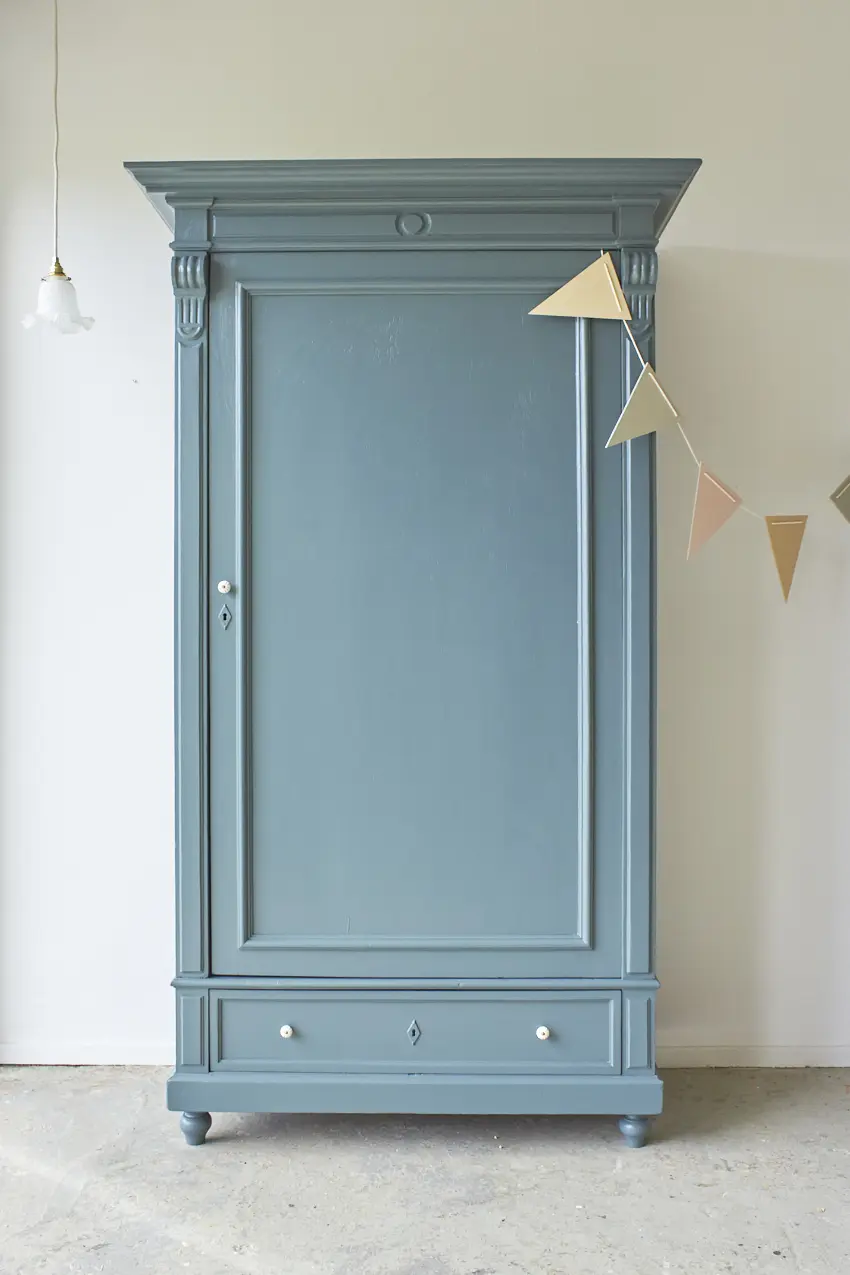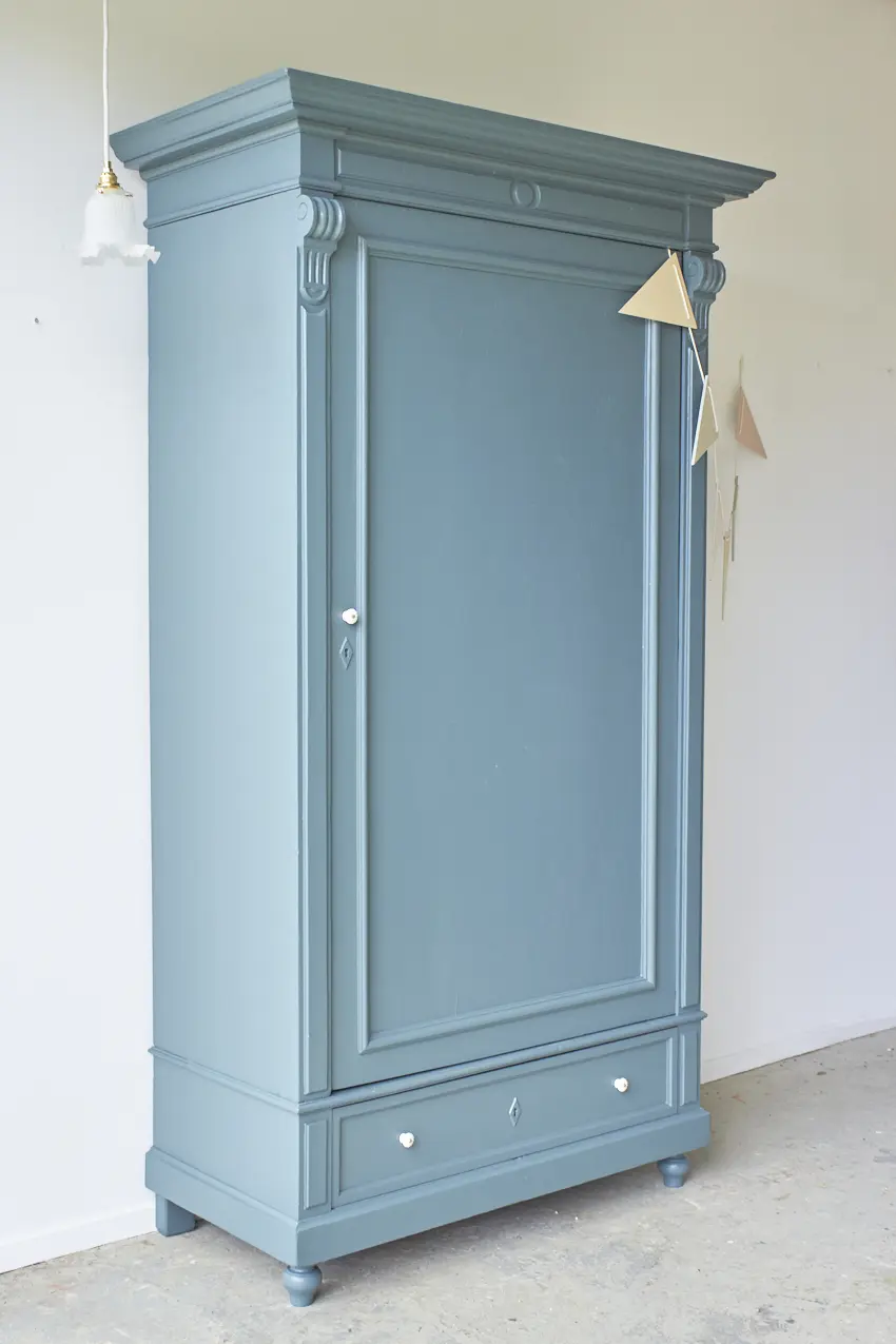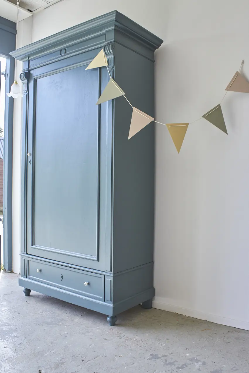 Na de grondverf laag hebben we hem geschilderd in onze kleur Klif. Een fijne kleur voor op de baby- of kinderkamer. Sommige mensen vinden het blauw, anderen meer groen. Wij vinden het meer naar blauw neigen, ja een hele mystieke warme blauw met een vleugje groen. Deze kleur geeft ieder meubel karakter. Hij is helemaal klaar voor een nieuwe plek!