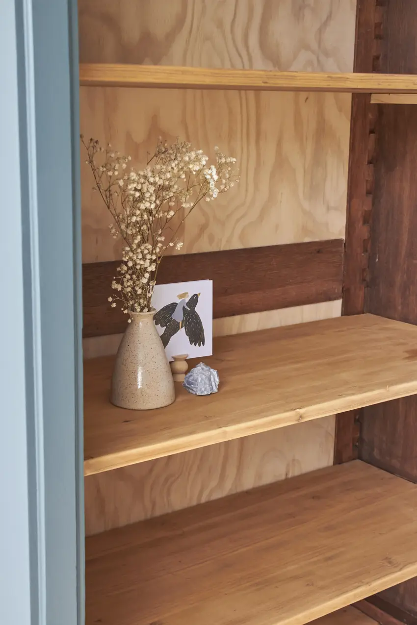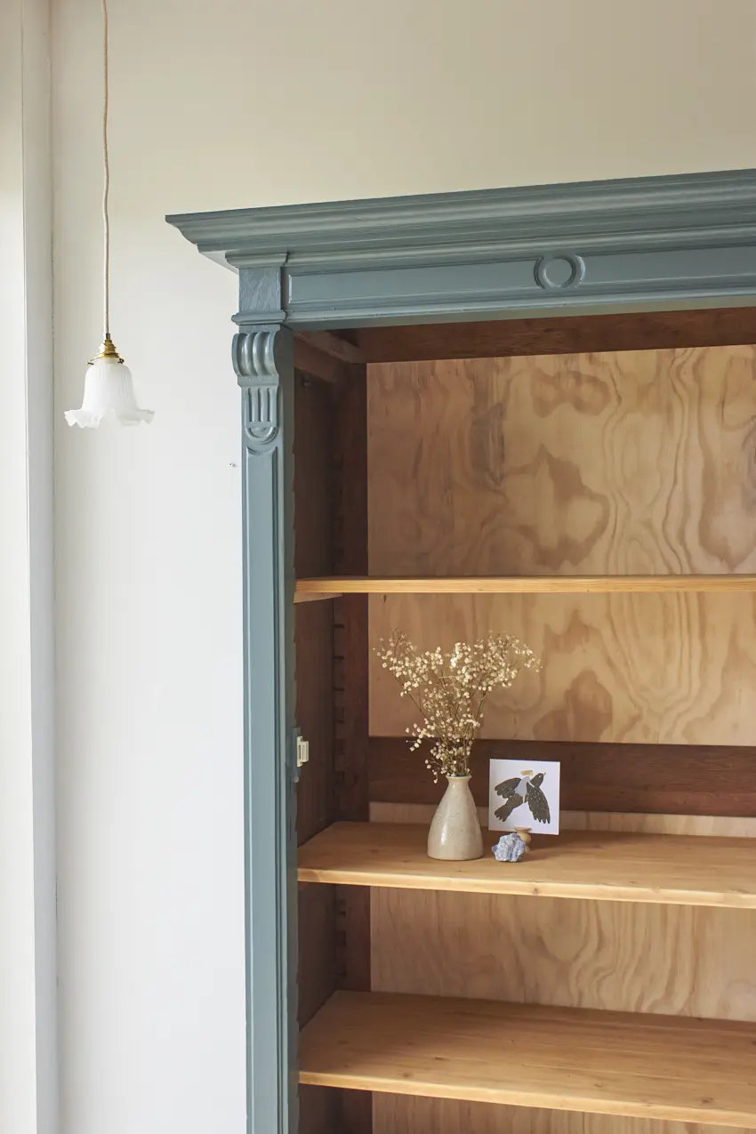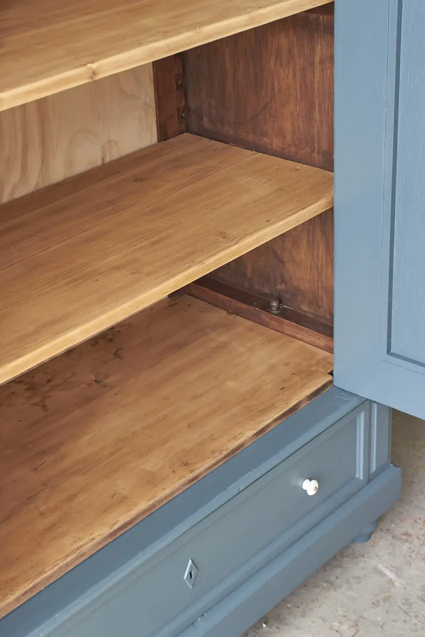 Toen deze kast binnenkwam was hij voorzien van een oude, donkere laag. Deze hebben we eraf laten halen door middel van zandstralen. Toen hij terug in onze werkplaats was, hebben we hem grondig schoongemaakt en behandeld tegen houtworm. We hebben hem nagelopen en gerepareerd waar nodig. De poten zijn nieuw net zoals de achterkant van de kast. De originele planken zijn origineel, fijn opgeschuurd en lekker stevig. Heel fijn is dat je zelf de hoogte kan bepalen van de planken. We kunnen er ook altijd nog een roede in maken als je dat wilt. De deur sluit met een magneetje.