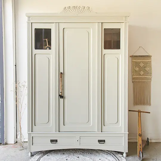 Wat een prachtige kast is dit, zo klassiek en zo uniek. Ze heeft een aantal hele mooie details, het houtsnijwerk, de ruitjes, de pootjes en de paneel deur. Een perfecte combinatie! Wij zijn allemaal verliefd op deze parel. De kast is volledig demontabel dus kan gemakkelijk een trap op. Wij hebben de kast grondig schoongemaakt en behandeld tegen houtworm. De kast heeft één deur. Aan weerszijden van de deur zitten dus geen deurtjes maar vaste panelen. Daarom hebben wij ook voor deze indeling gekozen, zo heb je alsnog genoeg hang- en legruimte, en kan je overal goed bij. Er is een kleine plank bovenin over de gehele breedte, rechts drie planken en links een roede haaks. De lades zijn lekker ruim maar klemde, wij hebben dit kunnen verhelpen, heel fijn! De deur sluit door middel van een magneetje. Uiteindelijk kozen wij ervoor de kast in onze kleur linnen te schilderen en hem af te werken met een bronzen knop. Linnen is een fijne, lichte neutrale kleur, een mix van heel licht grijs en beige. Omdat het zo’n rustige en makkelijke kleur is kun je Linnen heel goed combineren met een druk behang of veel andere kleuren. En nu is hij helemaal klaar voor een nieuwe plek!