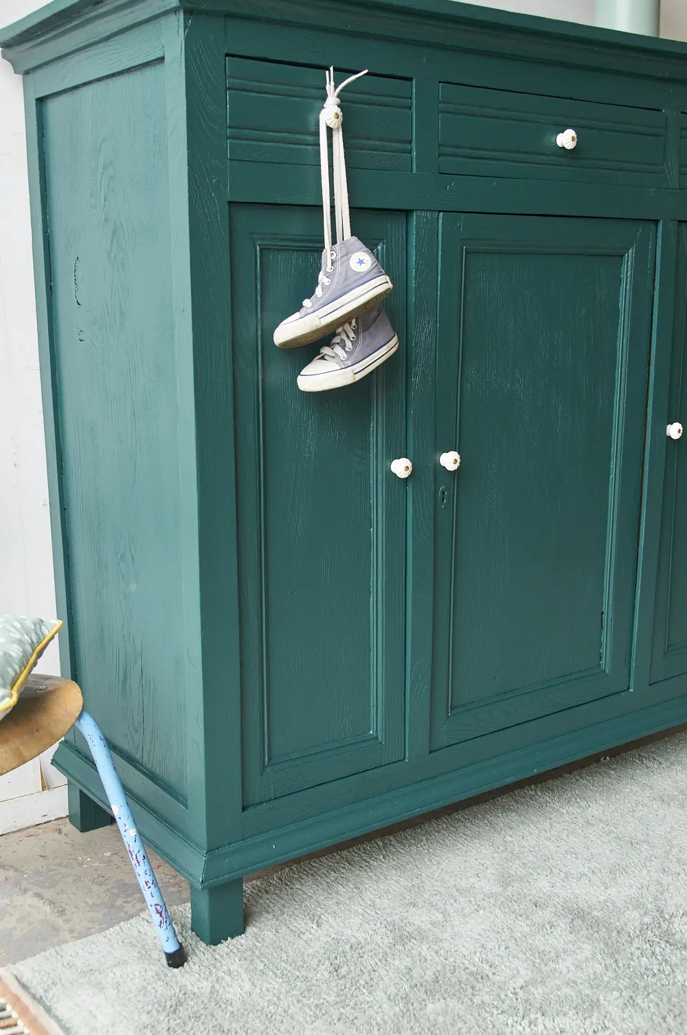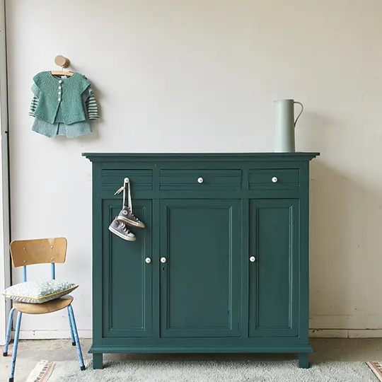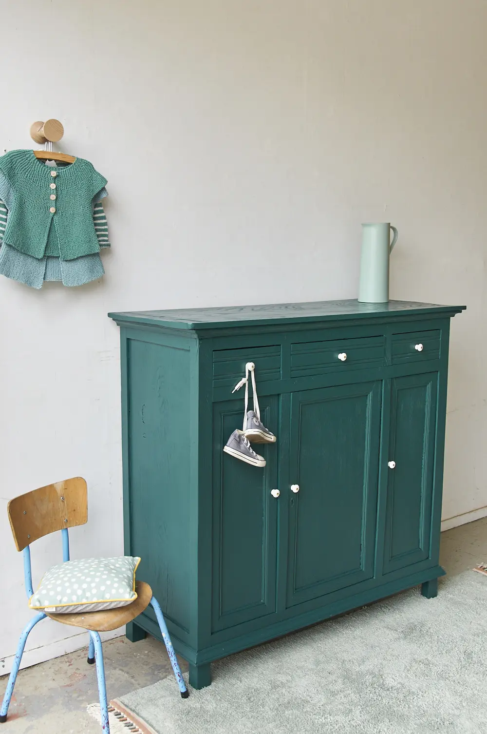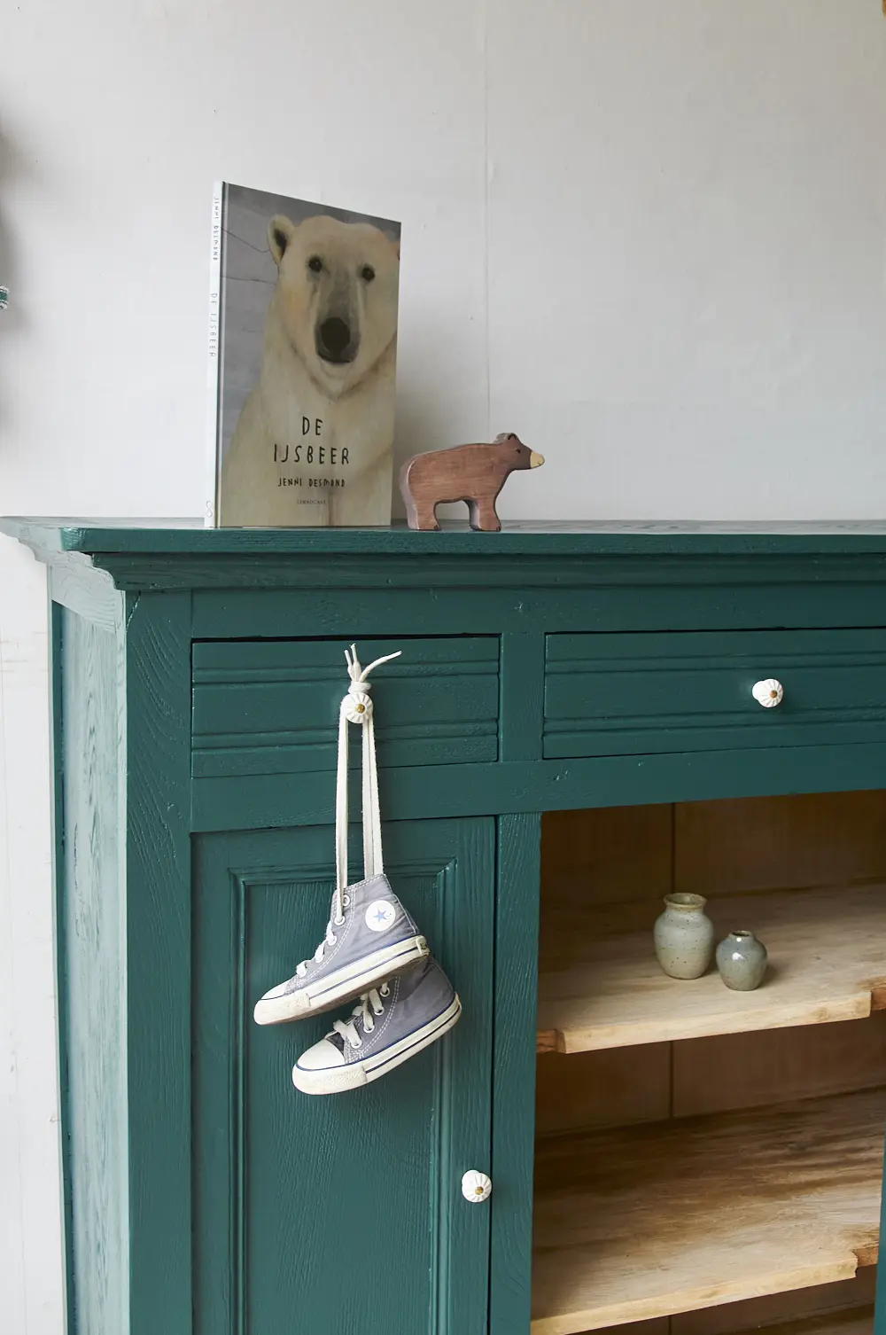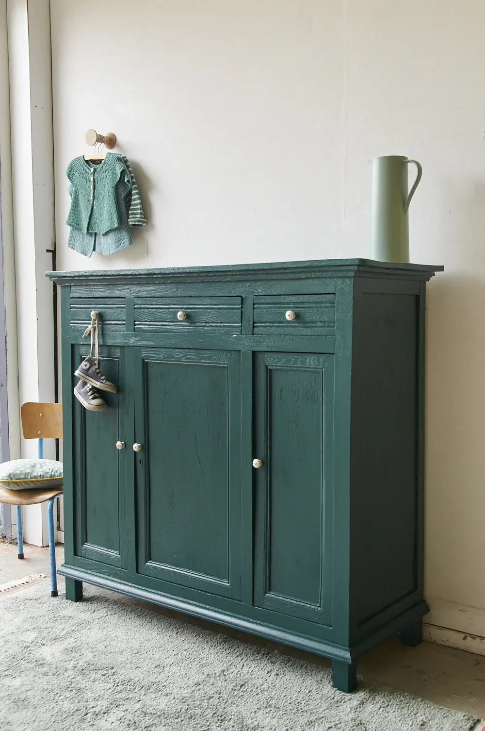 Dit kastje kan overal in het huis staan, in de woonkamer, in de hal of natuurlijk op de kinderkamer. Ideaal! Na het zandstralen kreeg deze kast een grondige schoonmaakbeurt en hebben wij hem vervolgens behandeld tegen houtworm. De indeling is orgineel en licht opgeschuurd, de deuren hebben wij weer goed terug gehangen en de lades gaan soepel open en dicht. Na de grondverf besloten wij hem in deze mooie groene kleur te schilderen, amazone. De deurtjes sluiten door middel van een magneetje. De kast hebben wij afgewerkt met porseleine knopjes en nu is dit kastje weer helemaal klaar voor gebruik! Fijn voor spelletjes of knutselspullen.
