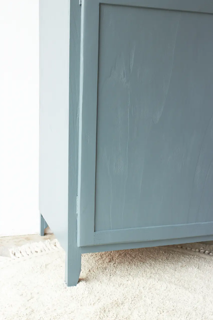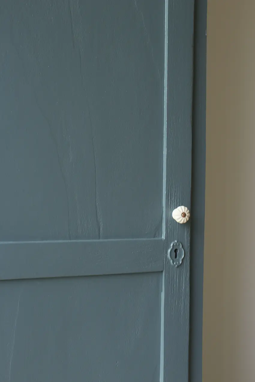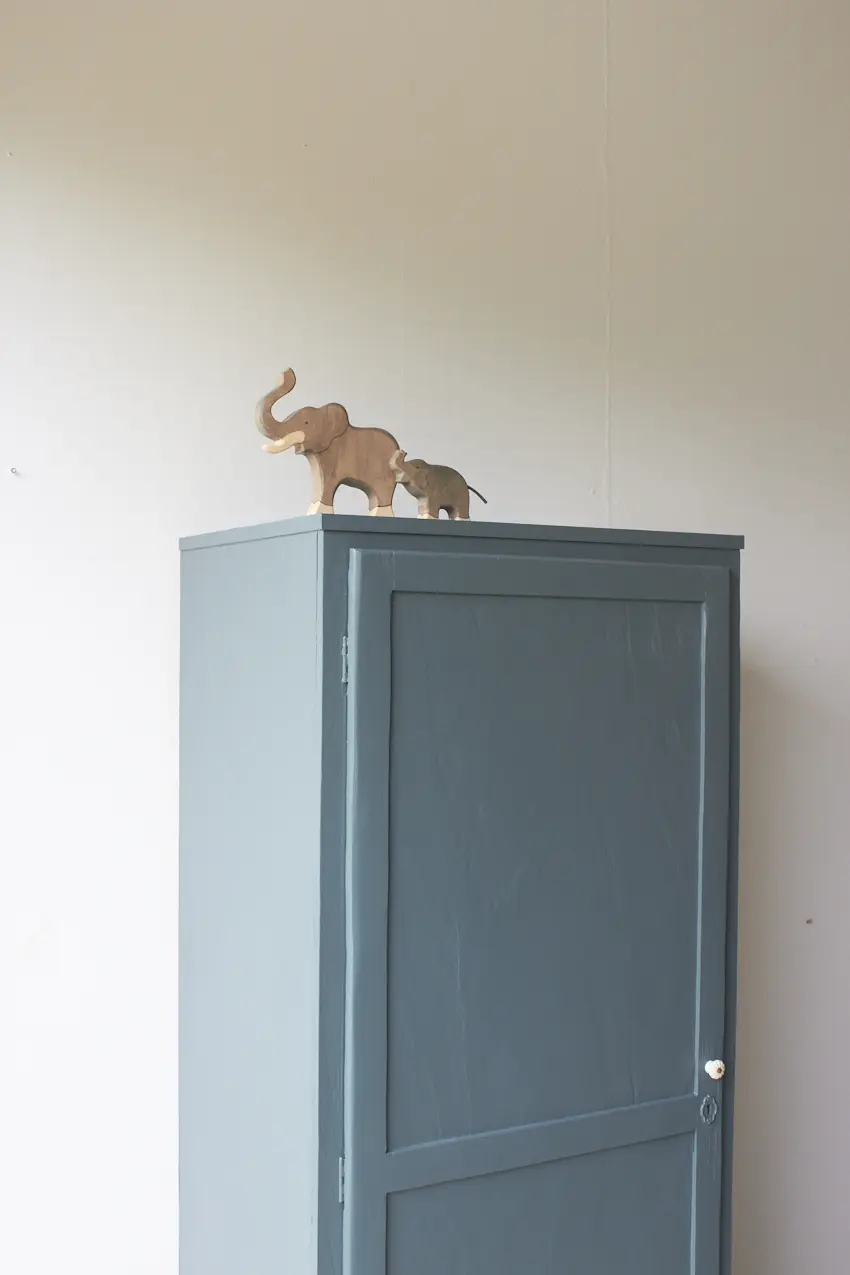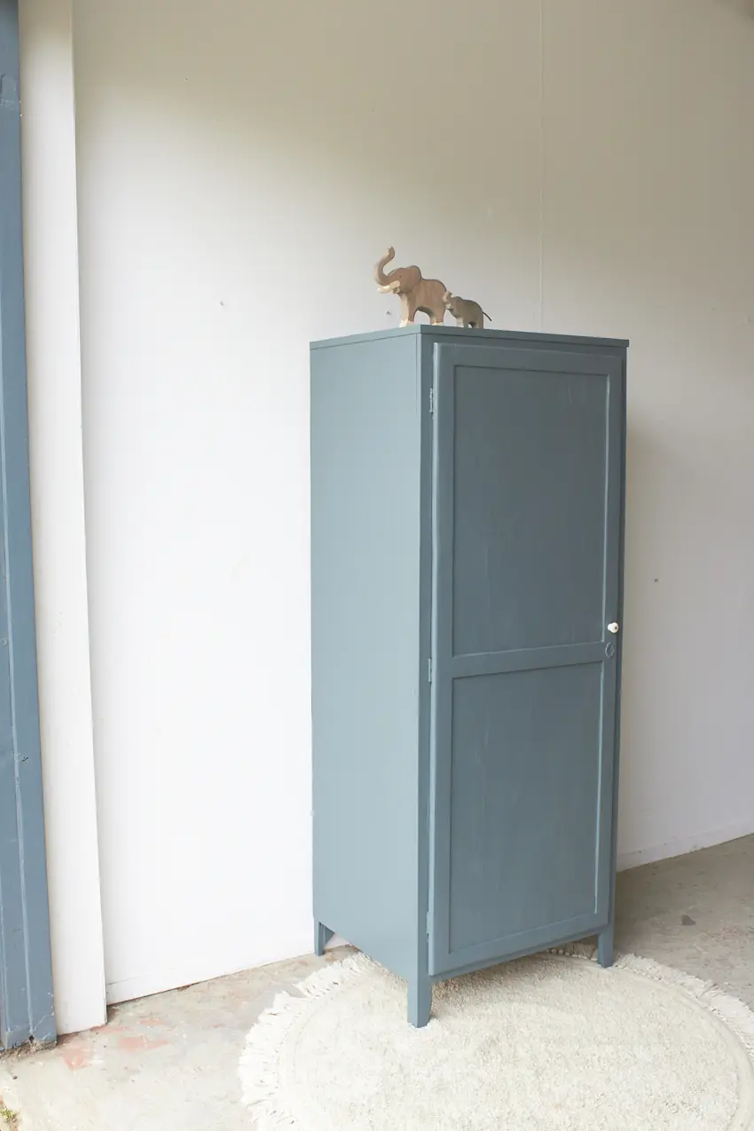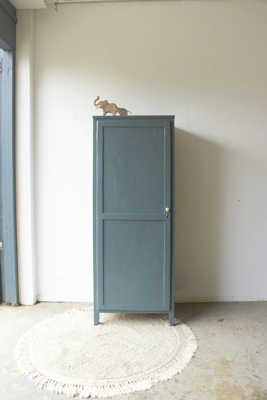 Na de grondverf laag hebben we hem geschilderd in onze kleur Klif. Een leuke kleur voor op de baby- of kinderkamer. De porseleinen knop maakt hem helemaal af in combinatie met het lieve vintage sleutelplaatje. Hij is helemaal klaar voor een nieuwe plek!