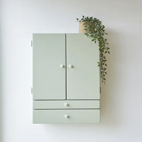 Wauw, wat een lief hangkastje is dit! Hangkastjes zoals deze hebben we niet vaak, maar als we ze wel binnen krijgen kunnen we niet wachten om er mee te beginnen. Toen dit kastje binnenkwam zijn we er daarom ook meteen mee aan de slag gegaan. Wat een leuke binnenkant met de deurtjes met daarachter de verschillende vakjes en de twee lades! Echt een verrassing als je de deurtjes opent. We hebben dit hangkastje goed schoongemaakt met een sopje. Oorspronkelijk had hij een creme-achtige kleur, deze hebben we er goed afgeschuurd. Aan de binnenkant zaten glazen plankjes en panelen voor de schappen. Deze waren in niet zo’n goede staat, dus deze hebben we vervangen voor nieuwe houten plankjes. Hier en daar zaten aan de buitenkant wat beschadigingen, dus deze hebben we gerepareerd. Ook de lades hebben we goed geschuurd, waardoor ze nu weer gemakkelijk open en dicht gaan. Bovenin hebben we drie ophanghaakjes geplaatst, waarmee je dit hangkastje stevig kunt bevestigen aan de muur. Beide deuren sluiten met magneetjes en porseleinen knoppen. We hebben hem in onze kleur Artisjok geschilderd, een zachte, toegankelijke kleur. Wat een goede keuze! Nu is het een fijn hangkastje voor in de baby- of kinderkamer, voor tekeningen, edelstenen en andere schatten. Maar ook in de hal voor handschoenen en sleutels. En achter de schapjes is er genoeg plek voor brieven en kaartjes. Wat een leukerd!