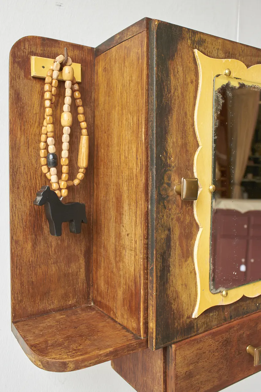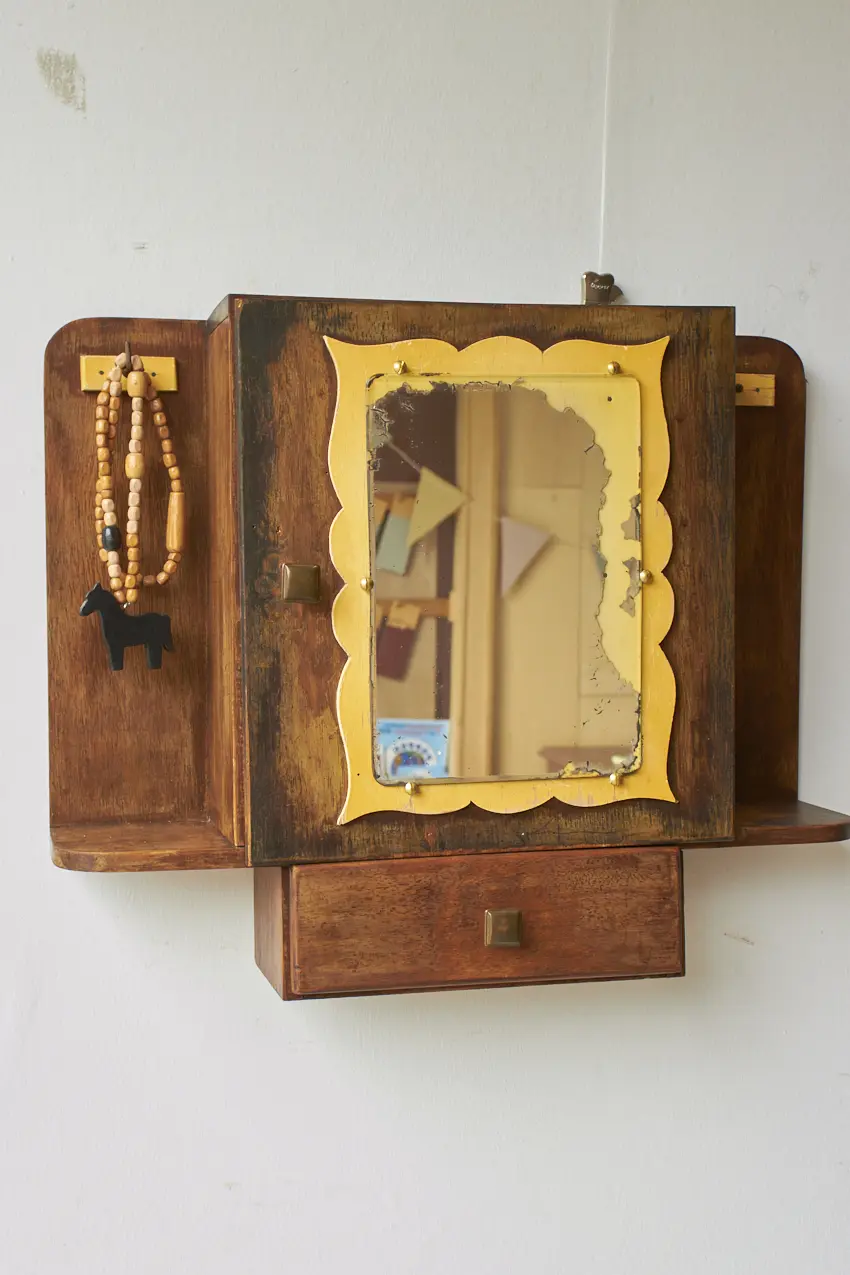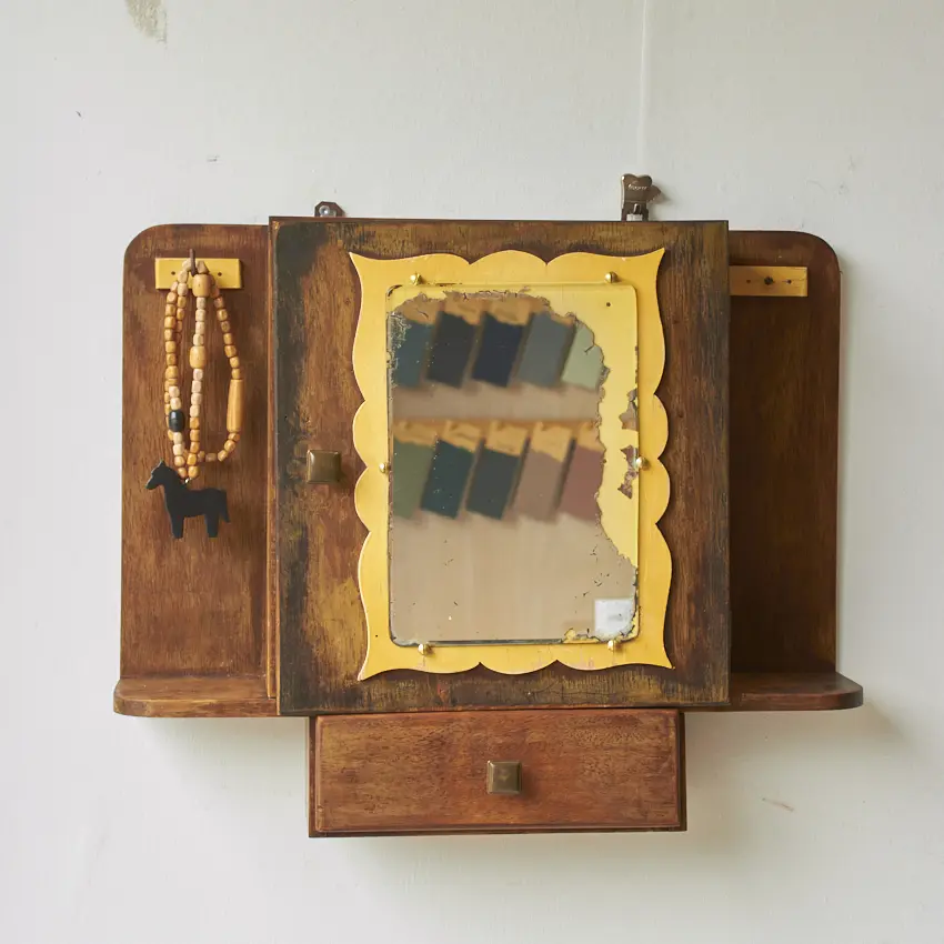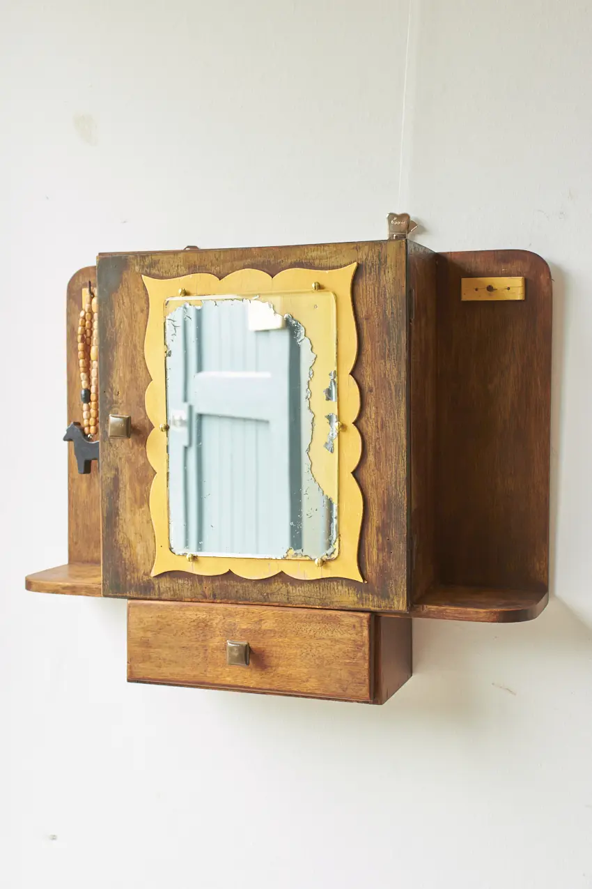 Dit hangkastje is zo uniek met zijn gele versiering achter en rondom de spiegel. En heb je de originele knopjes al gezien? Wat een leukerd!