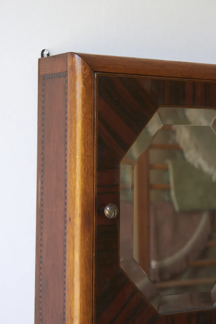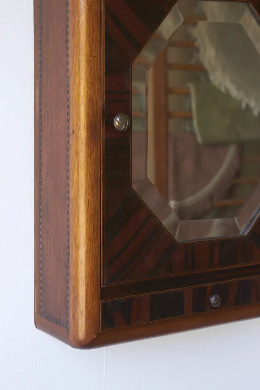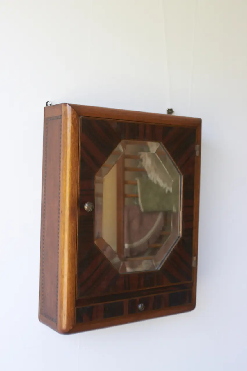 Dit hangkastje heeft een 8 hoekig spiegeltje. Zo mooi samen met de verschillende hout soorten. Het kastje is goed schoongemaakt en behandeld tegen houtworm. En nu is hij weer helemaal klaar voor een nieuwe plek!