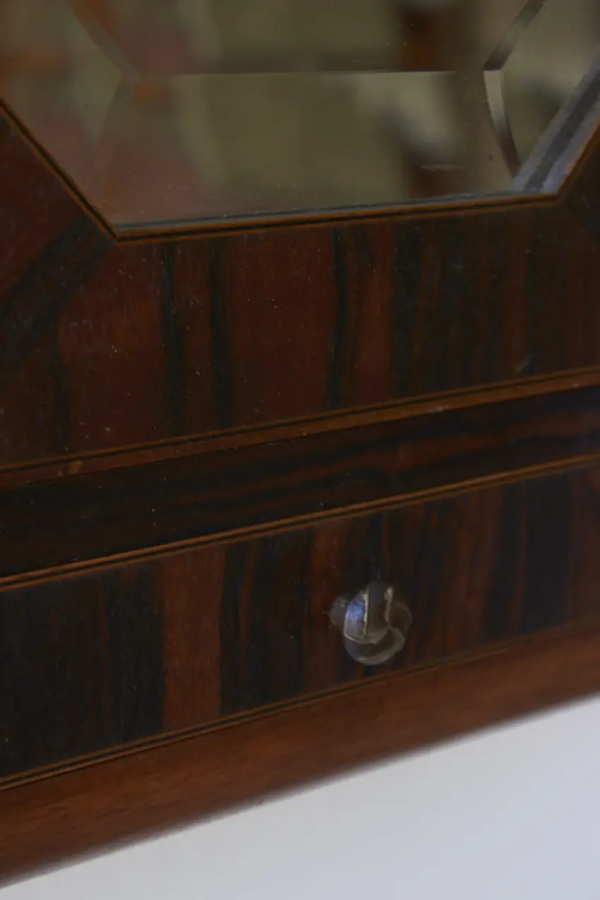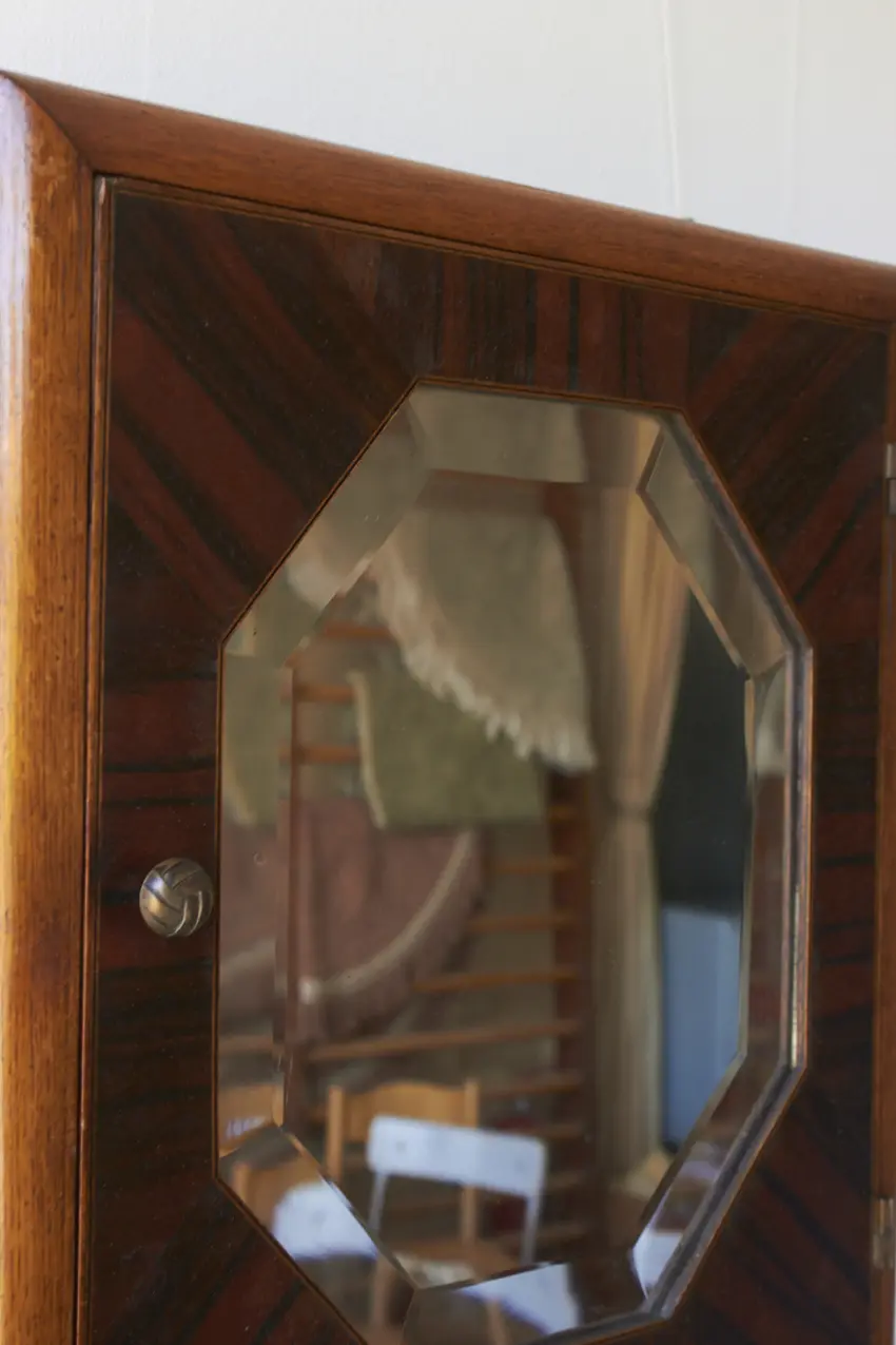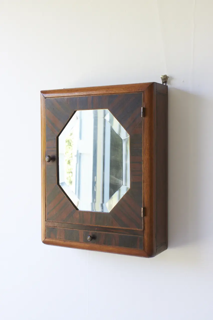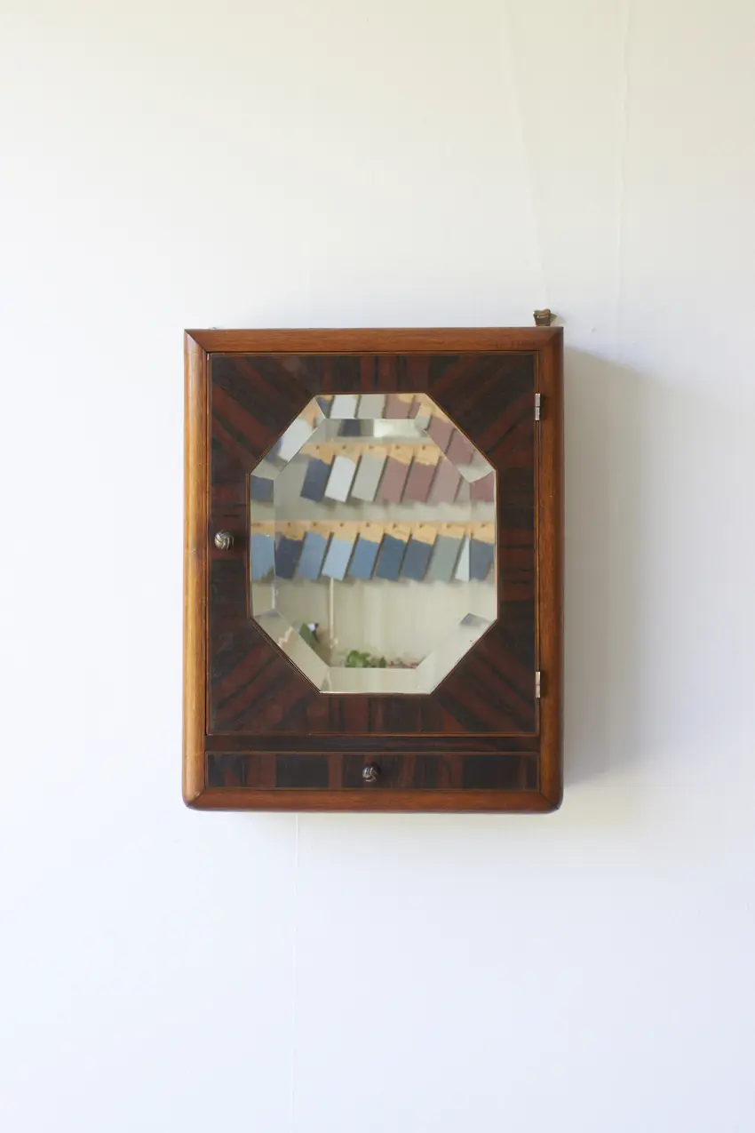 Dit hangkastje heeft een 8 hoekig spiegeltje. Zo mooi samen met de verschillende hout soorten. Het kastje is goed schoongemaakt en behandeld tegen houtworm. En nu is hij weer helemaal klaar voor een nieuwe plek!