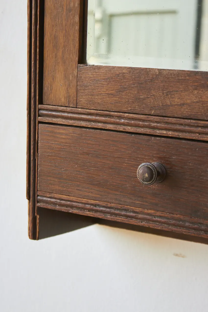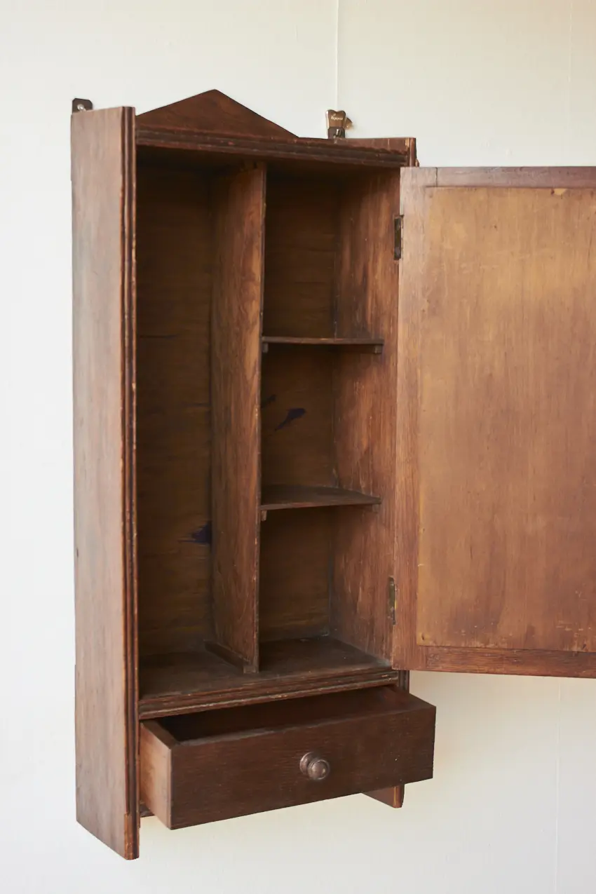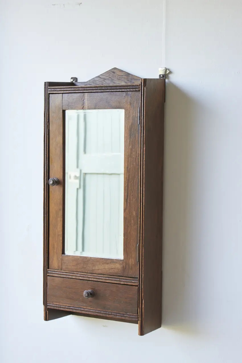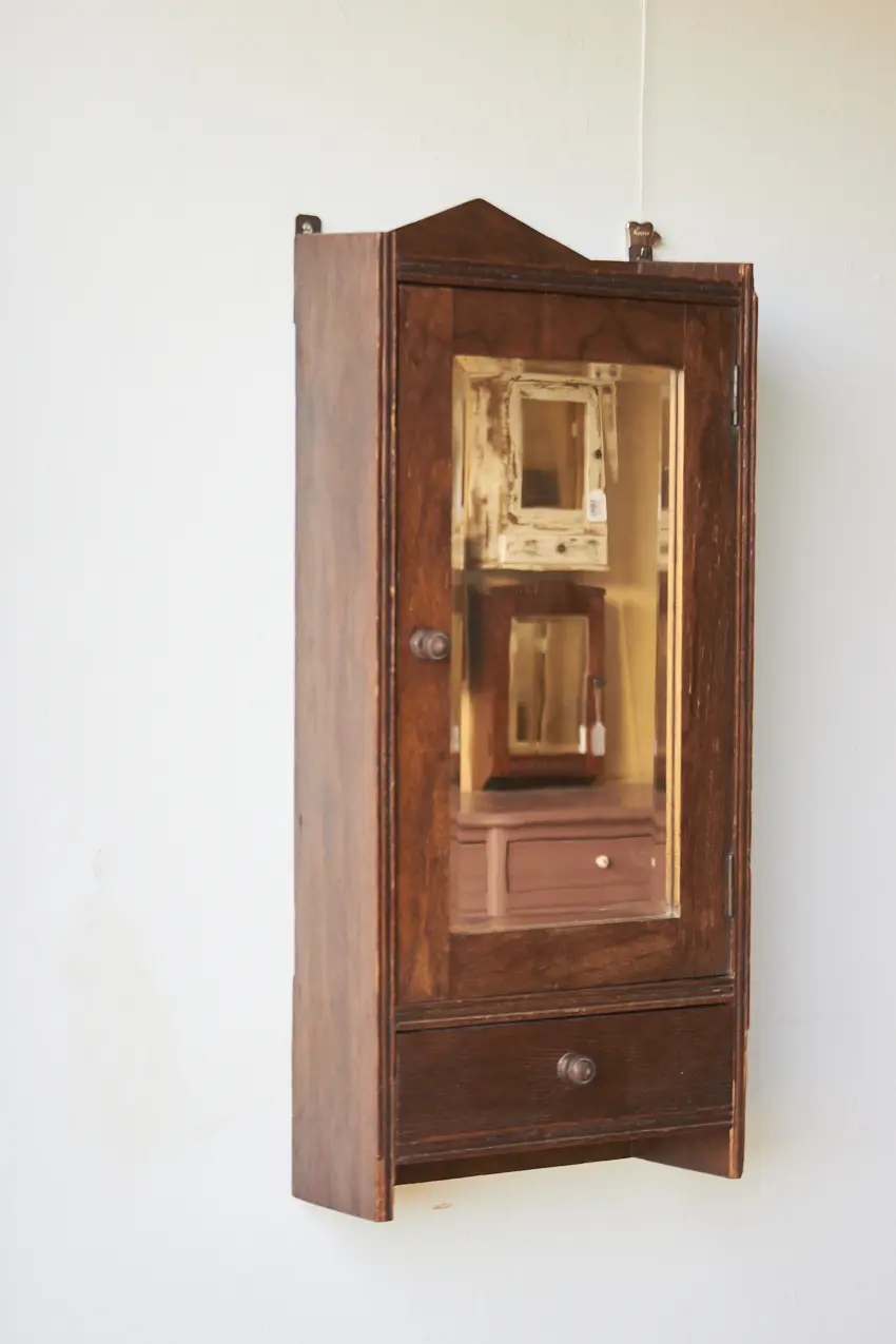 Dit mooie hangkastje heeft een spiegel en een kleine lade. Het kastje is goed schoongemaakt en behandeld tegen houtworm. Klaar voor een nieuwe plek!