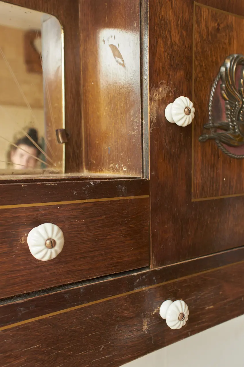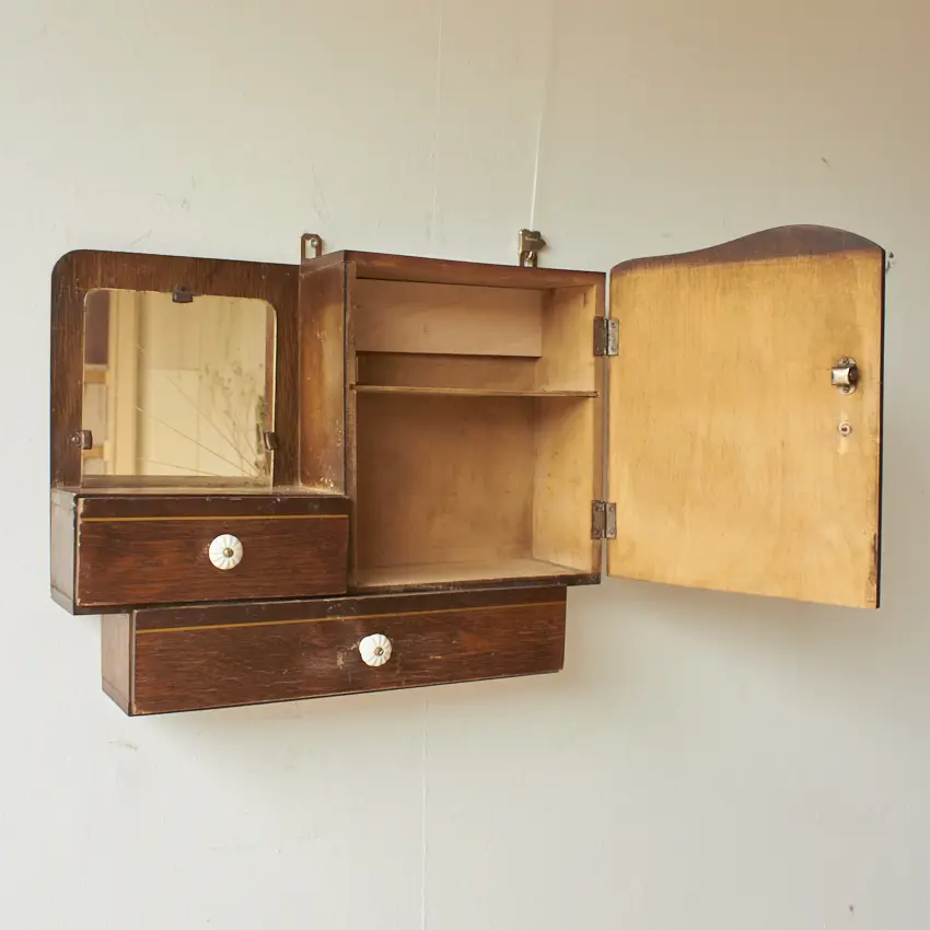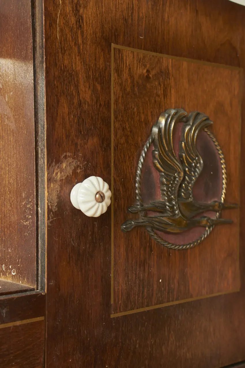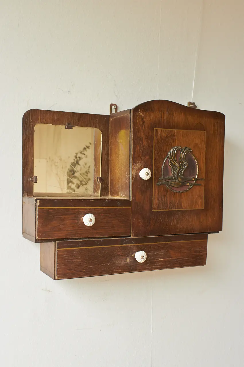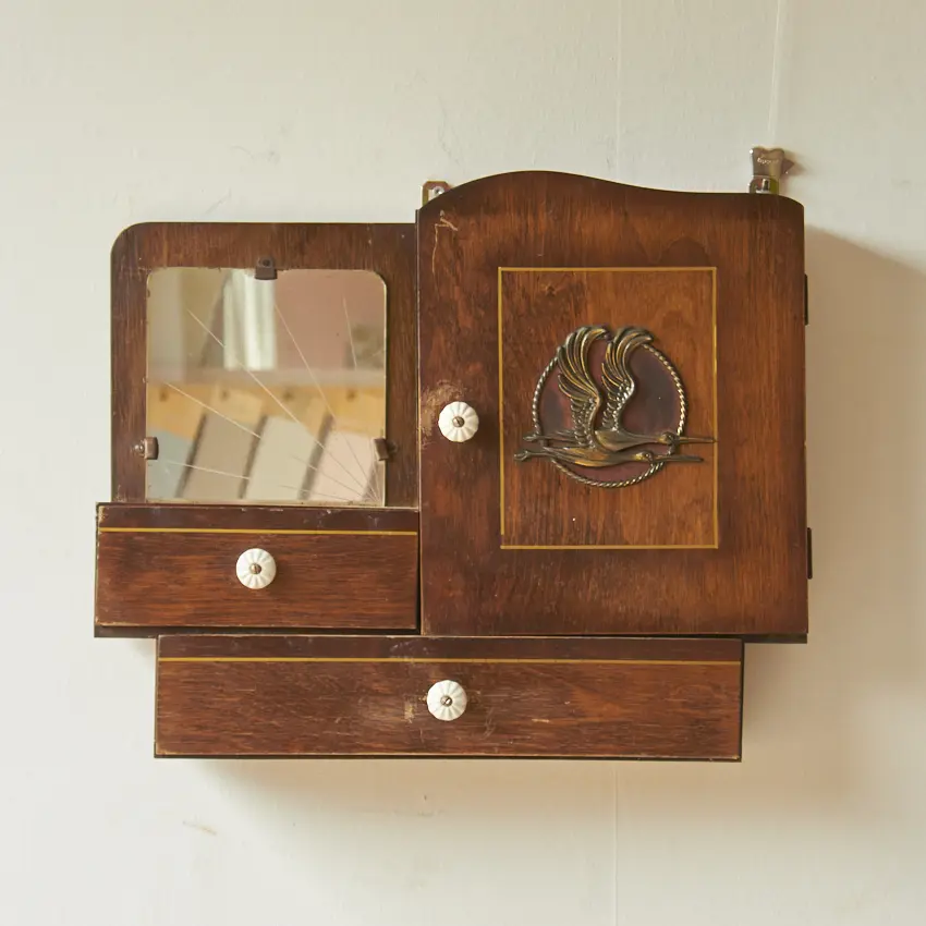 Dit unieke kastje heeft een mooie donkere kleur, twee lades en een lief spiegeltje. Zo leuk de vogels op het deurtje.