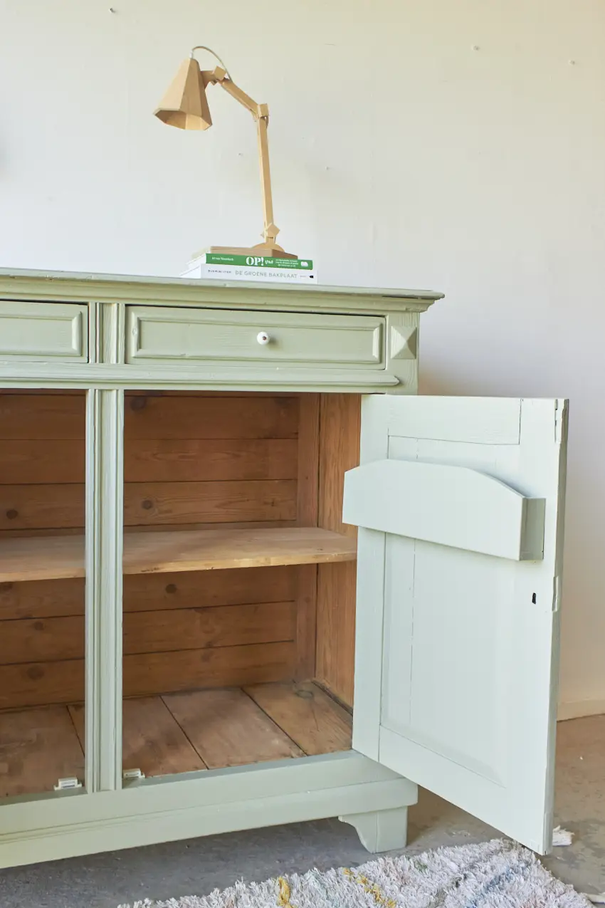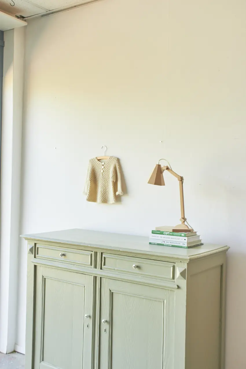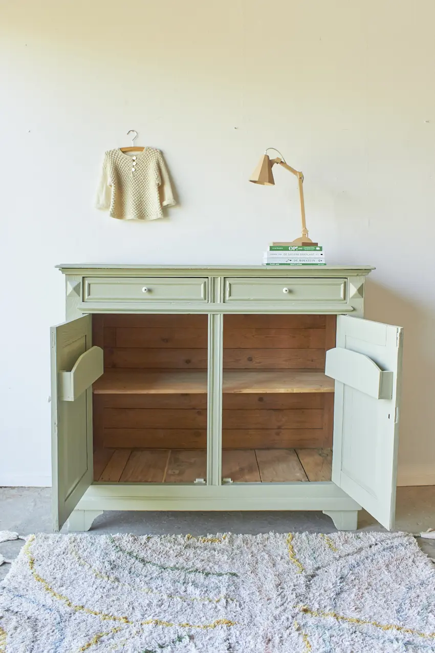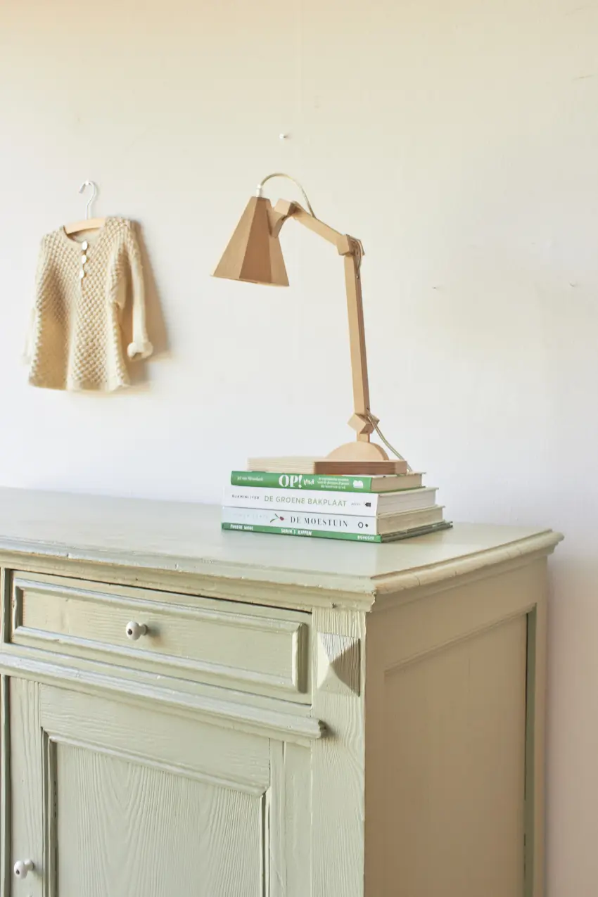 Na alle reparaties hebben we gekozen voor onze kleur Artisjok. Een frisse, groene tint die al lang in ons Firma Zoethout kleurenassortiment zit en waar we dol op zijn. Hij is zacht, toegankelijk en heel fijn te combineren met andere tinten, zoals onze kleur Rozemarijn of onze lichte kleur Linnen. Wat staat het hem mooi! De porseleinen knopjes maken hem helemaal af. Dat fijne vloerkleed is ook bij ons te koop net zoals de prachtige houten lamp, gemaakt door Henk.