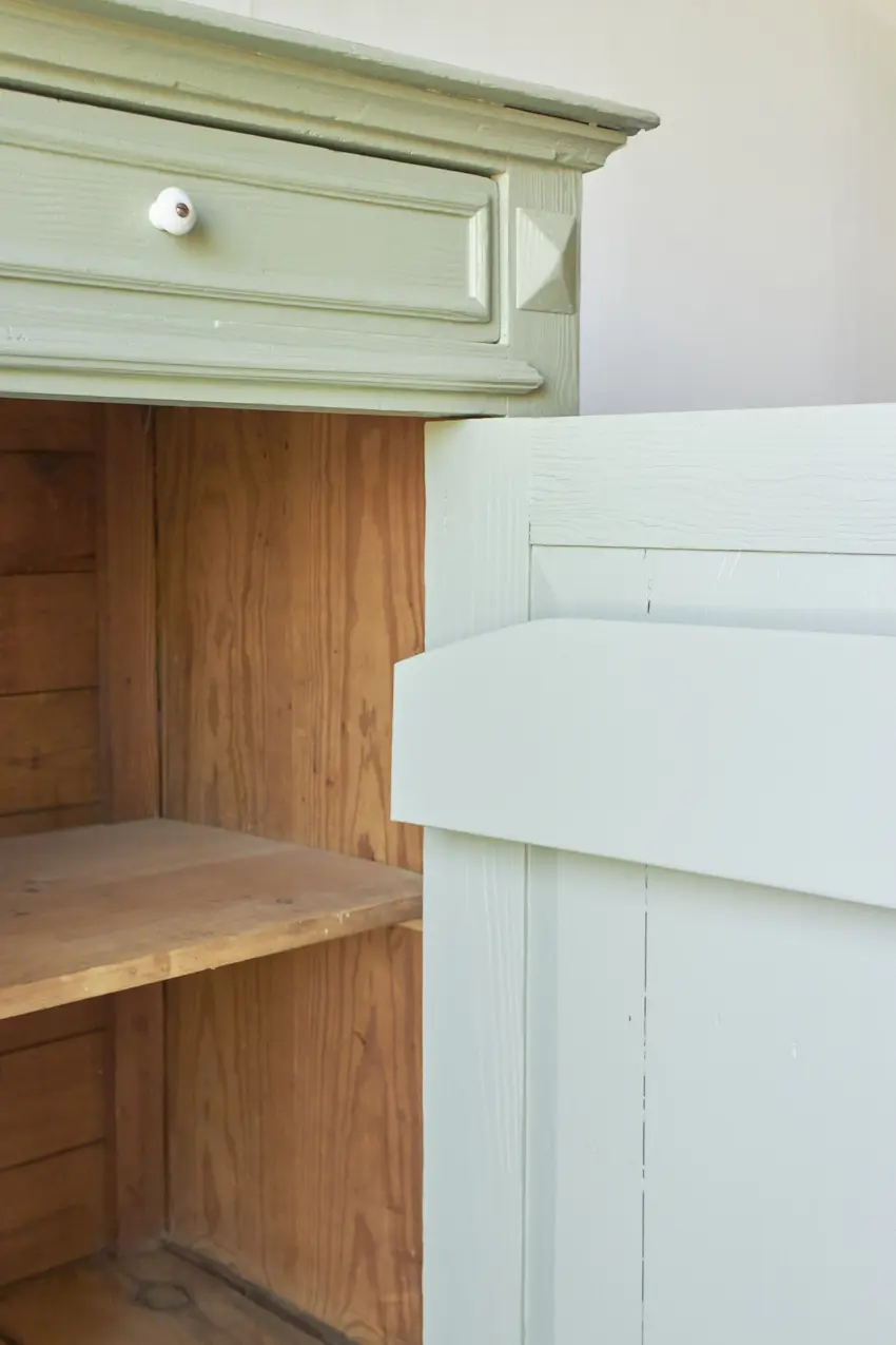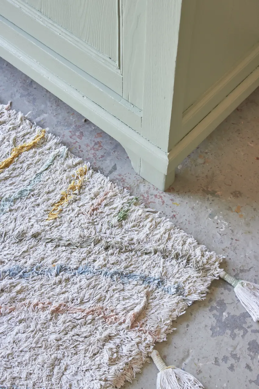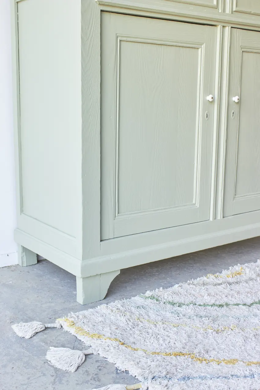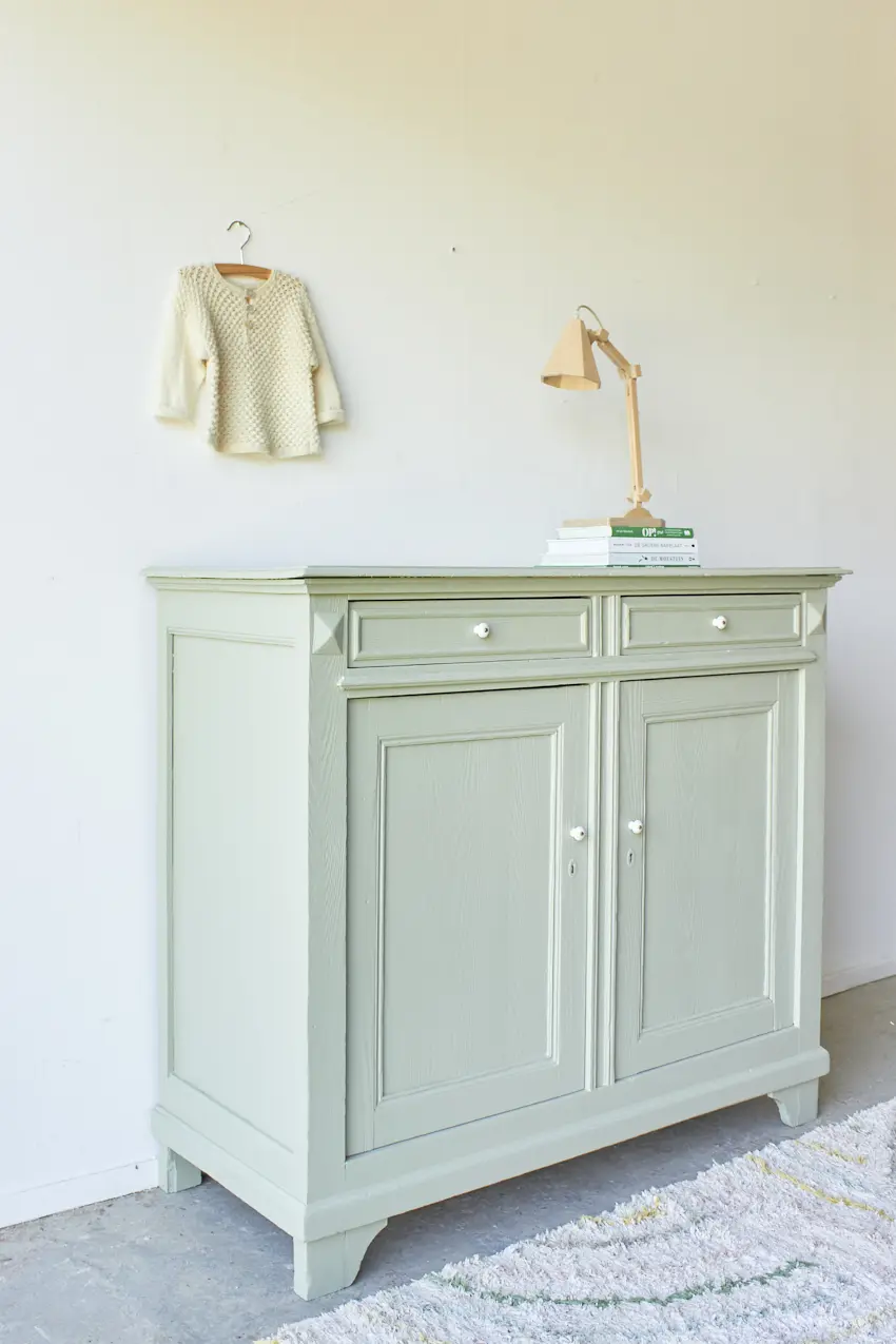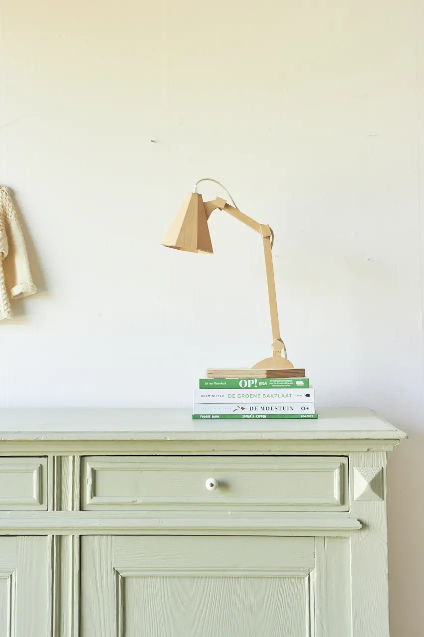 Na alle reparaties hebben we gekozen voor onze kleur Artisjok. Een frisse, groene tint die al lang in ons Firma Zoethout kleurenassortiment zit en waar we dol op zijn. Hij is zacht, toegankelijk en heel fijn te combineren met andere tinten, zoals onze kleur Rozemarijn of onze lichte kleur Linnen. Wat staat het hem mooi! De porseleinen knopjes maken hem helemaal af. Dat fijne vloerkleed is ook bij ons te koop net zoals de prachtige houten lamp, gemaakt door Henk.