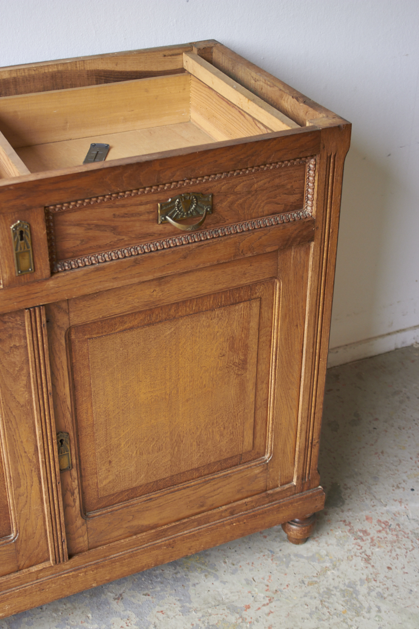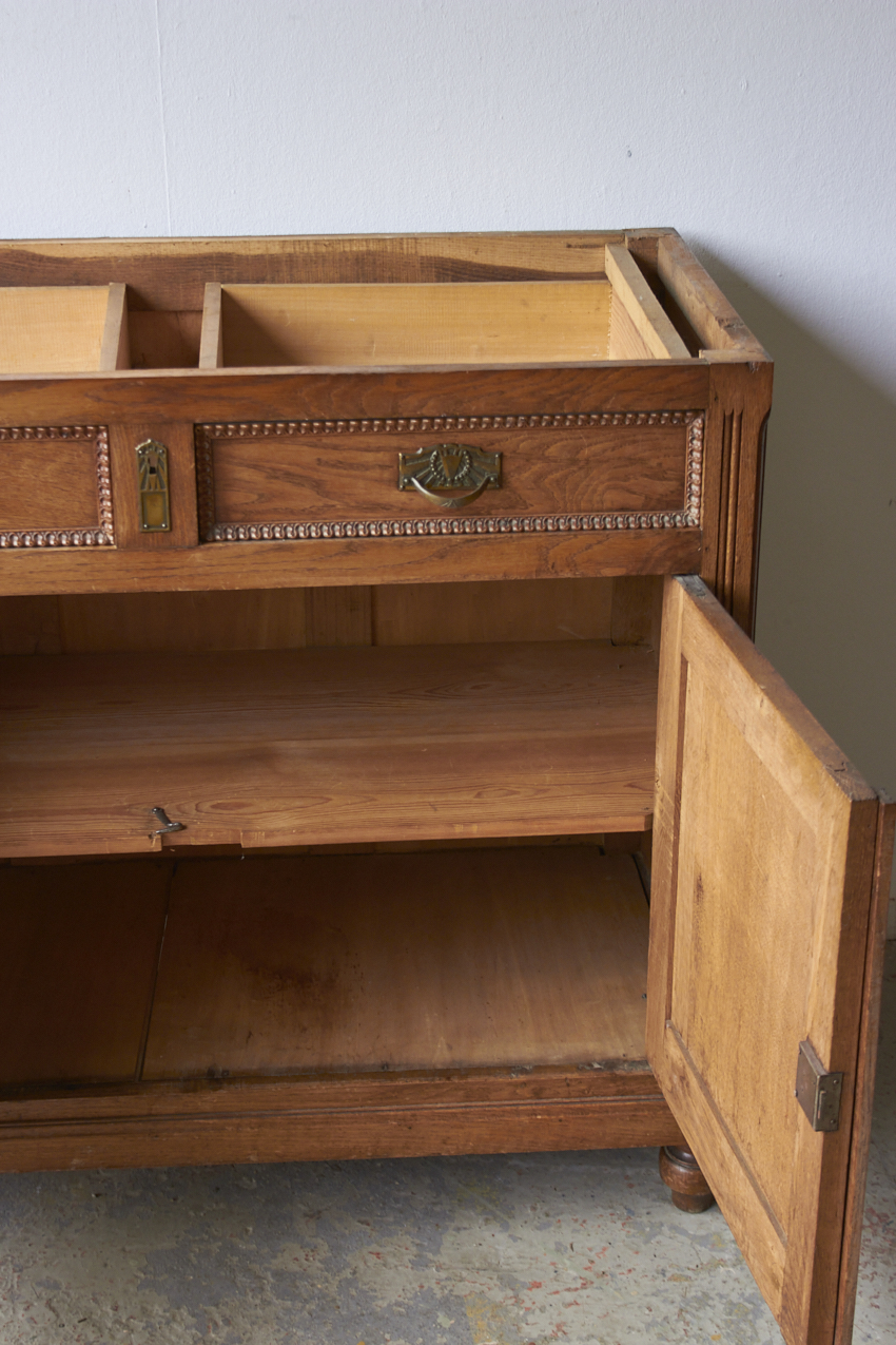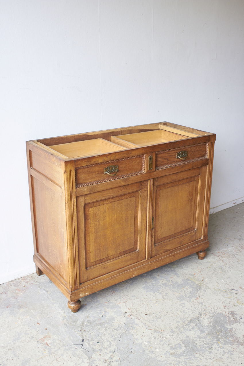 Dit vintage meubel (nu nog zonder blad) is met zijn paneeldeuren een ideale commode. Een perfect meubel voor op de kinderkamer of als blikvanger in de woonkamer. Deze maat kan natuurlijk ook goed als fijne opbergkast in de hal, bijkeuken of op kantoor. De kast heeft twee kleine lades en achter de deurtjes is voldoende opbergruimte.