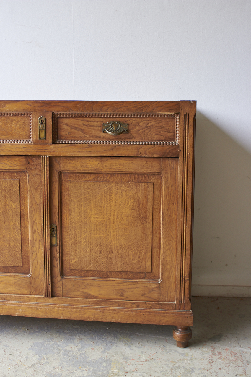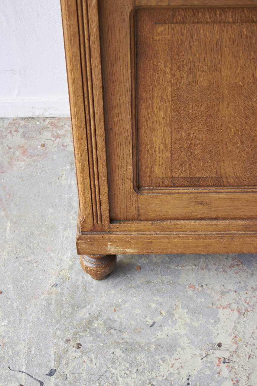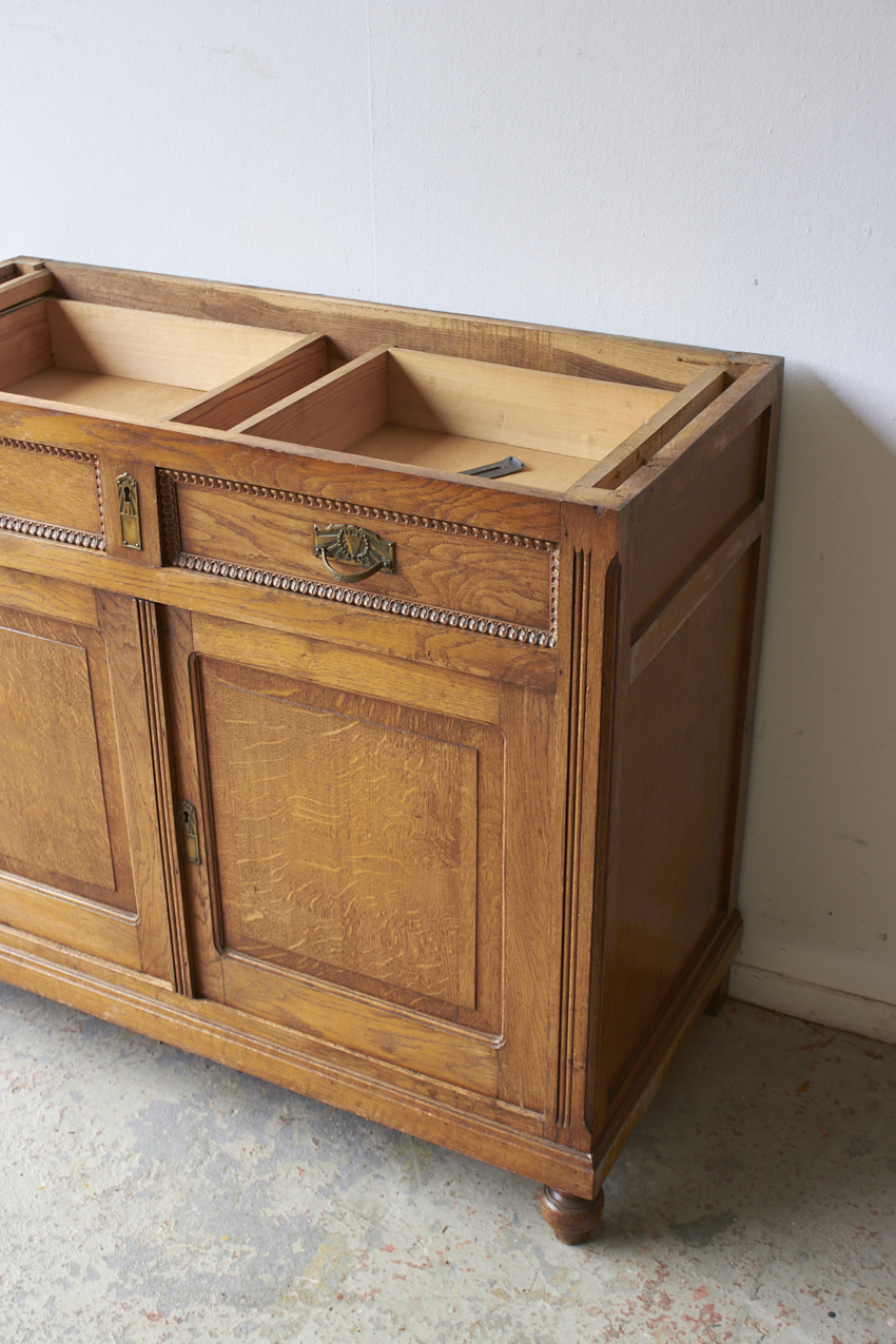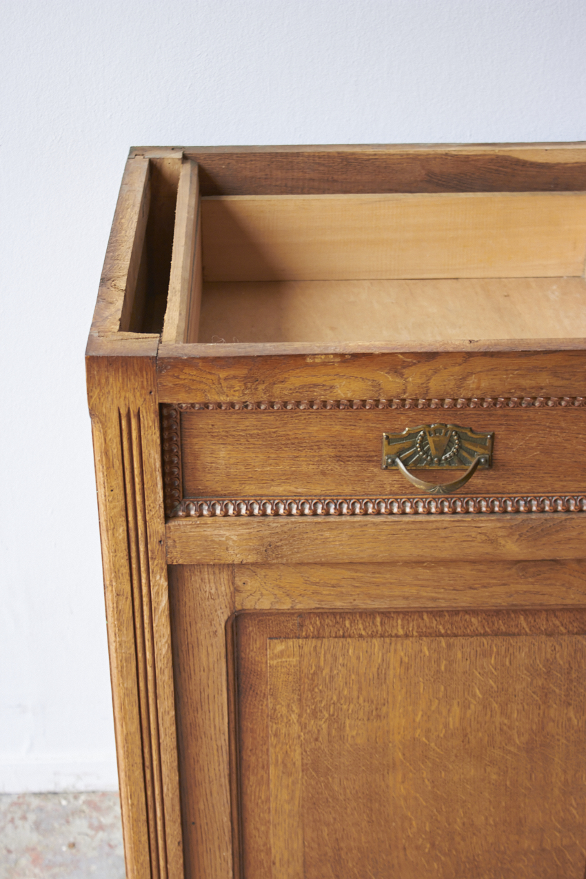 Dit vintage meubel (nu nog zonder blad) is met zijn paneeldeuren een ideale commode. Een perfect meubel voor op de kinderkamer of als blikvanger in de woonkamer. Deze maat kan natuurlijk ook goed als fijne opbergkast in de hal, bijkeuken of op kantoor. De kast heeft twee kleine lades en achter de deurtjes is voldoende opbergruimte.