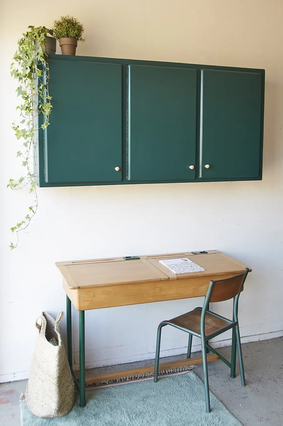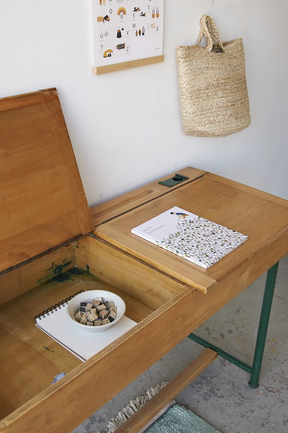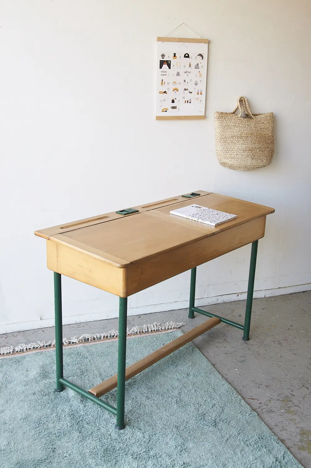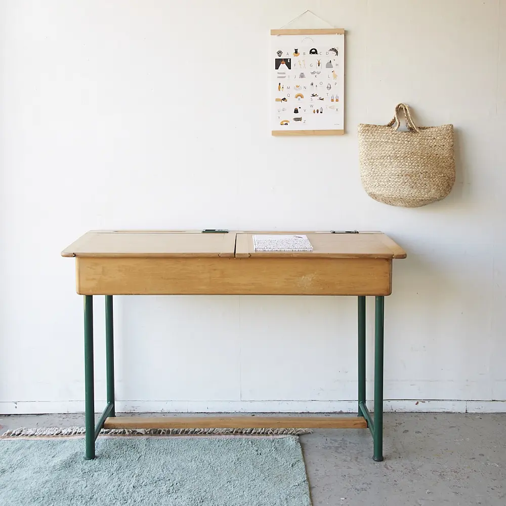 Een houten tweepersoons schooltafel met twee kleppen. Beide kleppen kunnen open, super leuk om alle knutselspullen in op te bergen! Wat zijn wij blij met deze aanwinst! Wij hebben de tafel goed schoongemaakt en behandeld tegen houtworm. Klaar voor een nieuwe plek. Die leuke hang kast is ook te koop bij ons, klik hier!
