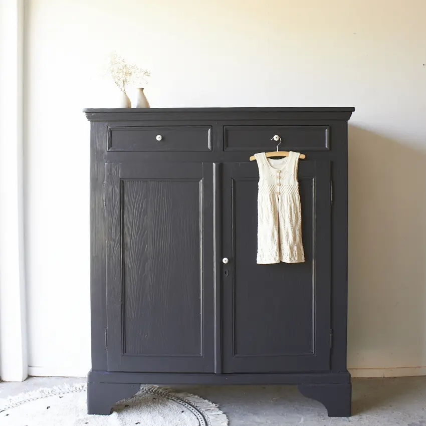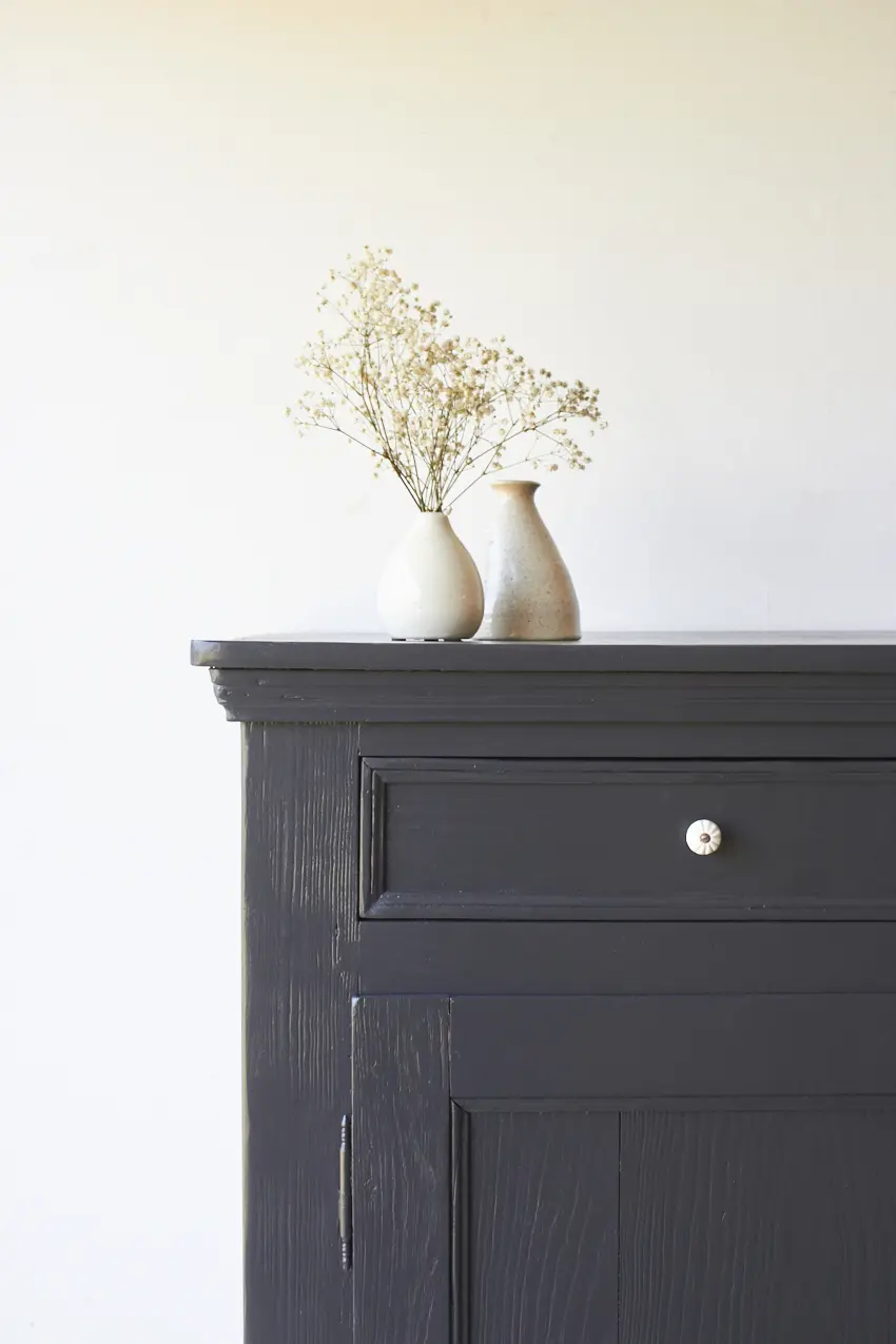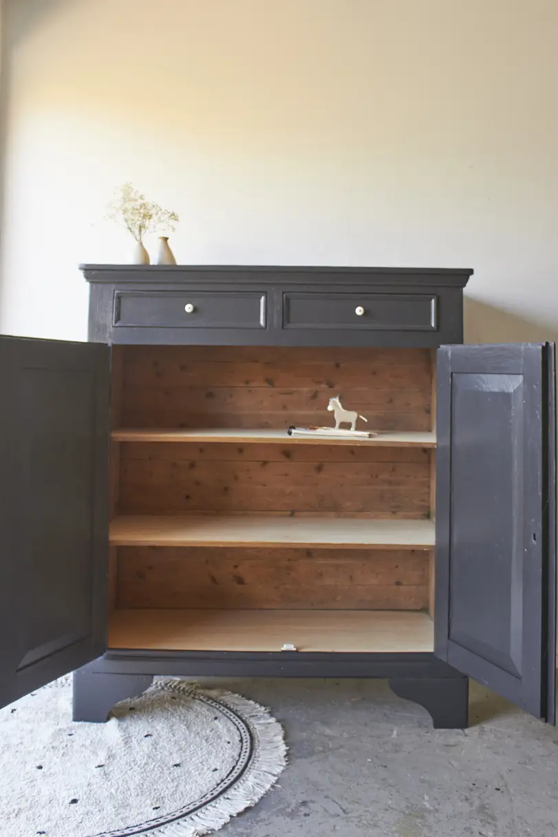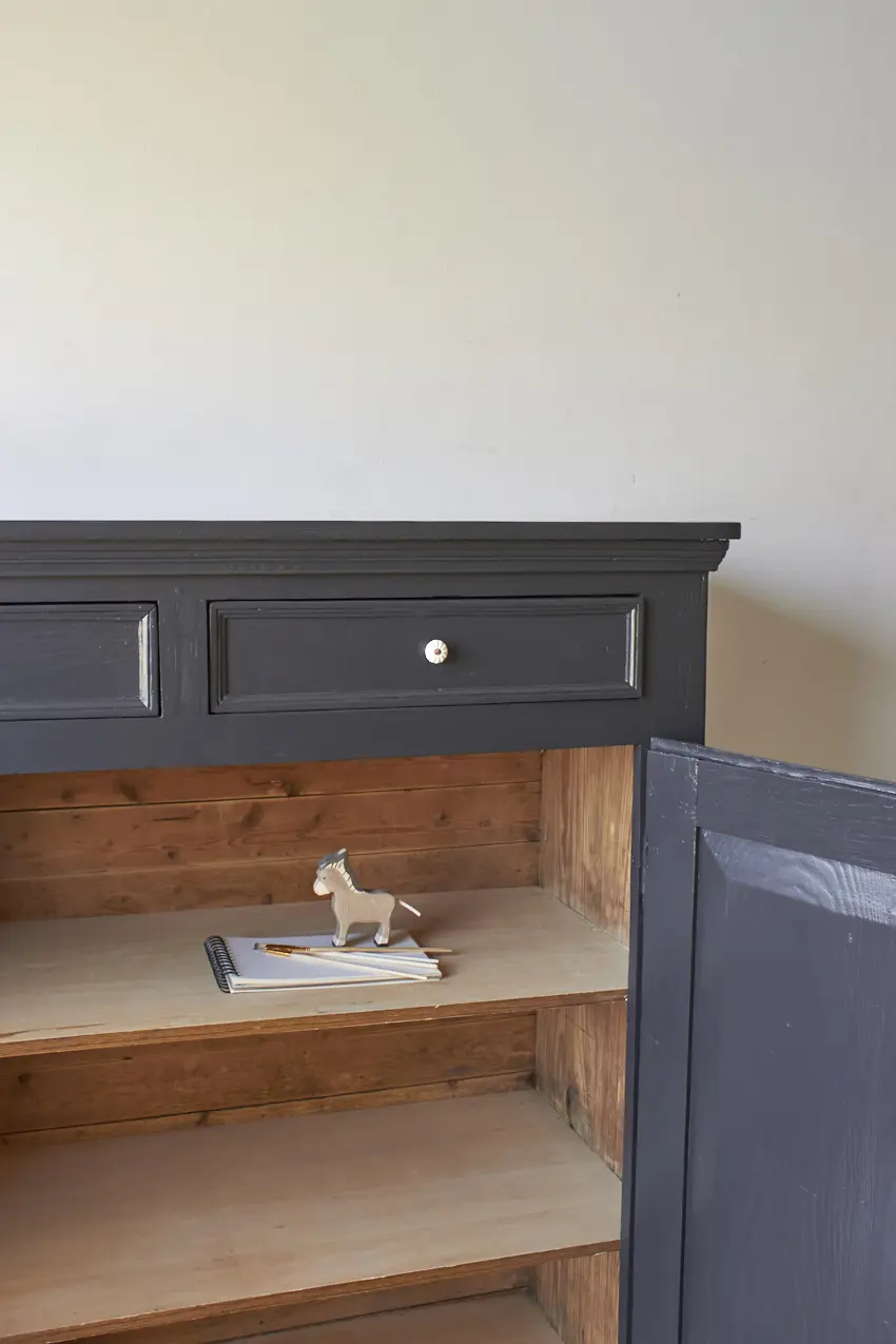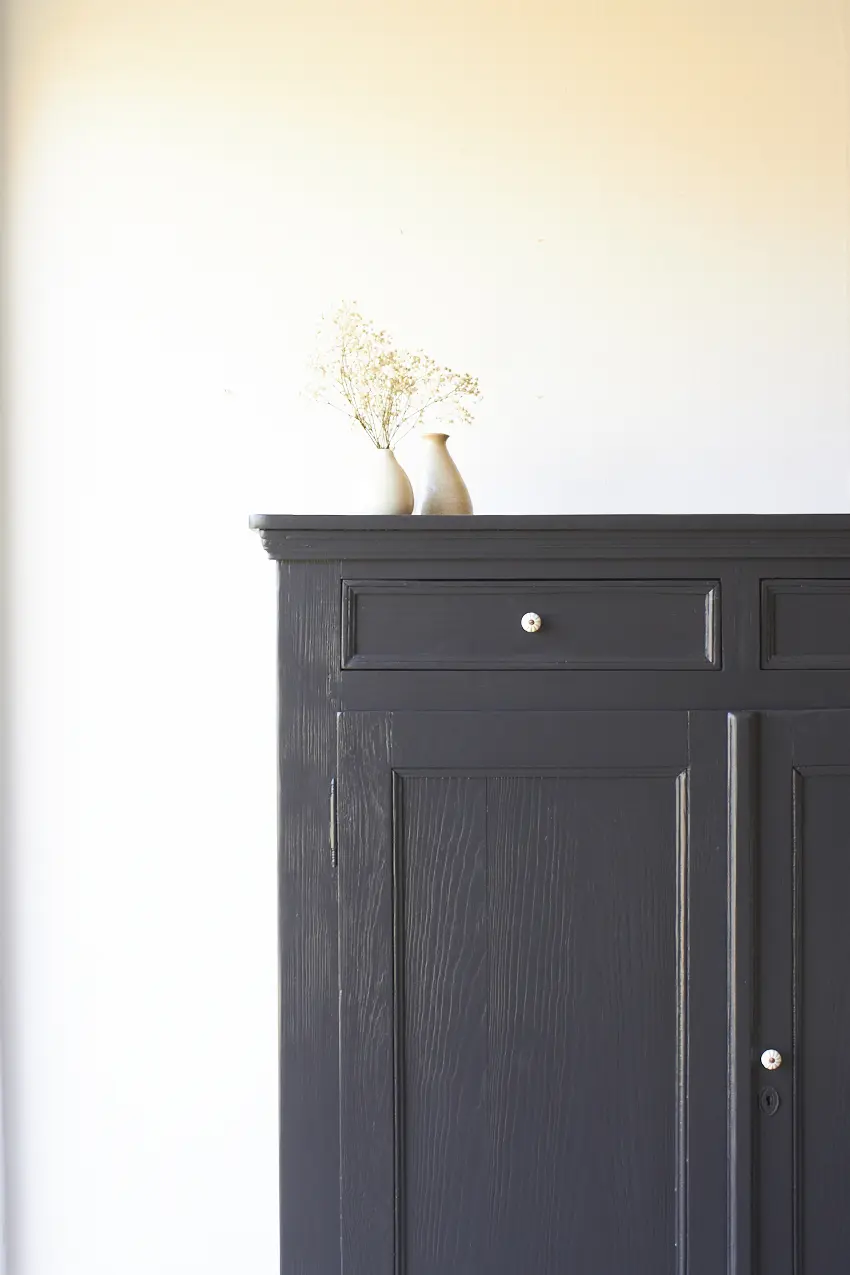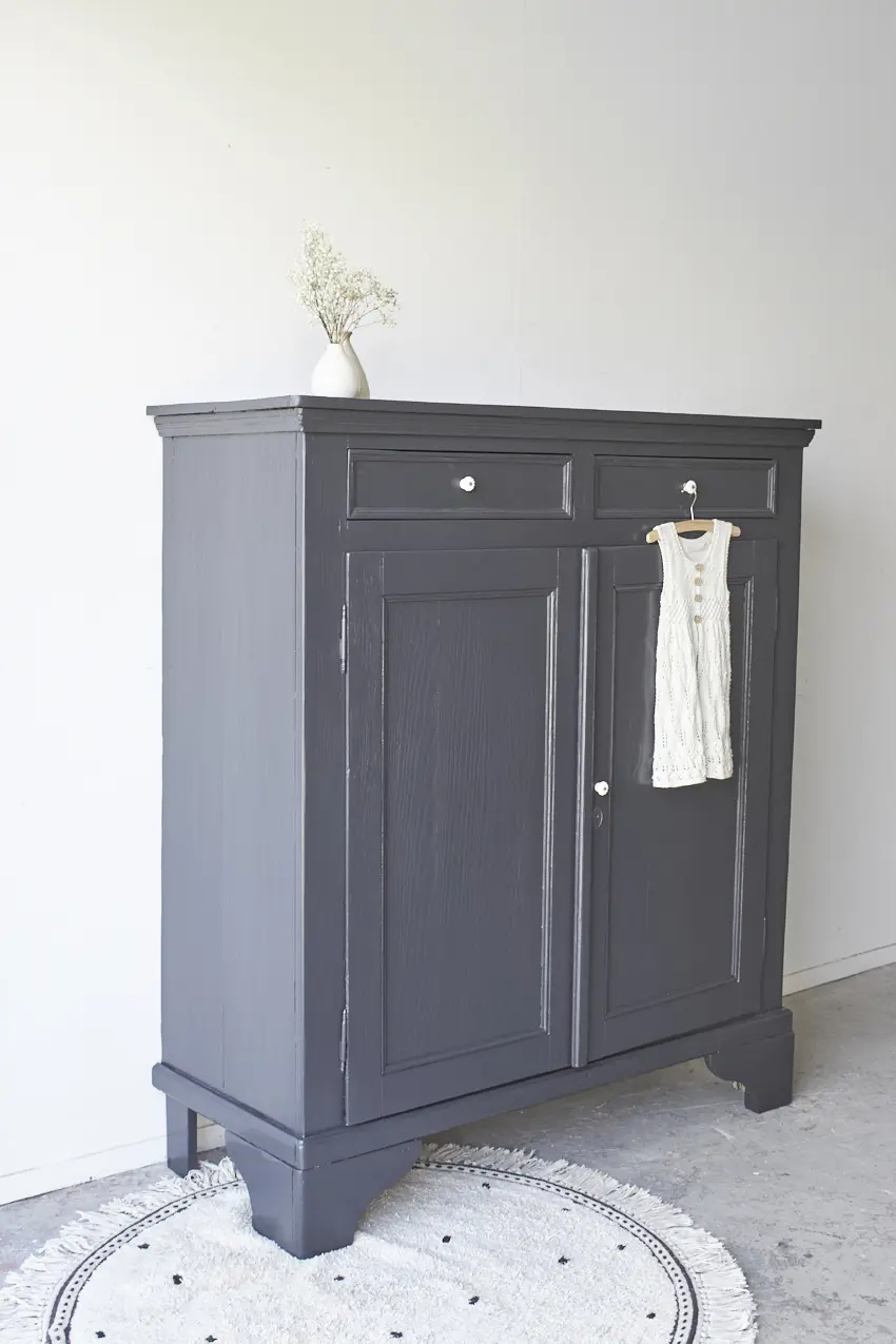 Na de vele reparaties was het tijd voor de kleurkeuze, Kraai! Onze meest donkere kleur, een net-niet zwart. Een hele stijlvolle kleur met veel diepte. Wat staat het hem mooi! Nu is het een kast die overal in huis wel kan staan. In de woonkamer met boeken en speelgoed, in de hal voor linnengoed of schoenen en sjaals. Of in de kinderkamer als kledingkast. Er is genoeg opbergruimte! De rechterdeur sluit met een magneetje en een porseleinen knop. Ook op de lades hebben porseleinen knoppen geplaatst zodat deze gemakkelijk open en dicht gaan. We zijn heel blij met deze kast!