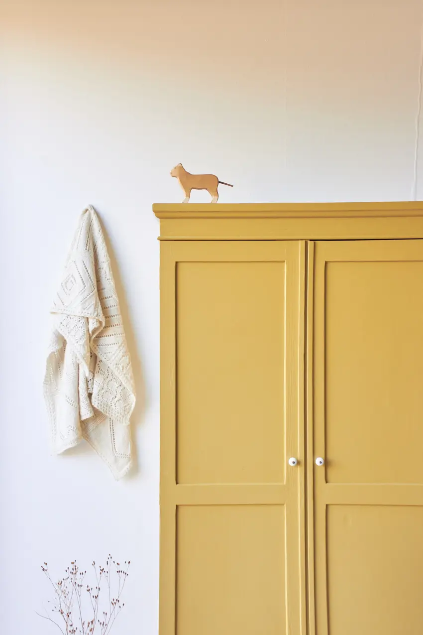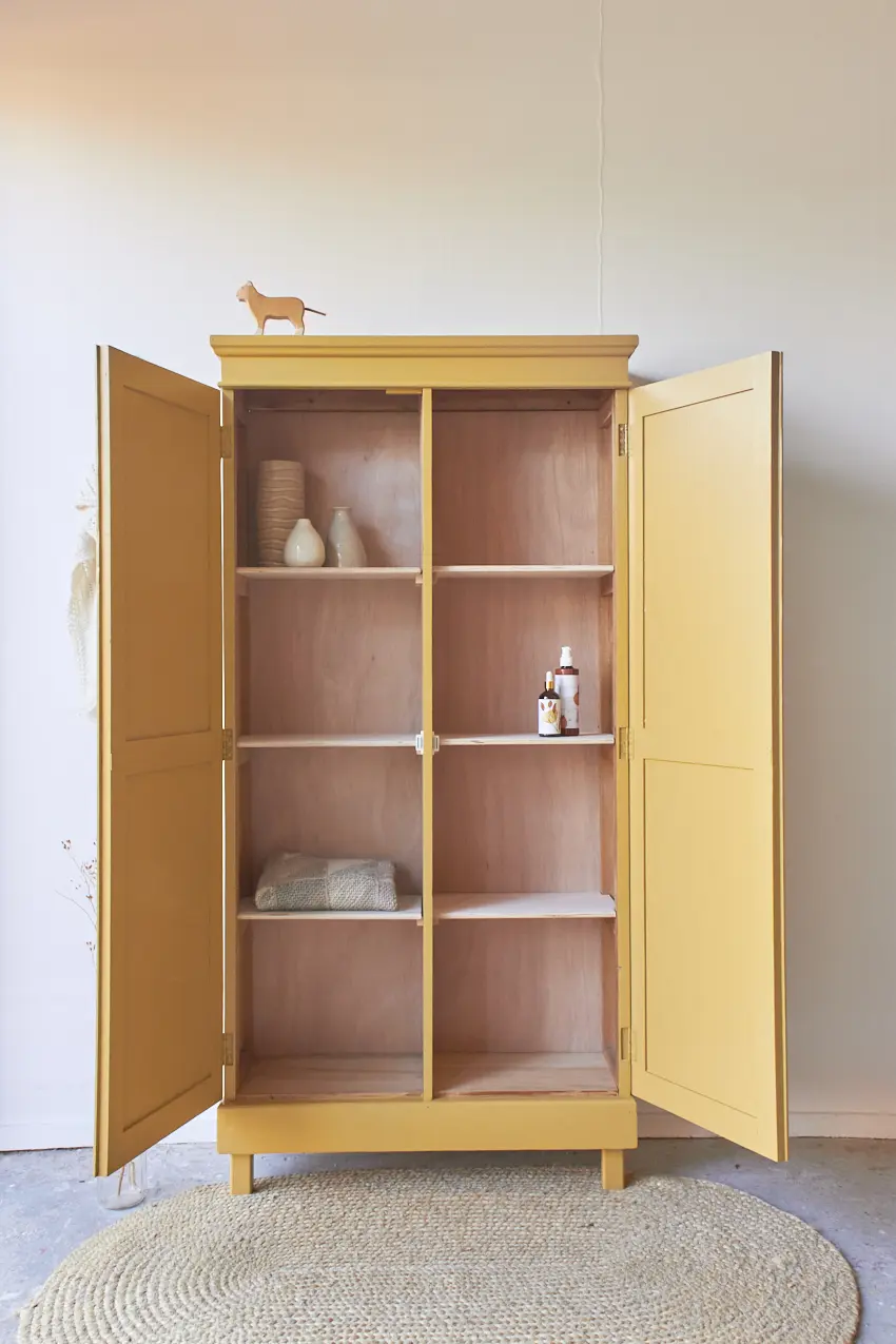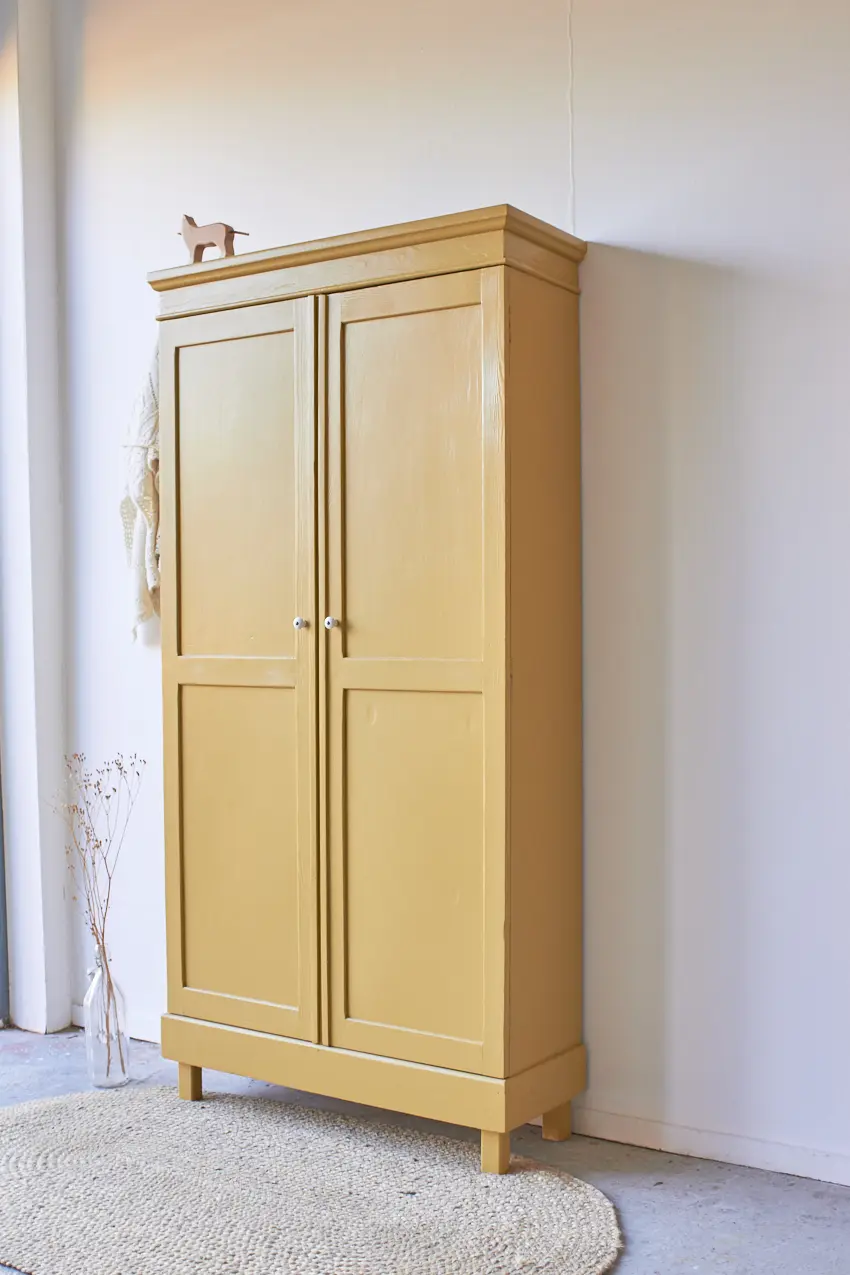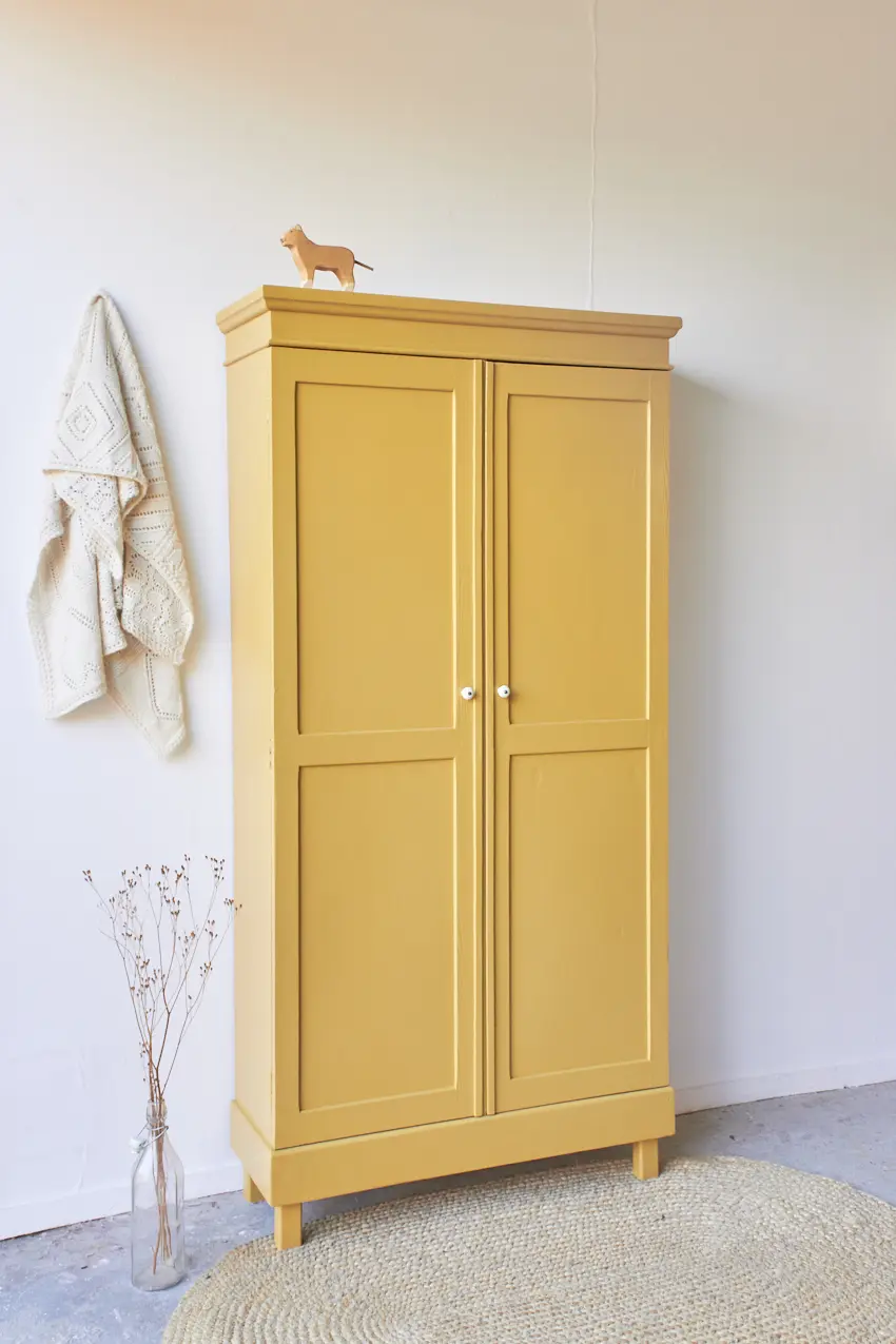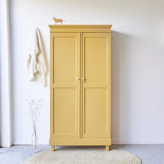 Wij kozen ervoor hem in deze prachtige kleur saffraan te schilderen. een mooie warme geel! Het heeft ons even gekost om tot deze prachtige geel te komen. Een geel is snel te fel of te muf. Saffraan is wat dat betreft een perfecte combinatie tussen fris en warm. Ieder meubel dat we in saffraan schilderen komt meteen tot leven. Deze kleur wordt ook veel gekozen onder onze op maat meubels. En dat snappen wij, Saffraan staat elke kast en commode fantastisch! De deuren sluiten door middel van een magneetje. De kast hebben we afgewerkt met porseleinen knopjes. En zo is hij weer helemaal klaar voor een nieuw leven.