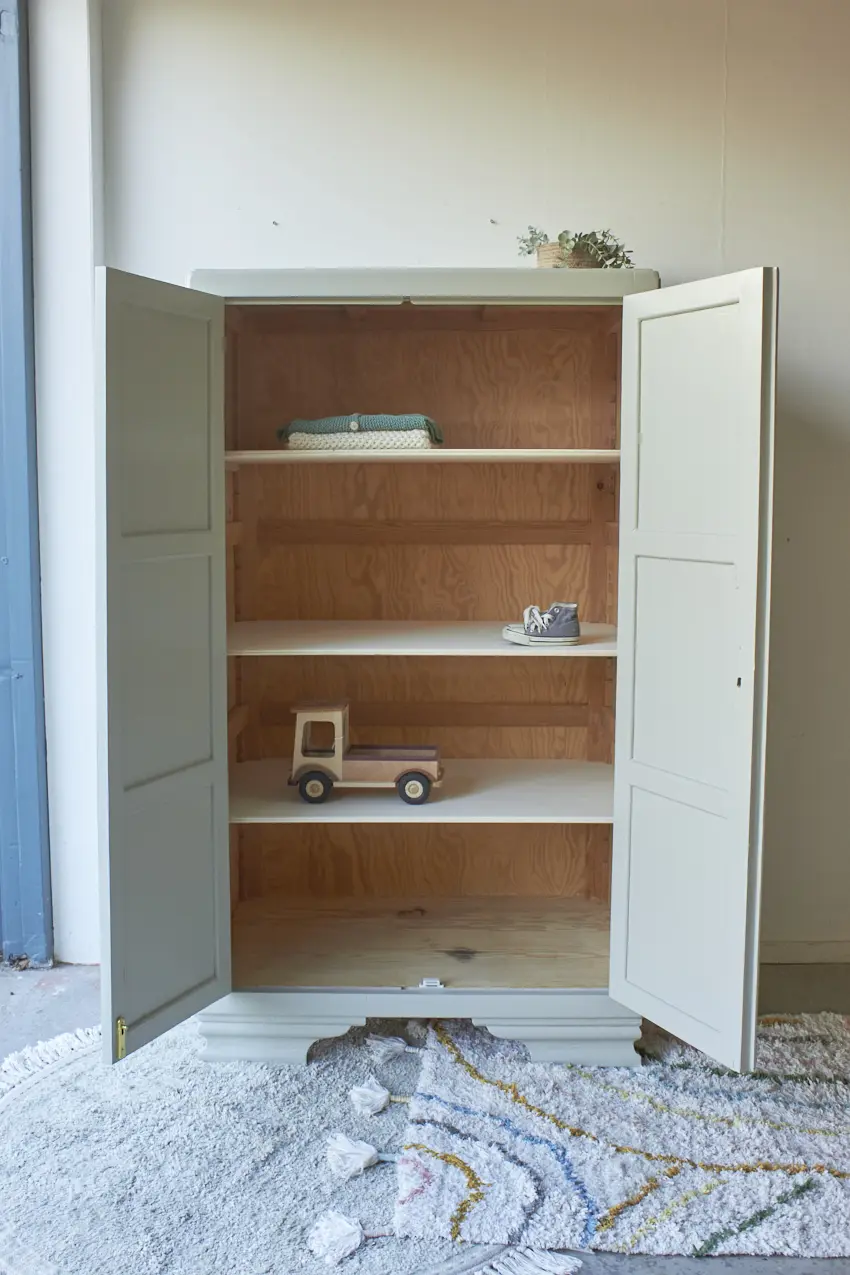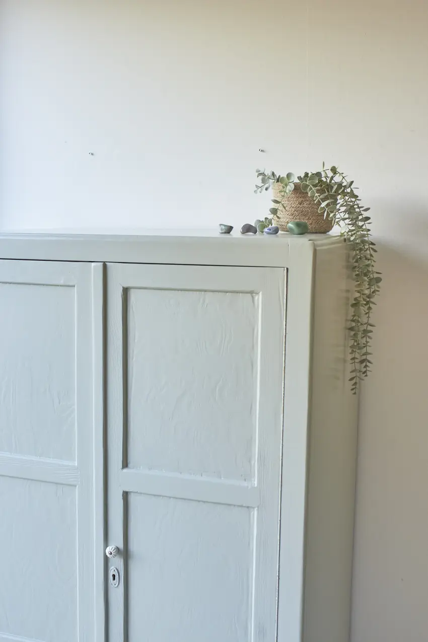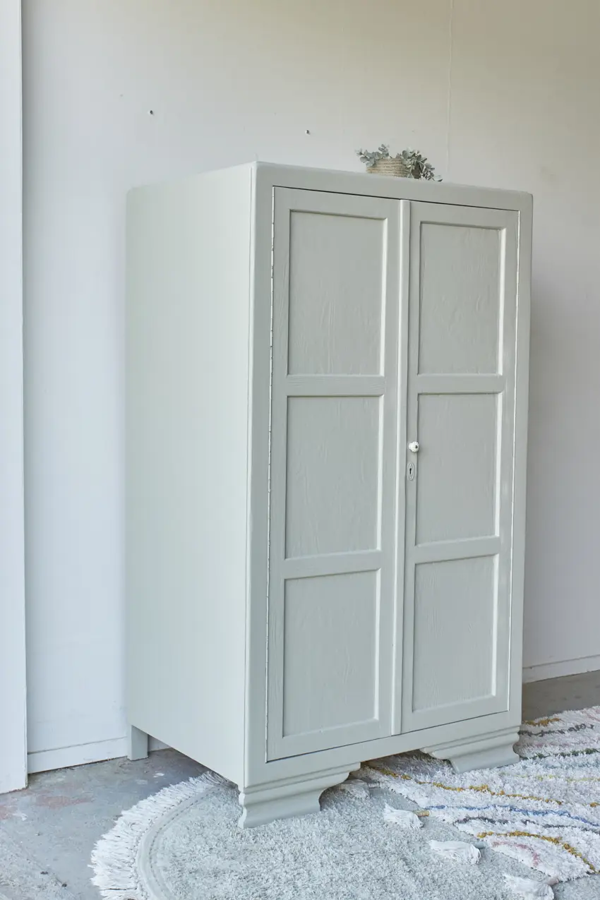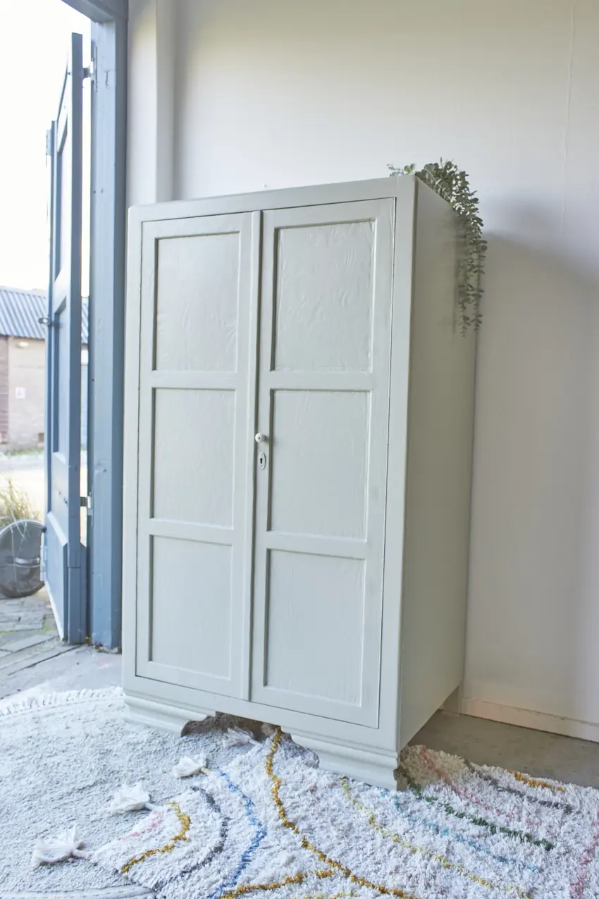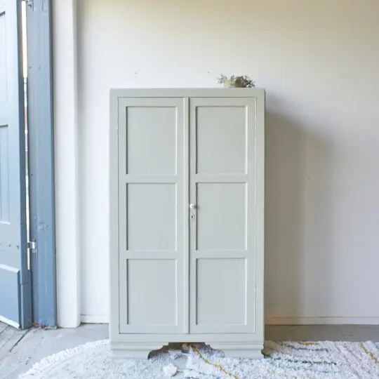 Wat een fijne kast voor in huis! Deze kast heeft een fijn formaat, hij is niet te groot en toch is er genoeg opbergruimte. En wat een leuke pootjes, samen in combinatie met de mooie paneeldeuren! Toen deze kast terugkwam van de stralers hebben we hem eerst goed schoongemaakt met een sopje. Ook de achterkant, onderkant en binnenkant. Daarna hebben we hem behandeld met een anti-houtworm spray. Een fijn begin voor het opknappen van deze kast! De indeling was niet meer bruikbaar dus deze hebben we eruit gehaald en vervangen voor 3 nieuwe stevige planken. Nu is er genoeg plek voor lekker veel speelgoed, boeken of linnengoed. Ook de deurtjes hebben we aangepast, deze hangen nu weer netjes recht. Achter de linkerdeur hebben we een schuifje geplaatst en achter de rechterdeur een magneetje. Na de nodige reparaties en een goede grondverf laag hebben we hem geschilderd in onze kleur Voorjaar. Een frisse, zachte groene kleur. Als laatste hebben we een bijpassende porseleinen knop geplaatst. Deze leukerd is weer helemaal klaar voor een nieuwe plek! Als speelgoedkastje of als boekenkastje, hij kan overal in huis wel staan.