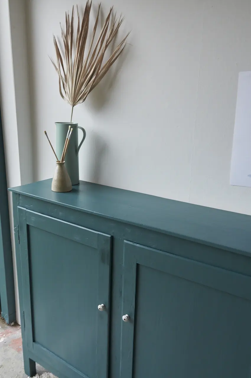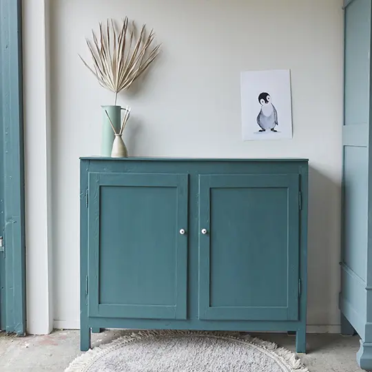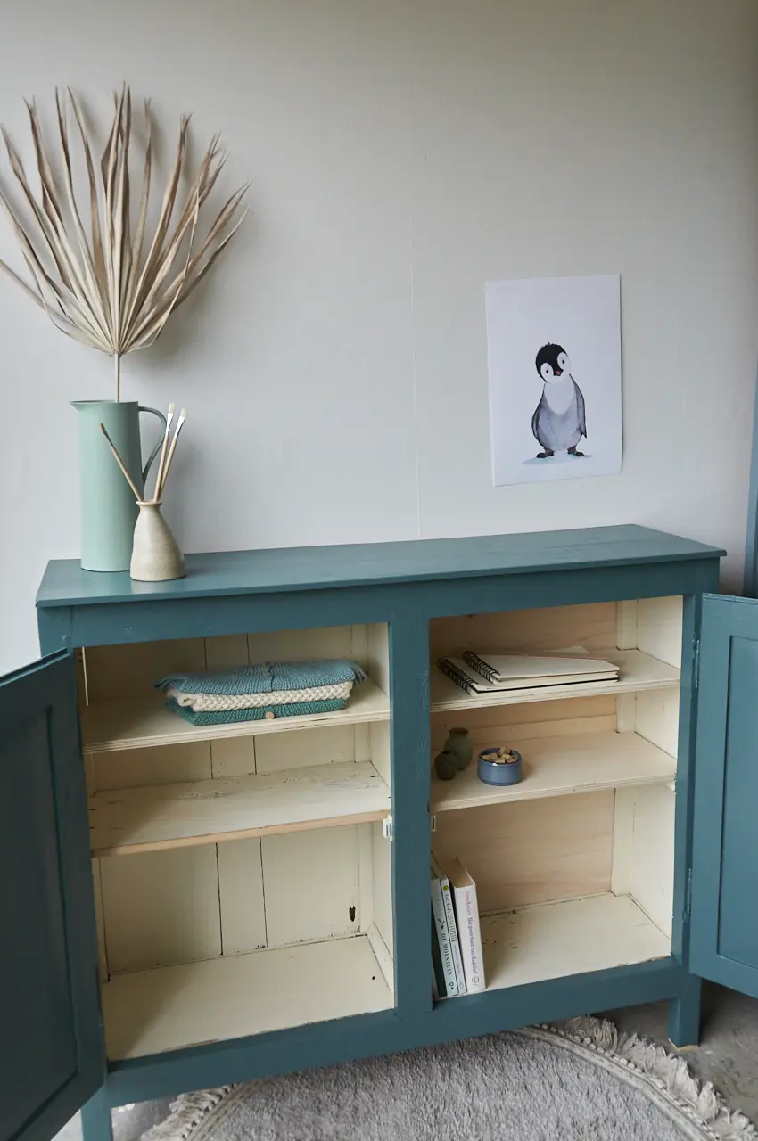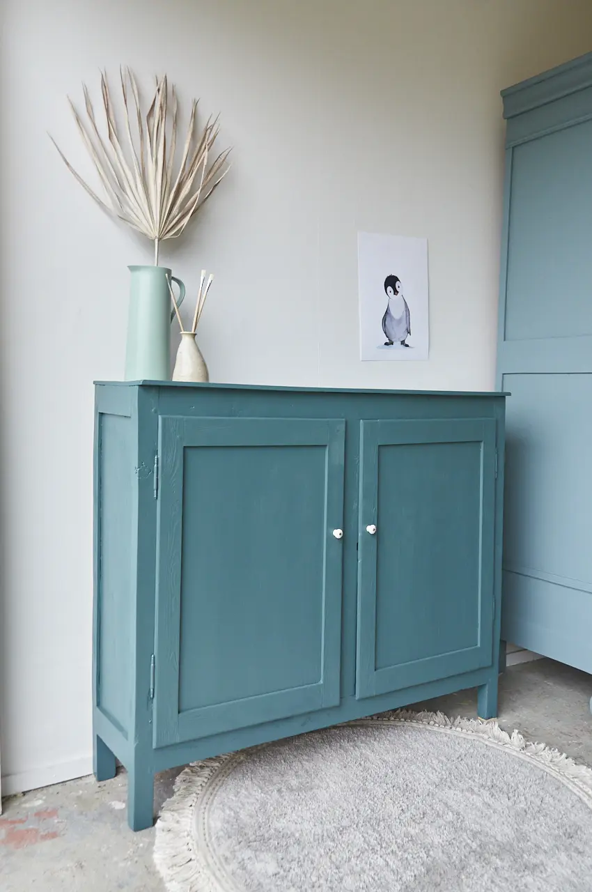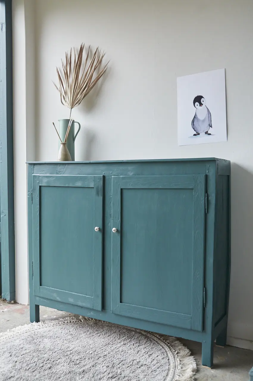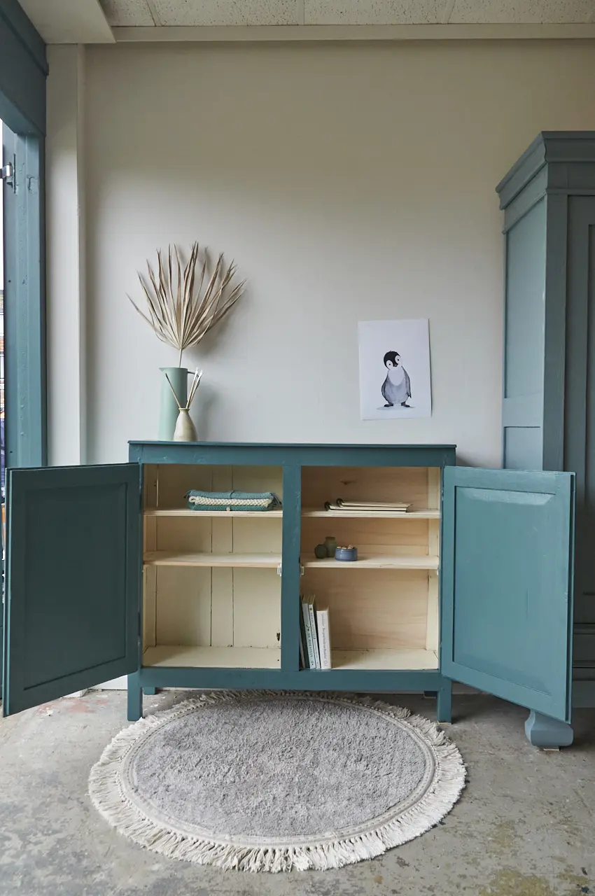 Wat een leuk vintage kastje is dit. In onze kleur Klif. Deze fantastische kleur gaat al heel lang mee. Sommige mensen vinden het blauw, anderen meer groen. Wij vinden het meer naar blauw neigen, een hele mystieke warme blauw met een vleugje groen. Deze kleur geeft ieder meubel karakter. Je kan Klif op een hele strakke, vrij saaie kast schilderen en dan blijkt het toch ineens niet meer zo’n saaie kast te zijn! Klif is erg mooi in combinatie met Nacht en Bron. Deze kleur zal niet snel vervelen! Dit kastje kan overal perfect staan omdat het niet zo diep is. Bijvoorbeeld in de gang voor schoenen en tassen. Op de kinderkamer voor spelletjes en boeken. Of in de woonkamer voor alle knutselspullen. Hij is goed schoongemaakt en behandeld tegen houtworm. Wij proberen altijd zoveel mogelijk te hegrebuiken van een een meubel maar soms is het echt aan vervanging toe. Zoals deze indeling, voor de helft niet. Deze kast is helemaal klaar voor gebruik en een nieuwe plek. Dat heerlijke kleed wat er perfect bij staat is ook te koop bij ons, klik HIER.