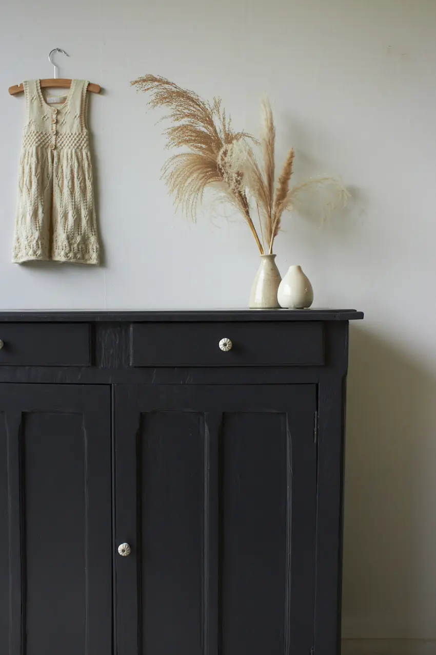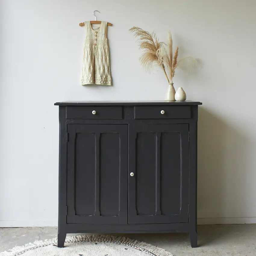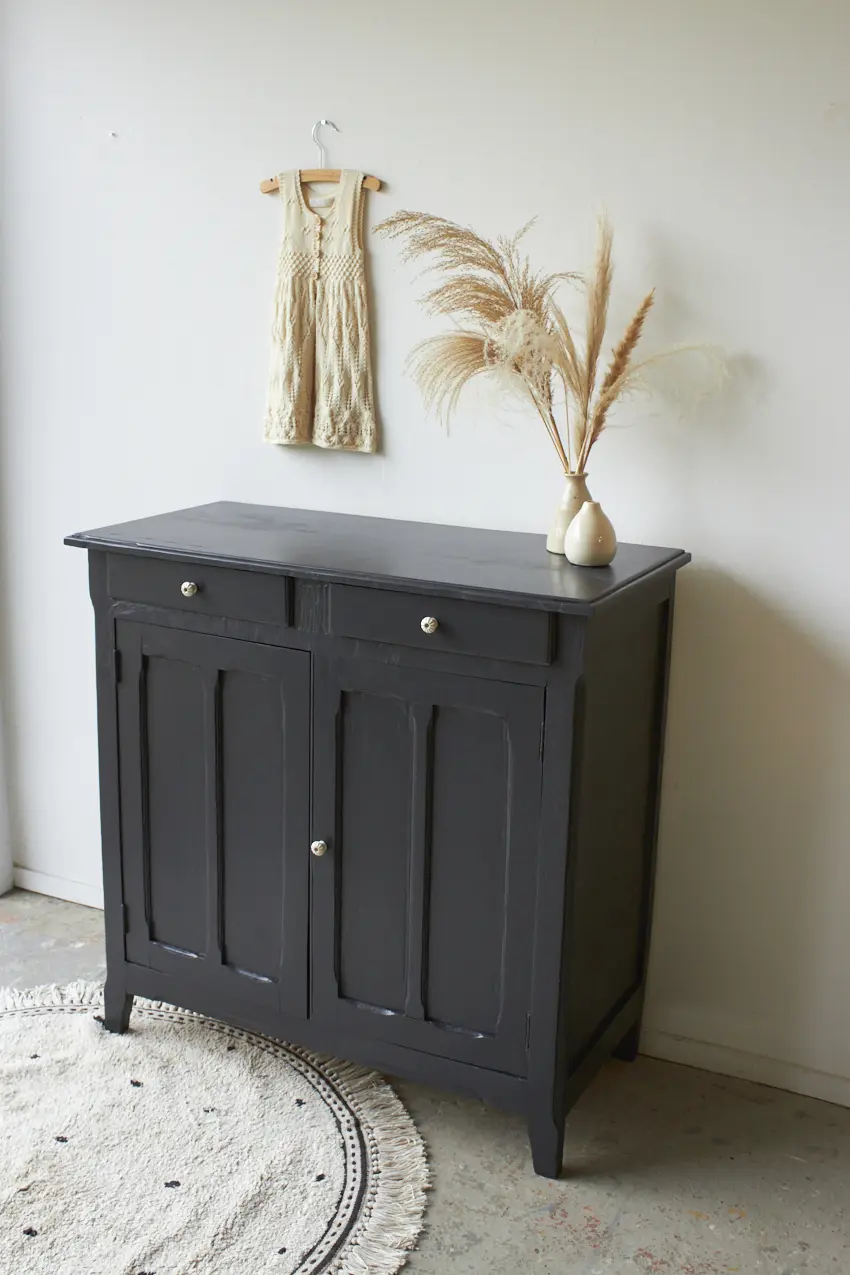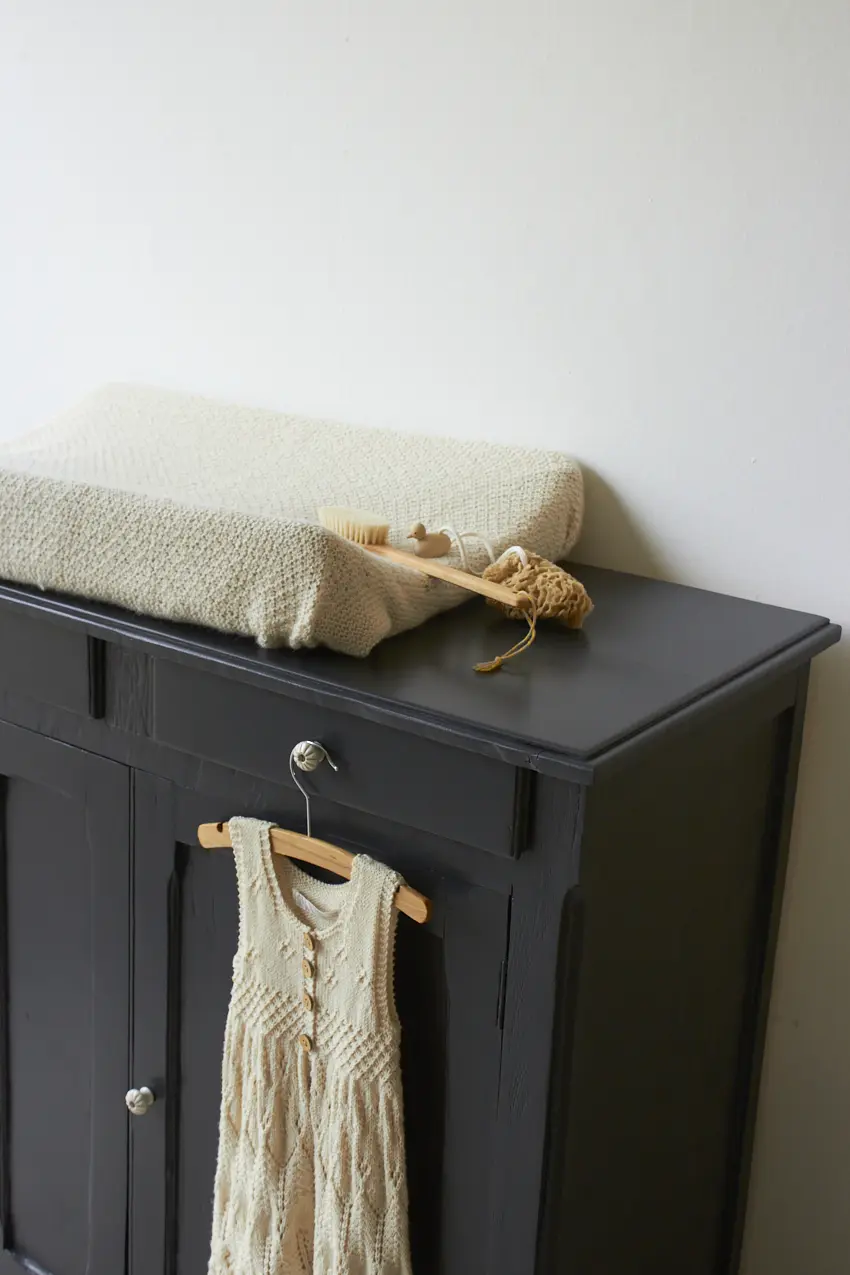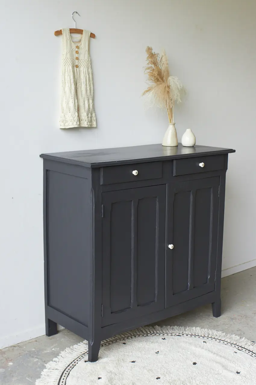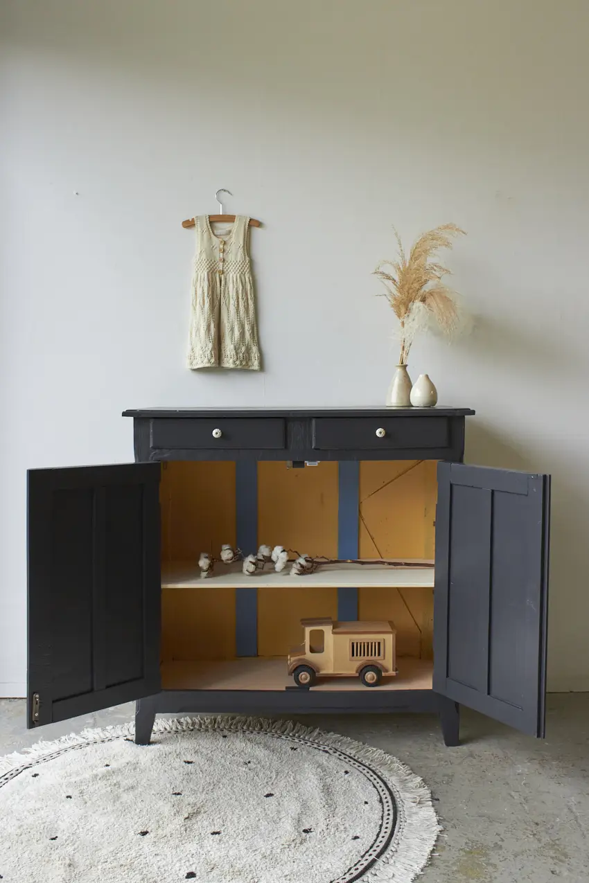 Wat een prachtig vintage kastje is dit! Zo blij met deze vondst. Een ideaal kastje namelijk om al het speelgoed in op te bergen. Er is genoeg ruimte voor bakken en stapels spelletjes! Dit kastje kan ook prima eerst als commode gebruikt worden. Het verschoonkussen past er net op. Heel fijn voor de kleine babykamers. Als eerste hebben we alle oude verflagen er af laten halen door middel van zandstralen. Wij hebben het kastje daarna grondig schoongemaakt, behandeld tegen houtworm en gerepareerd waar nodig. Hij heeft na de laag grondverf deze mooie kleur kraai gekregen. Kraai is onze meest donkere kleur, een hele stoere nét-niet zwart. Een kleur die je misschien wat minder snel denkt te gebruiken op de kinderkamer, maar geloof ons: alles wat je in Kraai zal schilderen wordt vanzelf stijlvol. Omdat hij net niet zwart is heeft de kleur nog veel diepte. De linker deur sluit door middel van een schuifje en de rechter deur sluit met een knopje. Helemaal klaar voor gebruik! Dit kleed past er ook perfect bij, klik daarvoor HIER.