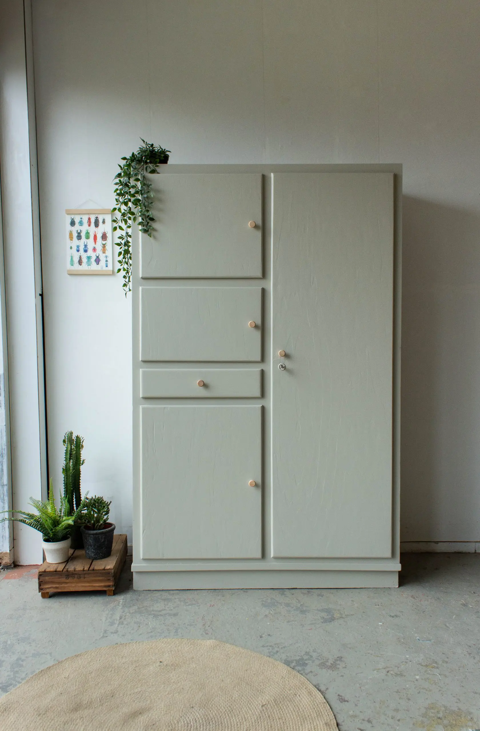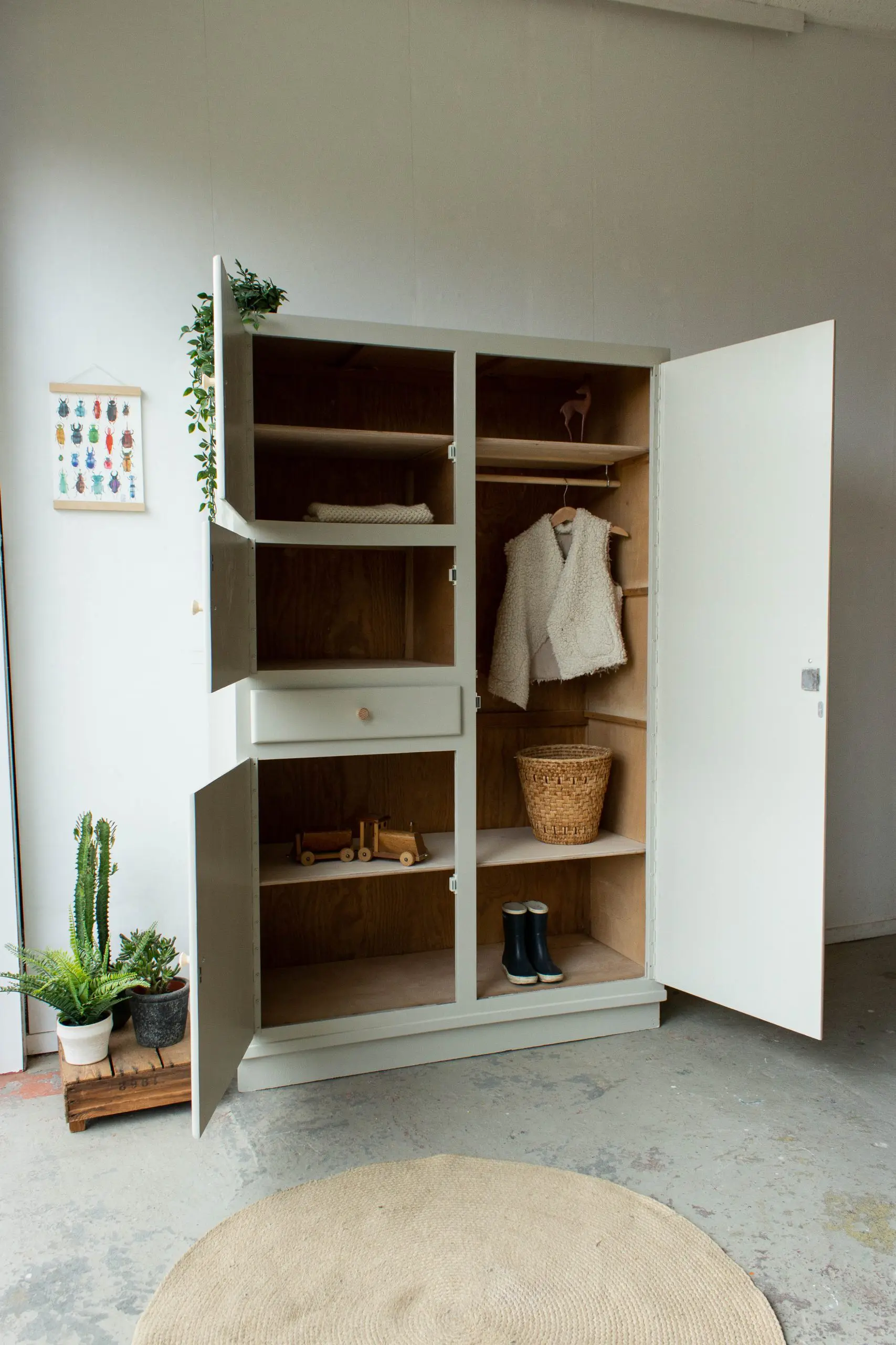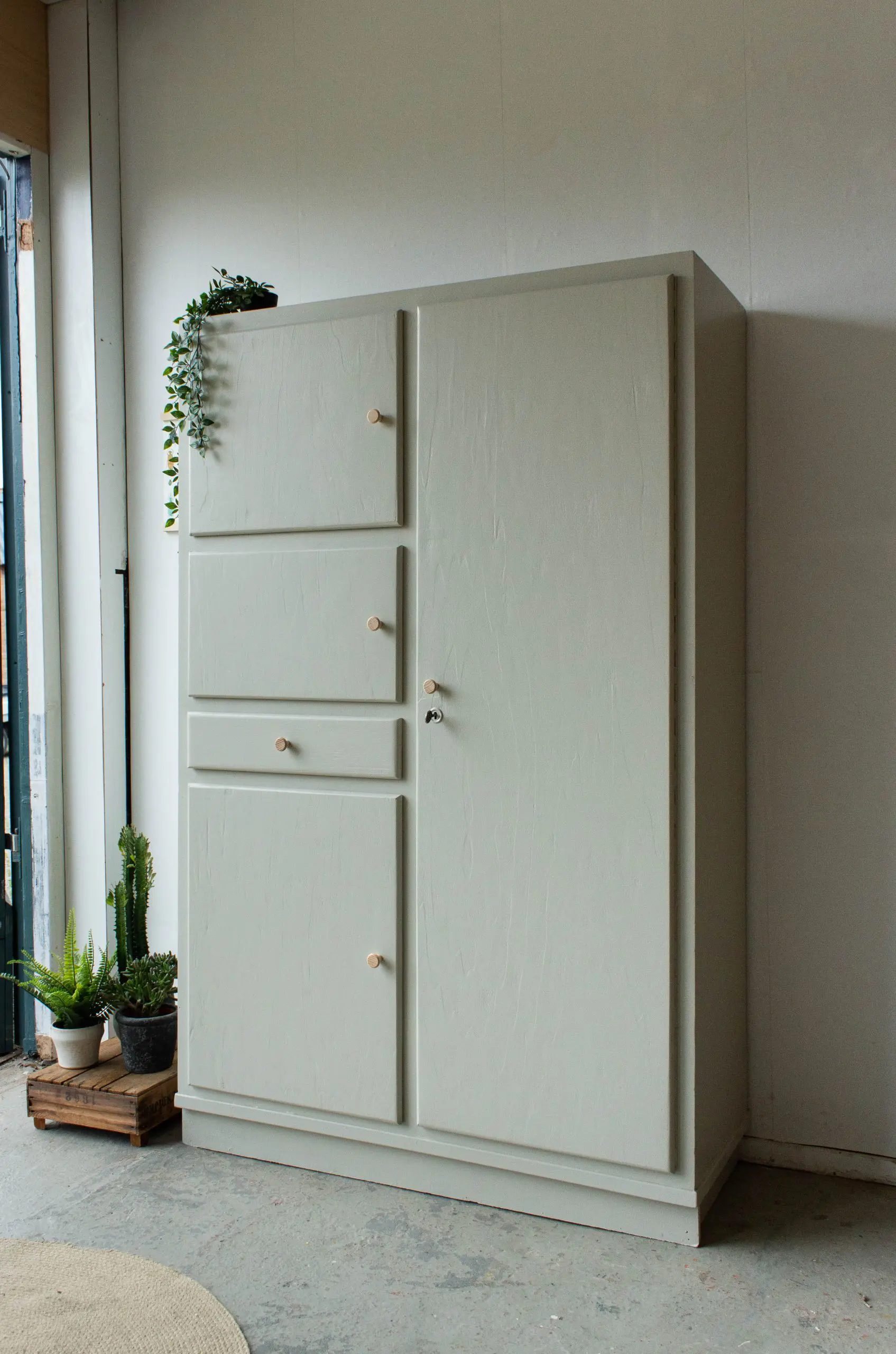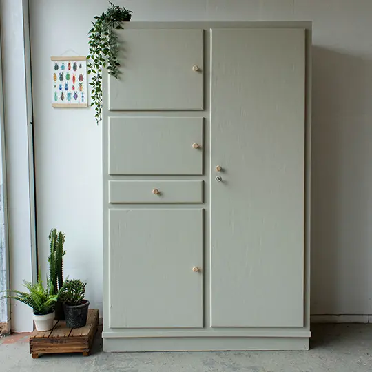Een ontzettend handige, ruime én leuke kast uit Noord Frankrijk. Een typische keukenkast uit de jaren 60. Maar wij hem hem omgetoverd tot kledinkast! Van binnen is de kast voorzien van een nieuwe indeling, met nieuwe houten plankjes en een roede. Maar van buiten had hij ook wat reparaties nodig. Zo heeft hij een nieuwe sierlat gekregen en is hij helemaal gecheckt op stevigheid. Na de grote schoonmaakbeurt is de kast in deze zachte taupe kleur geschilderd. Op de deurtjes en de la zijn tot slot mooie essenhouten knopjes gezet. En zo is deze veelzijdige kast weer helemaal klaar voor een volgend leven!