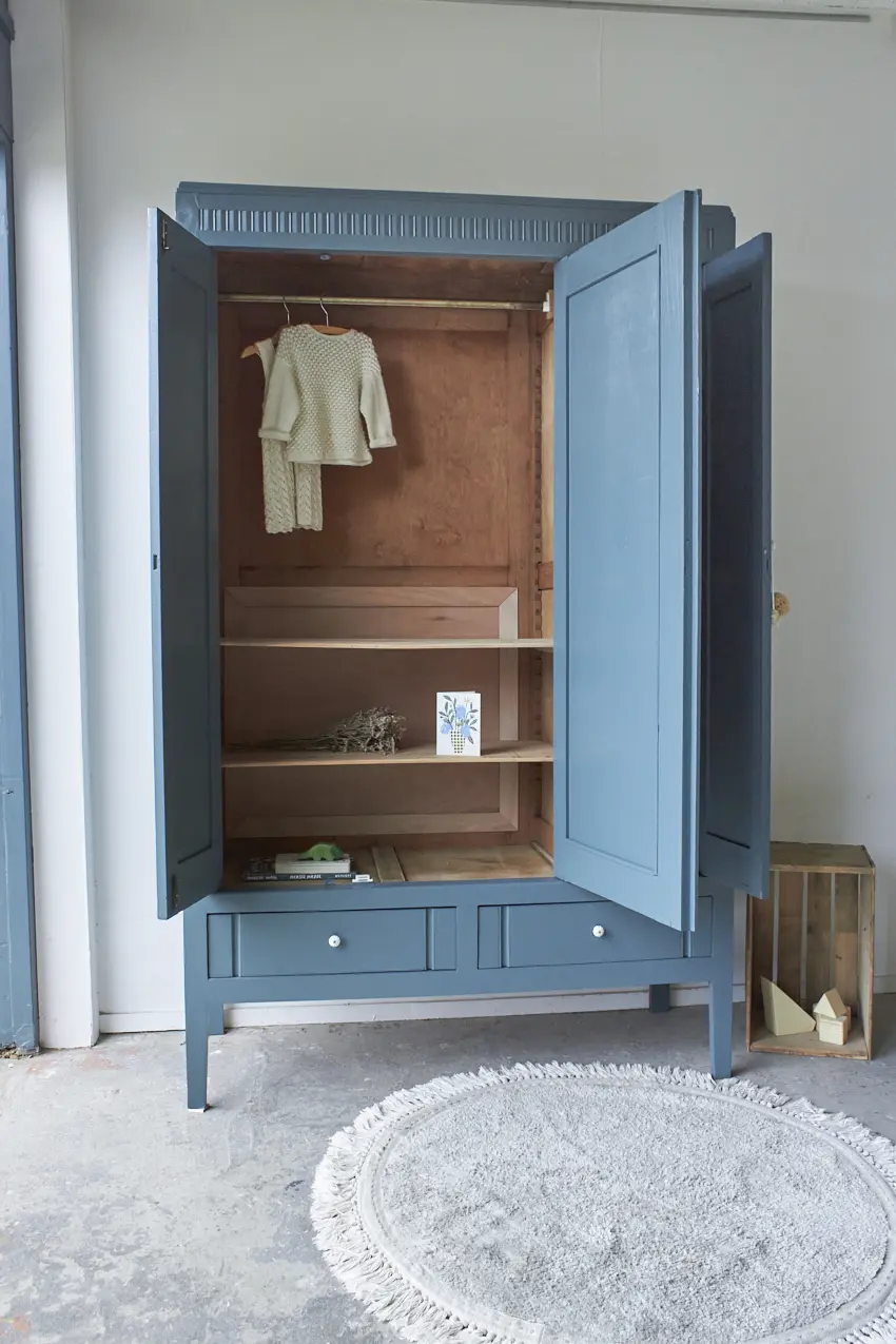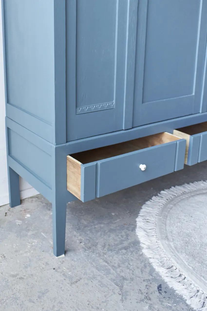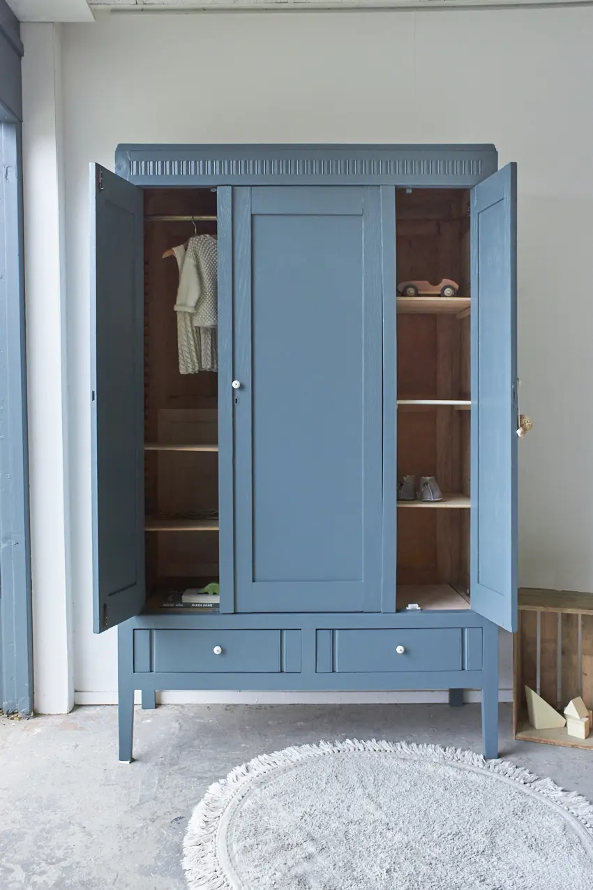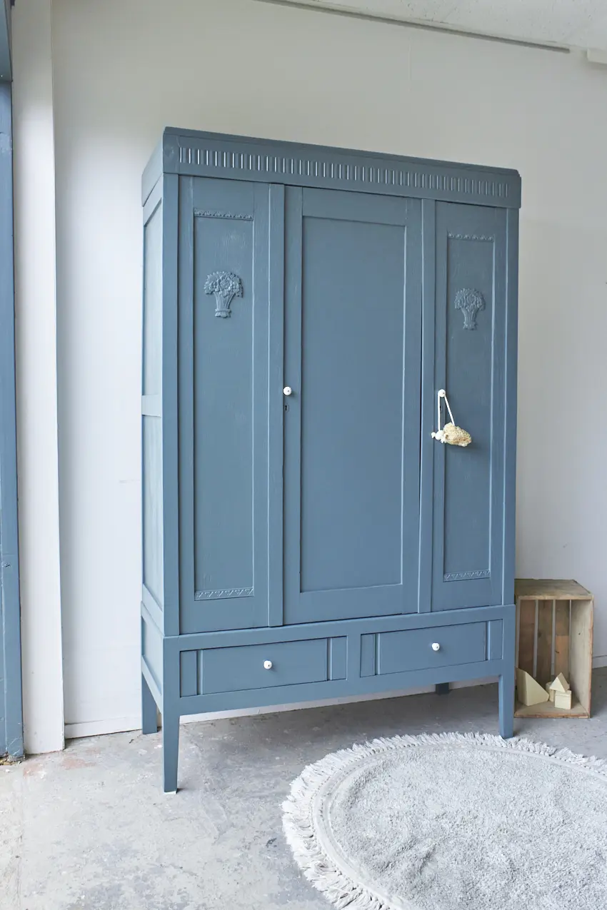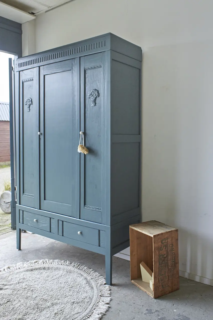 Wauw! Wat een leukerd, deze kledingkast op zijn hoge pootjes. En wat een fijne, speelse details, zoals het mooie houtsnijwerk in de vorm van een bosje bloemen. Heel fijn aan deze kast is dat alle deuren open kunnen, dus je kunt gemakkelijk overal bij. En hij is demontabel, dus hij kan daardoor gemakkelijk uit elkaar gehaald worden. Fijn als de kast verplaatst of naar boven getild moet worden! Toen deze kast terugkwam van de zandstralers hebben we alle onderdelen goed schoongemaakt. Na de anti-houtworm behandeling hebben we hem in elkaar gezet en alle onderdelen goed nagelopen en weer passend gemaakt. De bodem is gedeeltelijk vervangen en is weer vastgezet, net als het dakje. Alle deuren hangen weer netjes recht en hij staat weer stevig op zijn pootjes. Ook de lades gaan weer soepel open en dicht. Het tussenschot is origineel, net als de meeste planken. Rechts hebben we een plank vervangen. De originele indeling is zo ideaal dat we deze zo hebben gelaten. Alle planken zijn weer netjes glad geschuurd en teruggeplaatst. Met de roede en alle planken is er lekker veel opbergruimte voor kleding! De planken kunnen eruit gehaald worden, waardoor je de indeling links eventueel kunt aanpassen als baby- of kinderkleding wat langer is geworden. Of wanneer de kast op een volwassen slaapkamer geplaatst wordt! Onderin zitten twee grote lades voor nog meer opbergruimte. De linkerdeur sluit met twee schuifjes, de middelste en rechterdeur sluiten met magneetjes. Zo gaan alle deuren gemakkelijk open en dicht. Uiteindelijk hebben we hem geschilderd in onze kleur Klif. Een warme mystieke blauw tint met een vleugje groen. Een fijne kleur die niet snel zal vervelen. Met de porseleinen knoppen is hij helemaal af. Wat een leukerd!