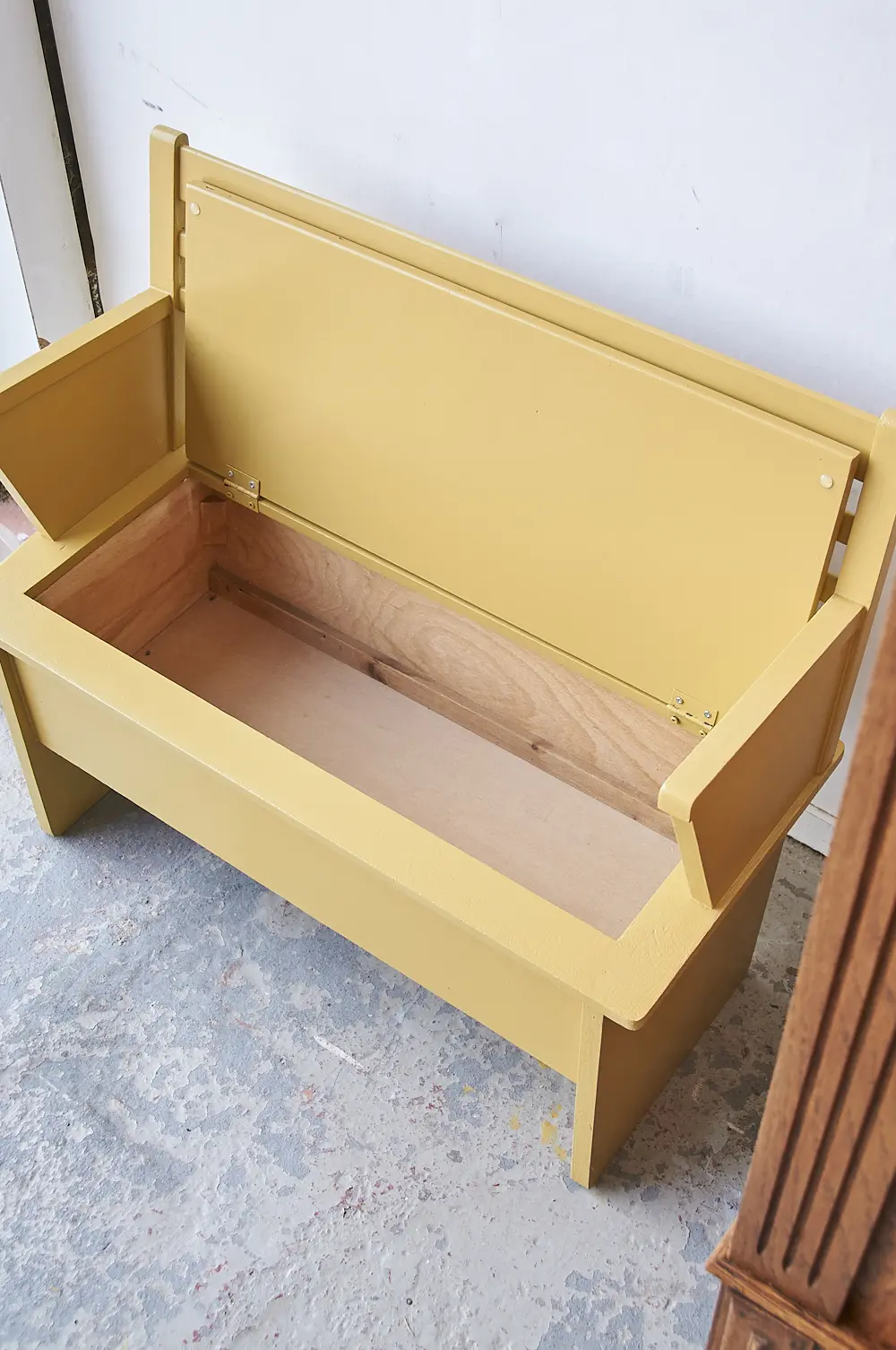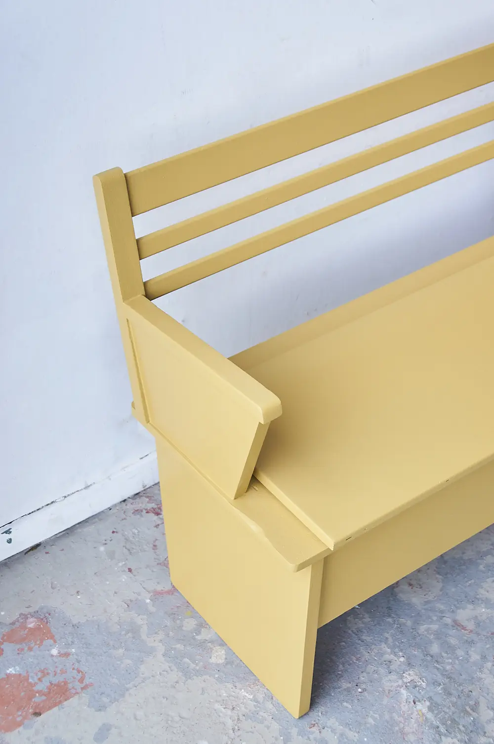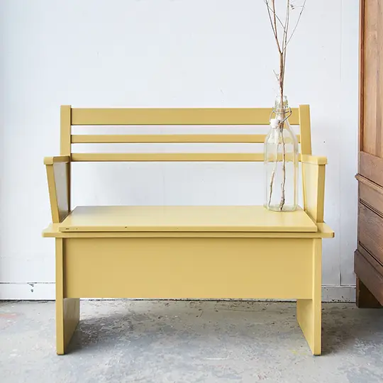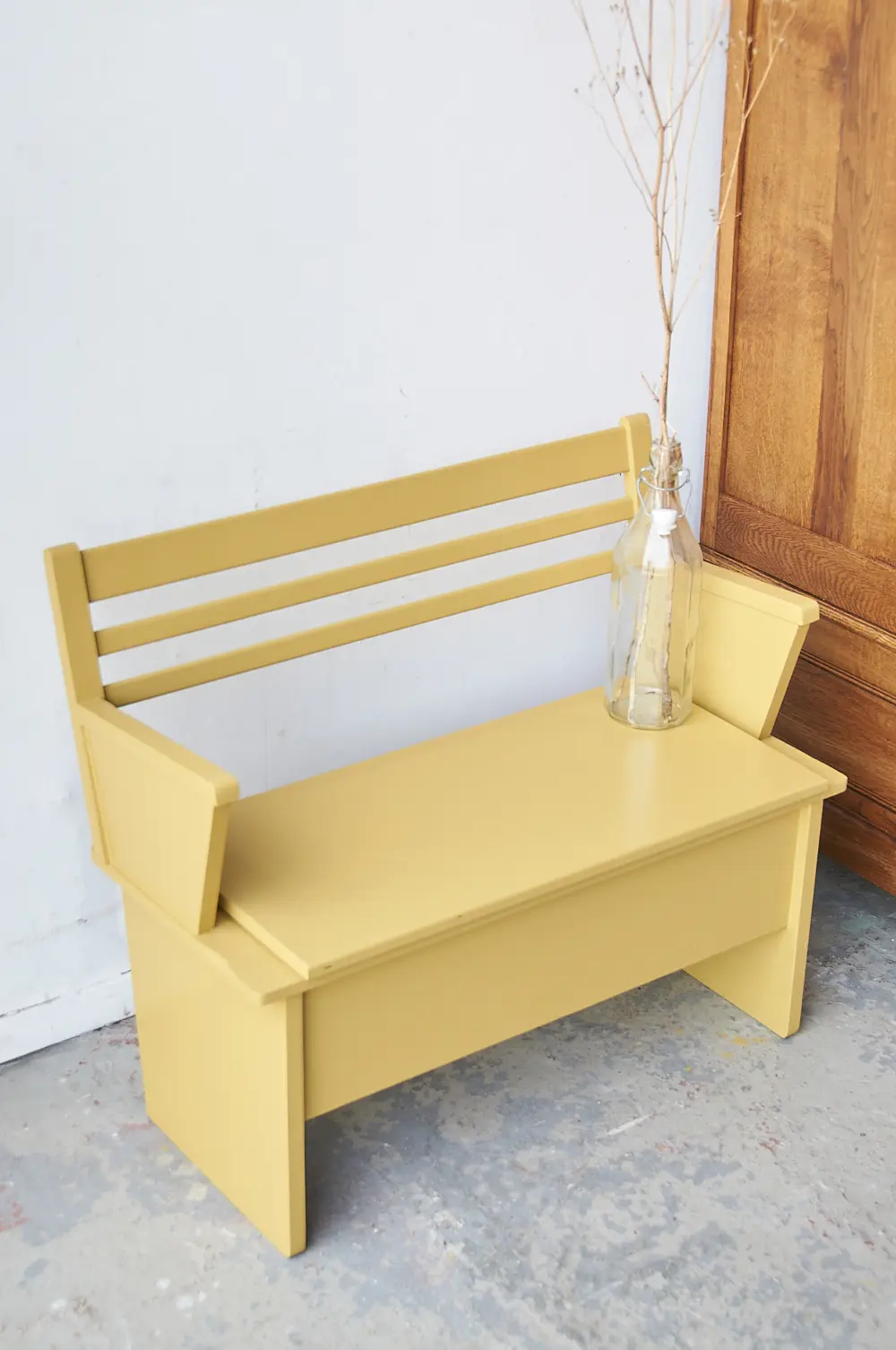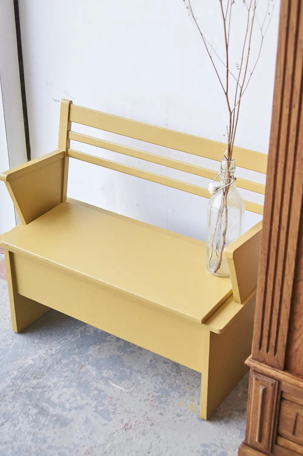 Zo leuk dit lieve vintage klepbankje. Je kan er op zitten én er past een boel in. Wij hebben het bankje grondig schoongemaakt, behandeld tegen houtworm en in onze prachtige kleur saffraan geschilderd. Perfect voor op de gang, of ook leuk in de woonkamer met speelgoed erin.