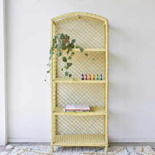 Deze rotan kast kwam binnen in deze lichtgele kleur, zo leuk! Het geeft deze kast een speels uiterlijk. We hebben hem helemaal nagelopen en goed schoongemaakt. Op de rotan planken is er genoeg ruimte om speelgoed op te bergen of mooie producten uit te stallen. Boeken, vaasjes en edelstenen worden echte pronkstukken als je ze in deze kast zet. Ideaal voor op de kinderkamer of speelkamer, maar ook in de woonkamer zal hij mooi staan. Het geeft wat extra kleur in huis!