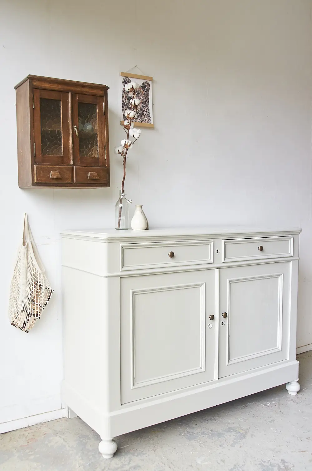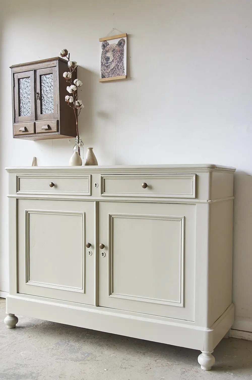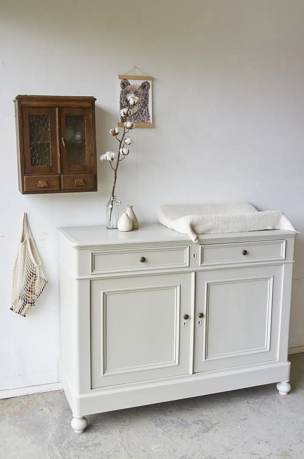 Een mooie, brede, klassieke commode. Deze commode is van prachtig massief eikenhout gemaakt. We hebben er voor gekozen hem in deze rustige ‘linnen’ te schilderen, heel mooi in combinatie met de rust die de commode zelf ook uitstraalt. We hebben de commode grondig schoongemaakt en behandeld tegen houtworm. De laatjes lopen soepel en deurtjes sluiten optimaal. Het linker deurtje heeft een schuifje en het rechter deurtje sluit met een magneetje. We hebben de commode afgewerkt met mooie bronzen knoppen. De commode is iets hoger dan gemiddeld, dus perfect als je iets langer bent! Hij is helemaal klaar voor gebruik!