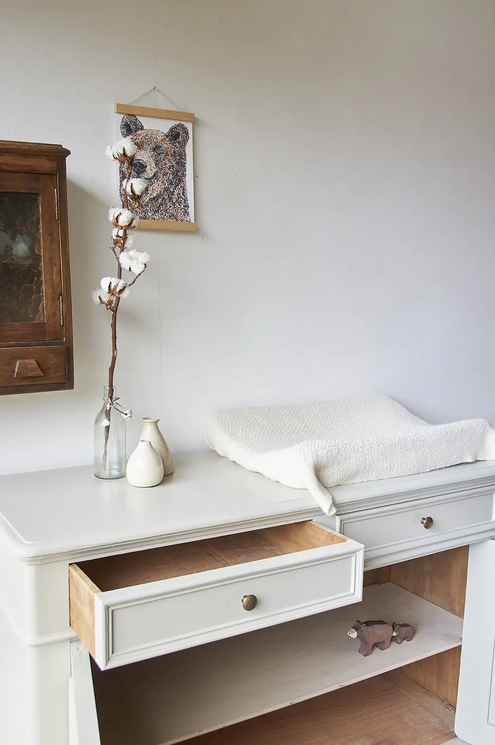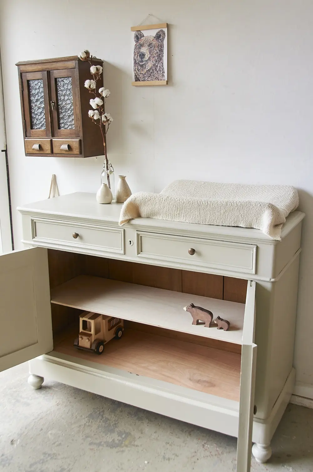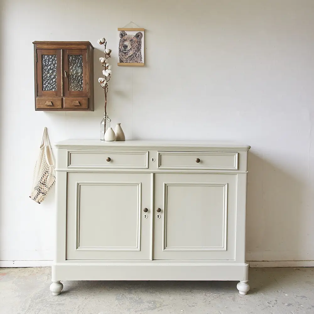 Een mooie, brede, klassieke commode. Deze commode is van prachtig massief eikenhout gemaakt. We hebben er voor gekozen hem in deze rustige ‘linnen’ te schilderen, heel mooi in combinatie met de rust die de commode zelf ook uitstraalt. We hebben de commode grondig schoongemaakt en behandeld tegen houtworm. De laatjes lopen soepel en deurtjes sluiten optimaal. Het linker deurtje heeft een schuifje en het rechter deurtje sluit met een magneetje. We hebben de commode afgewerkt met mooie bronzen knoppen. De commode is iets hoger dan gemiddeld, dus perfect als je iets langer bent! Hij is helemaal klaar voor gebruik!