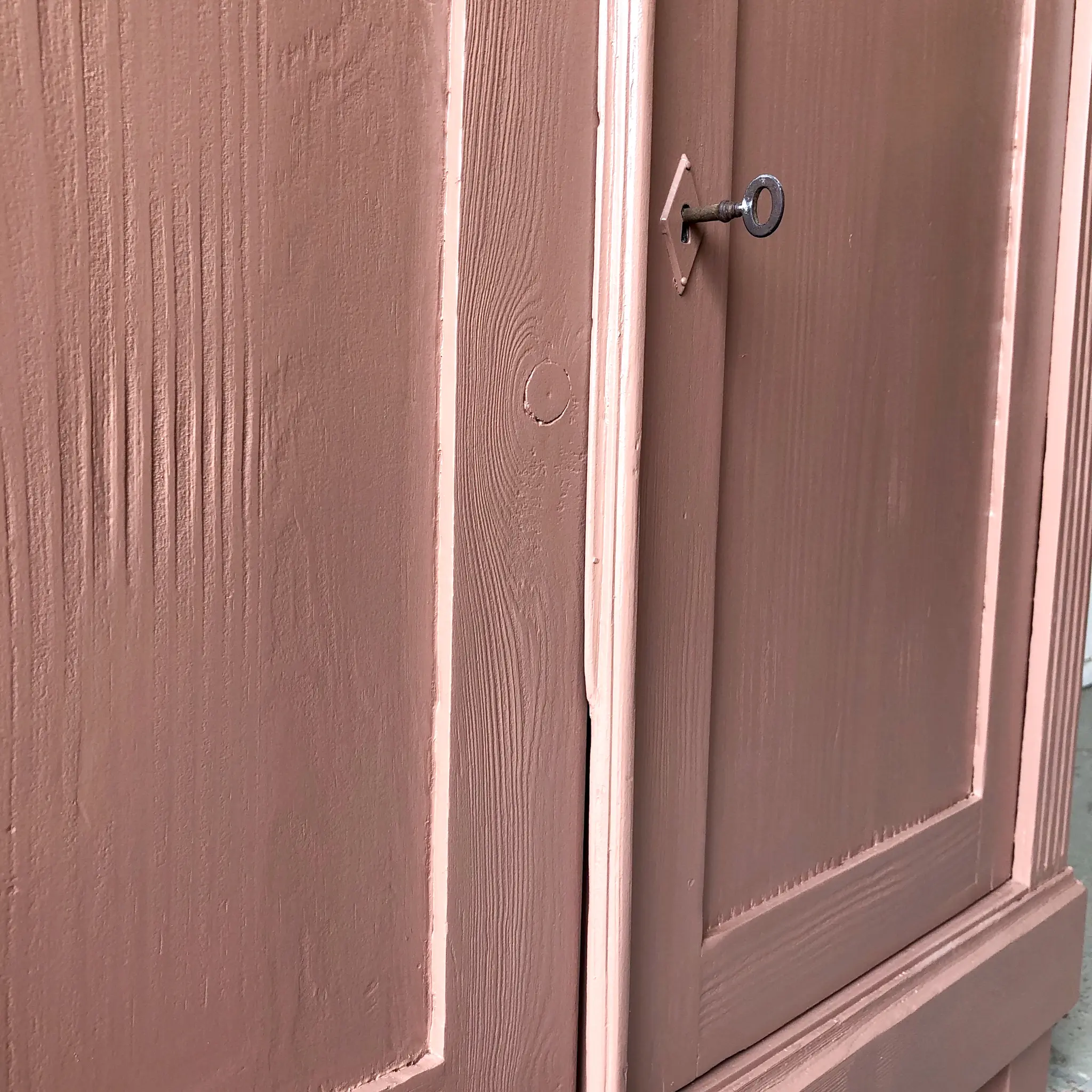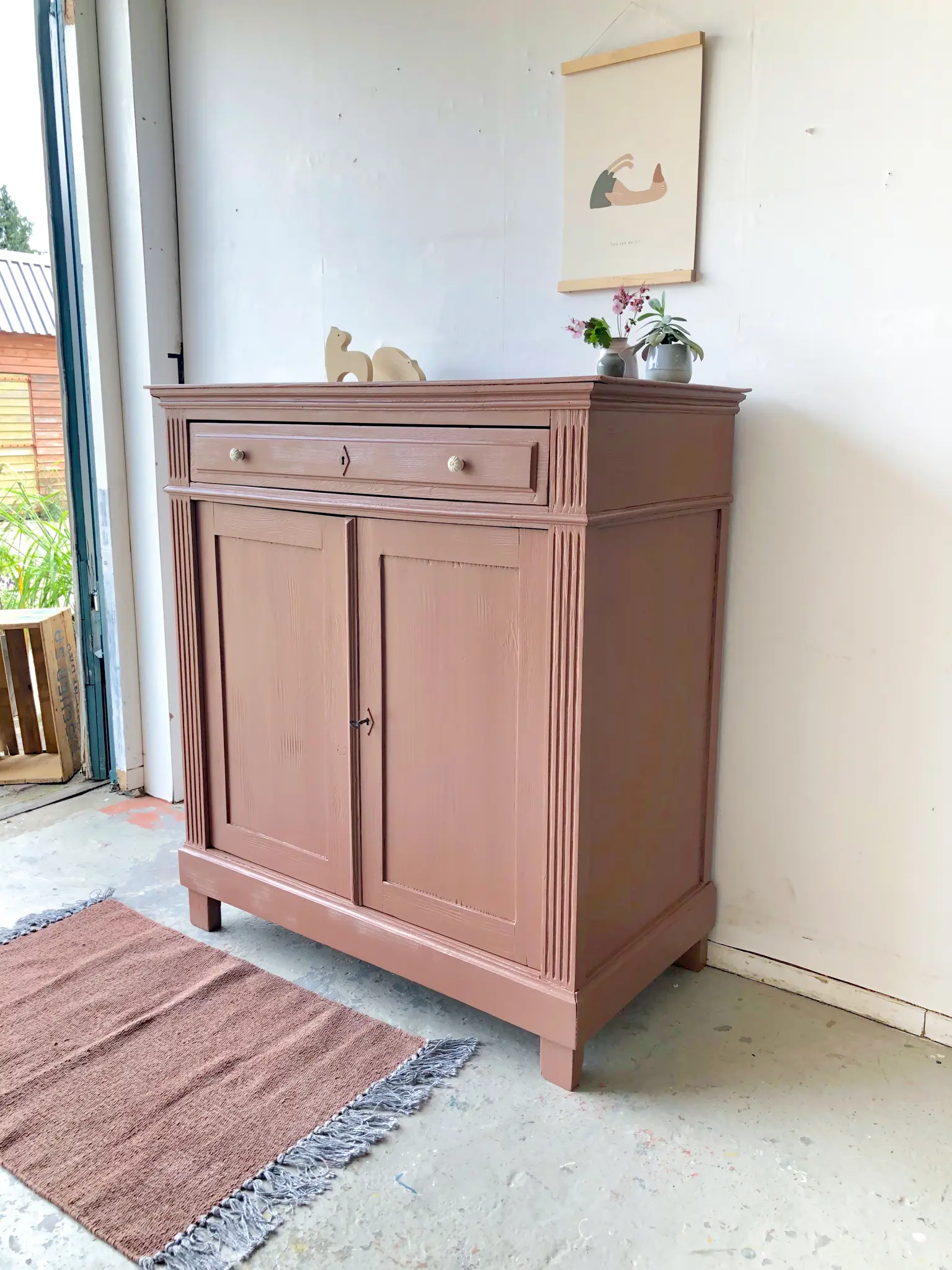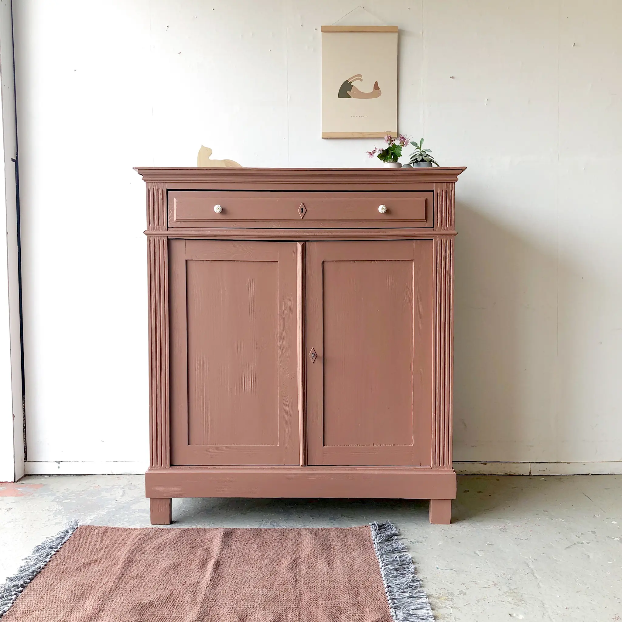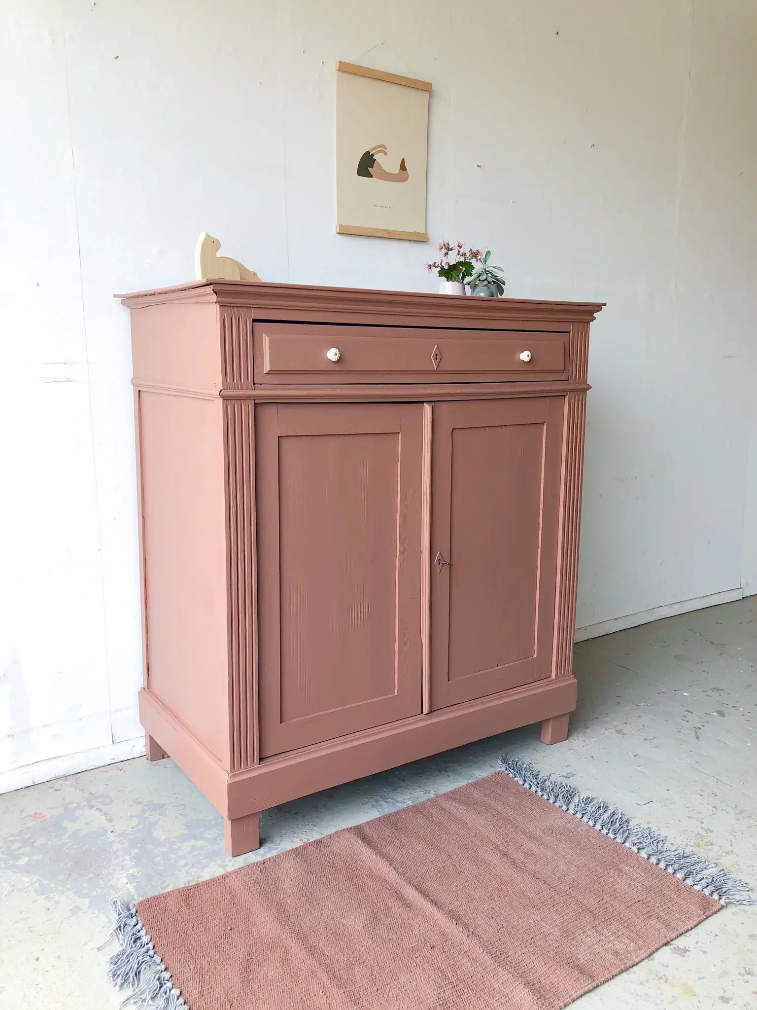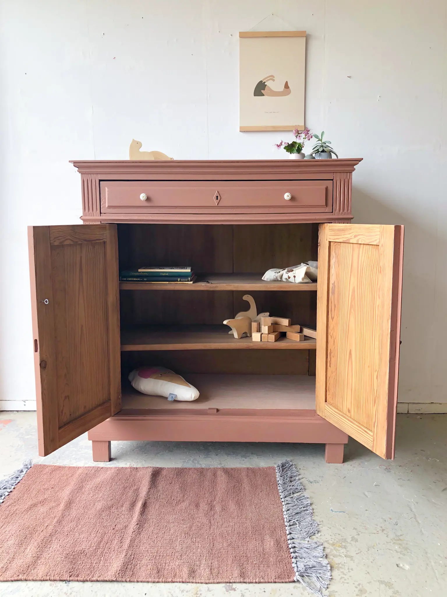 Wat een mooie meidenkast is dit geworden. Super leuk om kleertjes of speelgoed in op te bergen. We hebben het een en ander en deze kast gerepareerd en vervangen. Hij heeft bijvoorbeeld een nieuwe bodem gekregen, de deurtjes zijn recht en zonder klemmen teruggehangen en de lade gaat weer soepel open en dicht. We hebben hem vervolgens deze mooie oud roze kleur gegeven en hem afgewerkt met porseleinen knopjes op de lade. De deur sluit goed door middel van de sleutel. Kort om, helemaal klaar voor gebruik!