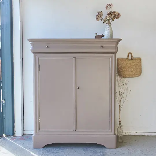 Wat een fijne nieuwe meidenkast is dit. Een net wat groter formaat, samen met de brede lade is er lekker veel opbergruimte. Deze kast past eigenlijk overal, in de kinderkamer maar ook gewoon in de woonkamer of hal. Deze kast heeft er al wat jaren op zitten, dat zie je aan de deurtjes en de mooie oude binnenkant. Hij had daarom ook flink wat liefde nodig. We hebben hem goed schoongemaakt en ontdaan van al zijn oude lagen. Daarnaast is hij behandeld tegen houtworm. De originele planken zijn zo mooi en konden we gelukkig behouden. We hebben ze goed schoongemaakt en gladgeschuurd. Na de overige nodige reparaties hebben we hem de kleur Hazel gegeven. Een hele fijne zachte kleur, niet te zoet en ook niet te saai. We vonden Hazel perfect voor deze kast, het geeft hem een fijne zachte uitstraling. De linkerdeur sluit met de originele haakjes aan de binnenkant en de rechterdeur met een magneetje en knop. Helemaal klaar voor een nieuwe plek!