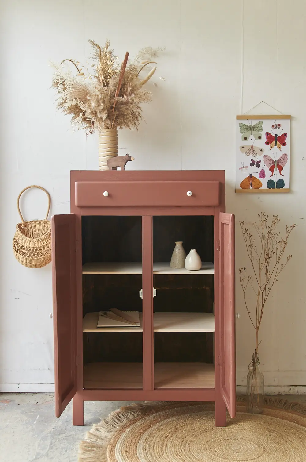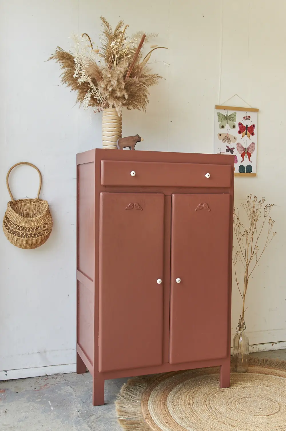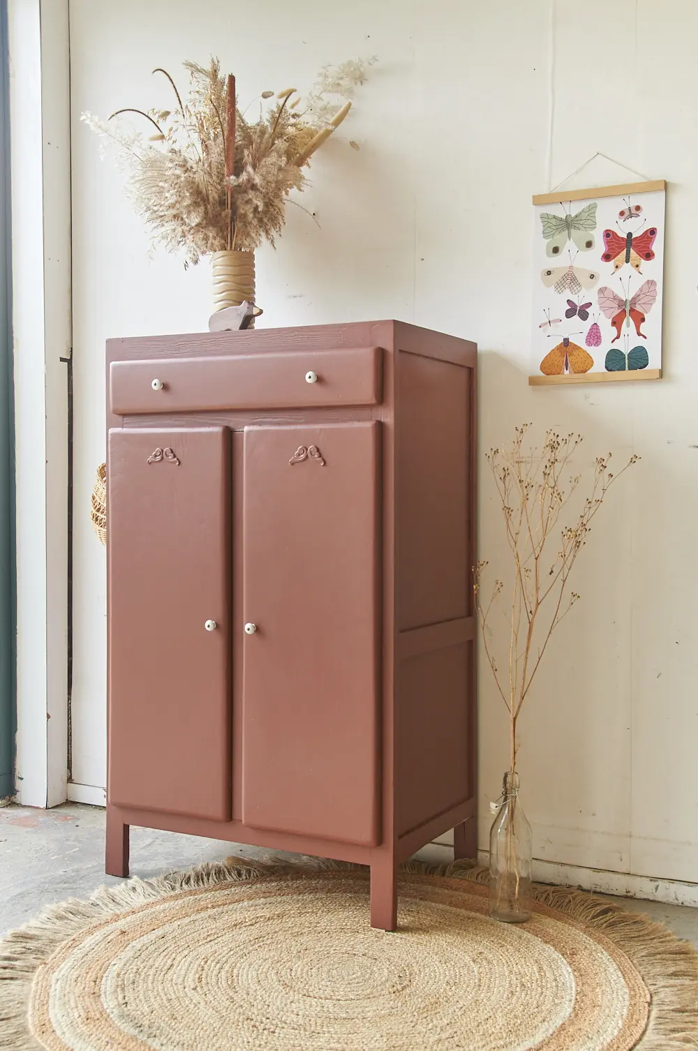 Wat een leukerd! Wij vonden het zo’n leuk kastje dat we er een speelgoedkastje van hebben gemaakt. Een heel fijn formaat in een strakke stijl, een kast die overal past. Deze kast hebben wij kaal gemaakt, goed schoongemaakt en behandeld tegen houtworm. De indeling is nieuw. De twee deurtjes sluiten met een porseleinen knopje en magneet. Deze kast is klaar voor een nieuwe plek in onze fijne kleur Karmozijn. Karmozijn is zo’n mooie, gedurfde kleur. Als je een meubel in de kleur Karmozijn schildert, krijgt het meteen een sterkere uitstraling. Karmozijn lijkt te knallen, maar door de combinatie van rood, paars en bruintinten komt hij sterk, maar zeker niet te hard over. Een diepe kleur met veel karakter. Wil je toch een net wat zachtere tint, dan is Vijg of Roest een heel mooi alternatief.