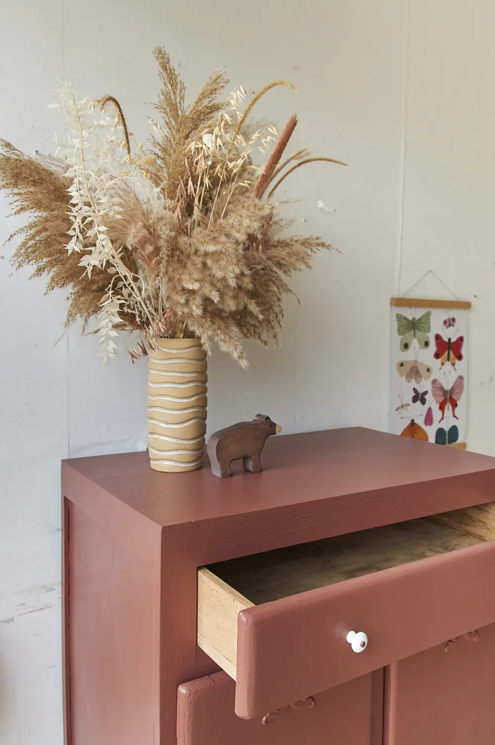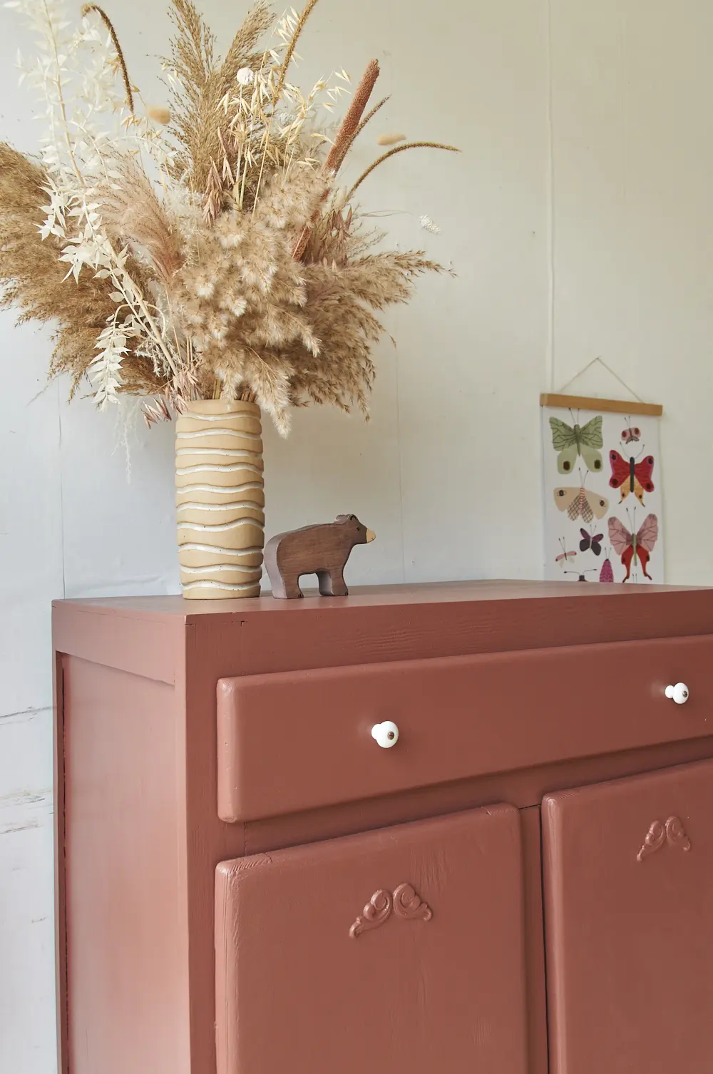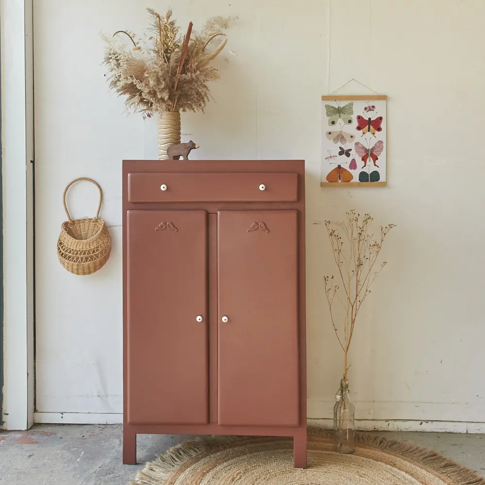 Wat een leukerd! Wij vonden het zo’n leuk kastje dat we er een speelgoedkastje van hebben gemaakt. Een heel fijn formaat in een strakke stijl, een kast die overal past. Deze kast hebben wij kaal gemaakt, goed schoongemaakt en behandeld tegen houtworm. De indeling is nieuw. De twee deurtjes sluiten met een porseleinen knopje en magneet. Deze kast is klaar voor een nieuwe plek in onze fijne kleur Karmozijn. Karmozijn is zo’n mooie, gedurfde kleur. Als je een meubel in de kleur Karmozijn schildert, krijgt het meteen een sterkere uitstraling. Karmozijn lijkt te knallen, maar door de combinatie van rood, paars en bruintinten komt hij sterk, maar zeker niet te hard over. Een diepe kleur met veel karakter. Wil je toch een net wat zachtere tint, dan is Vijg of Roest een heel mooi alternatief.