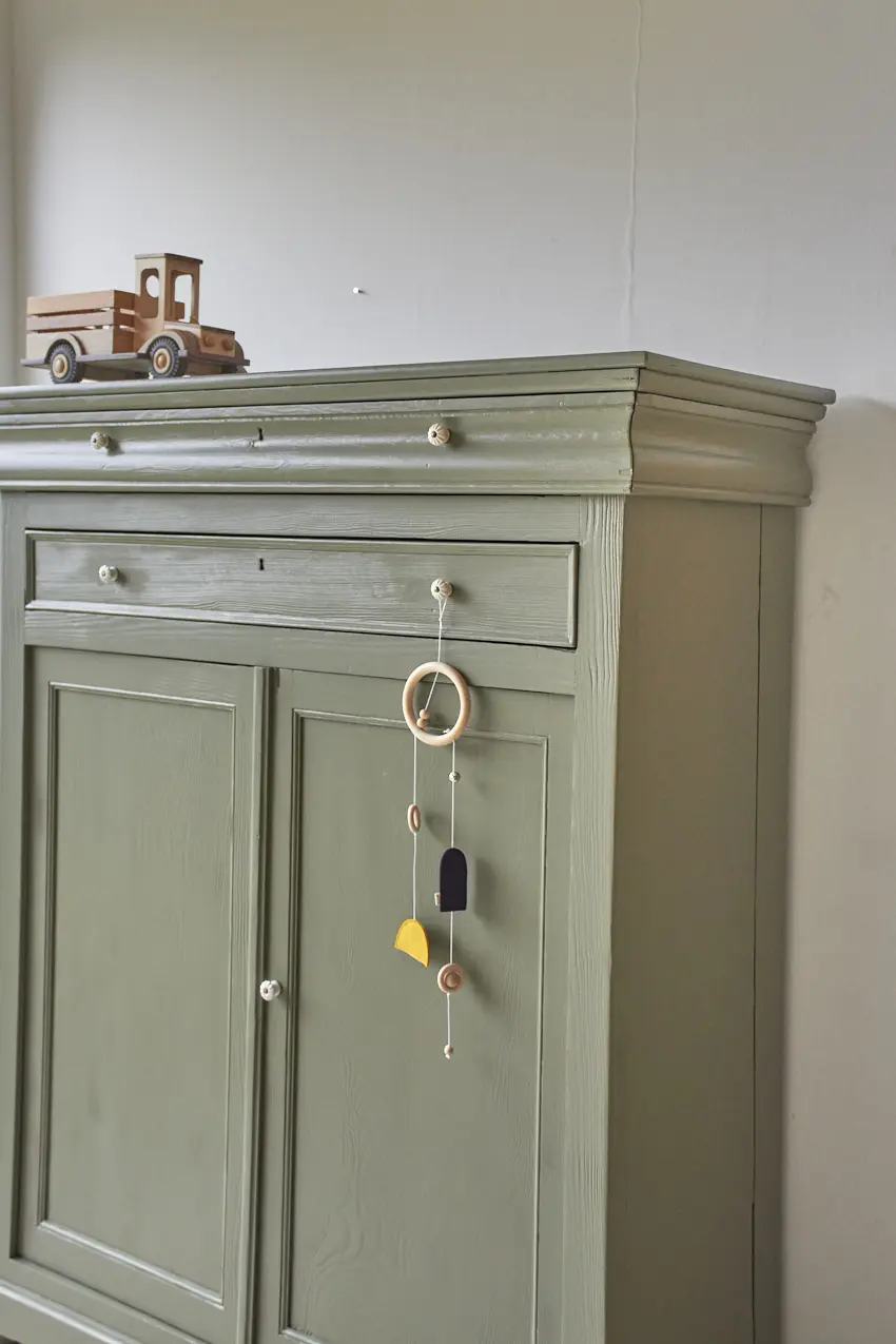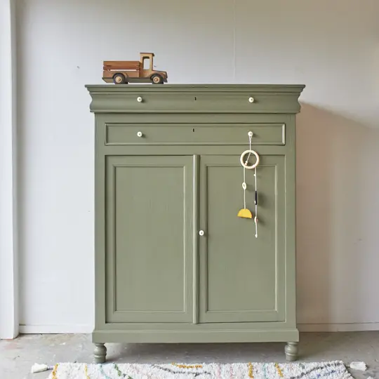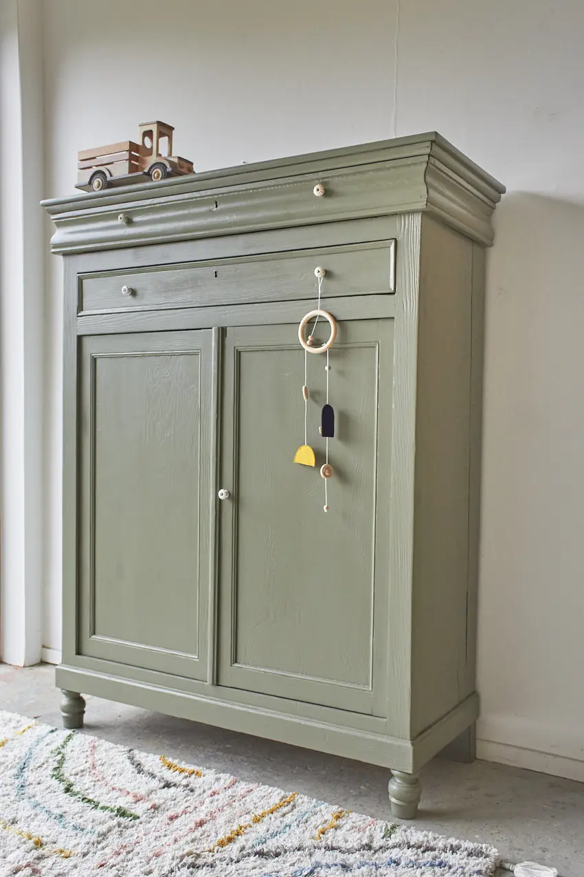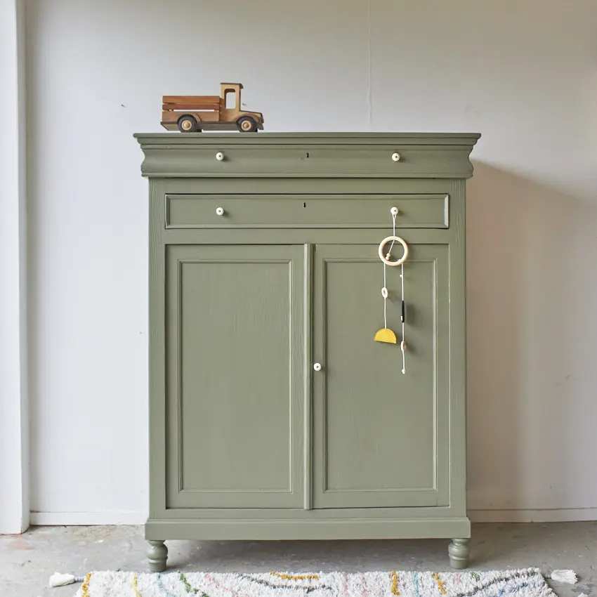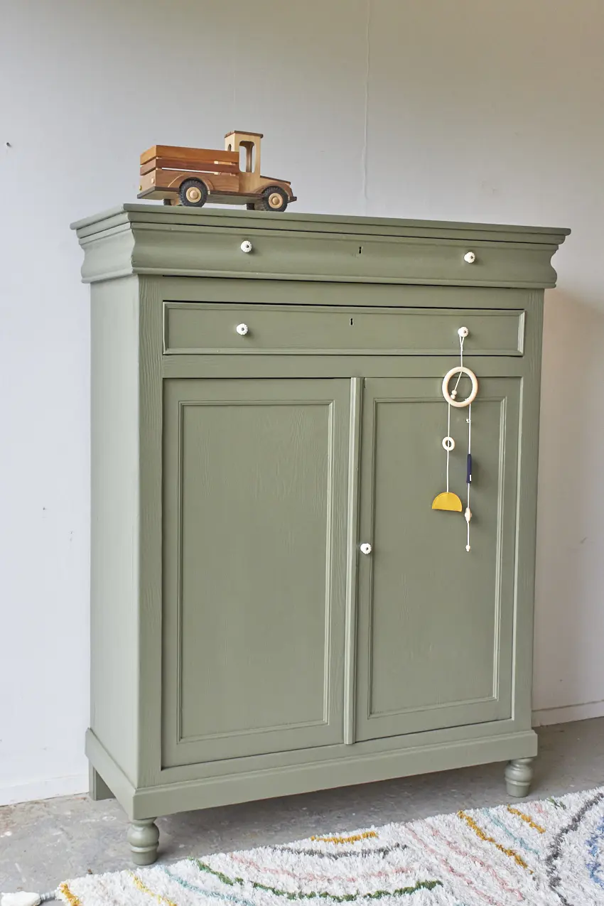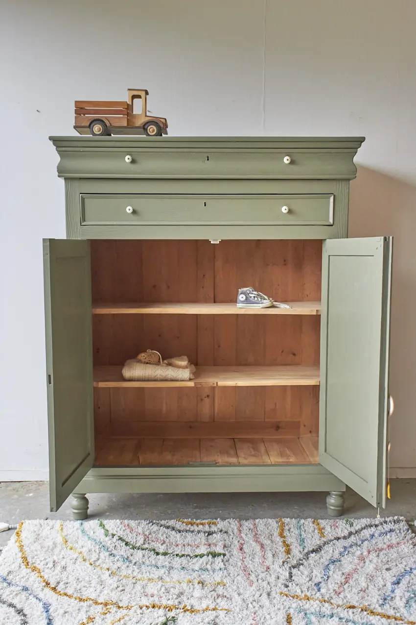 Altijd fijn, deze meidenkasten. Ze kunnen eigenlijk overal wel staan en zijn daarom een fijn meubel voor in huis! Toen deze kast terug kwam van de zandstralers om alle oude verflagen er af te laten halen, hebben we hem grondig schoongemaakt. Daarna is hij behandeld met een anti-houtworm spray. Het dakje zat los net zoals de bodem, dat hebben wij gerepareerd. En de achterpoten waren aan vervanging toe. Rechts zit een kier, dit hebben wij zo gelaten omdat wij dat niet erg vinden. Het is tenslote een vintage meubel. De kast heeft twee mooie ruime lades bovenin. De 2 originele stevige planken konden we behouden. We hebben ze goed opgeschuurd en teruggeplaatst. De rechterdeur sluit met een magneetje en de lades gaan gemakkelijk open en dicht door de porseleine knoppen. Wij hebben de kast in onze kleur rozemarijn geschilderd. Klaar voor een nieuwe plek.