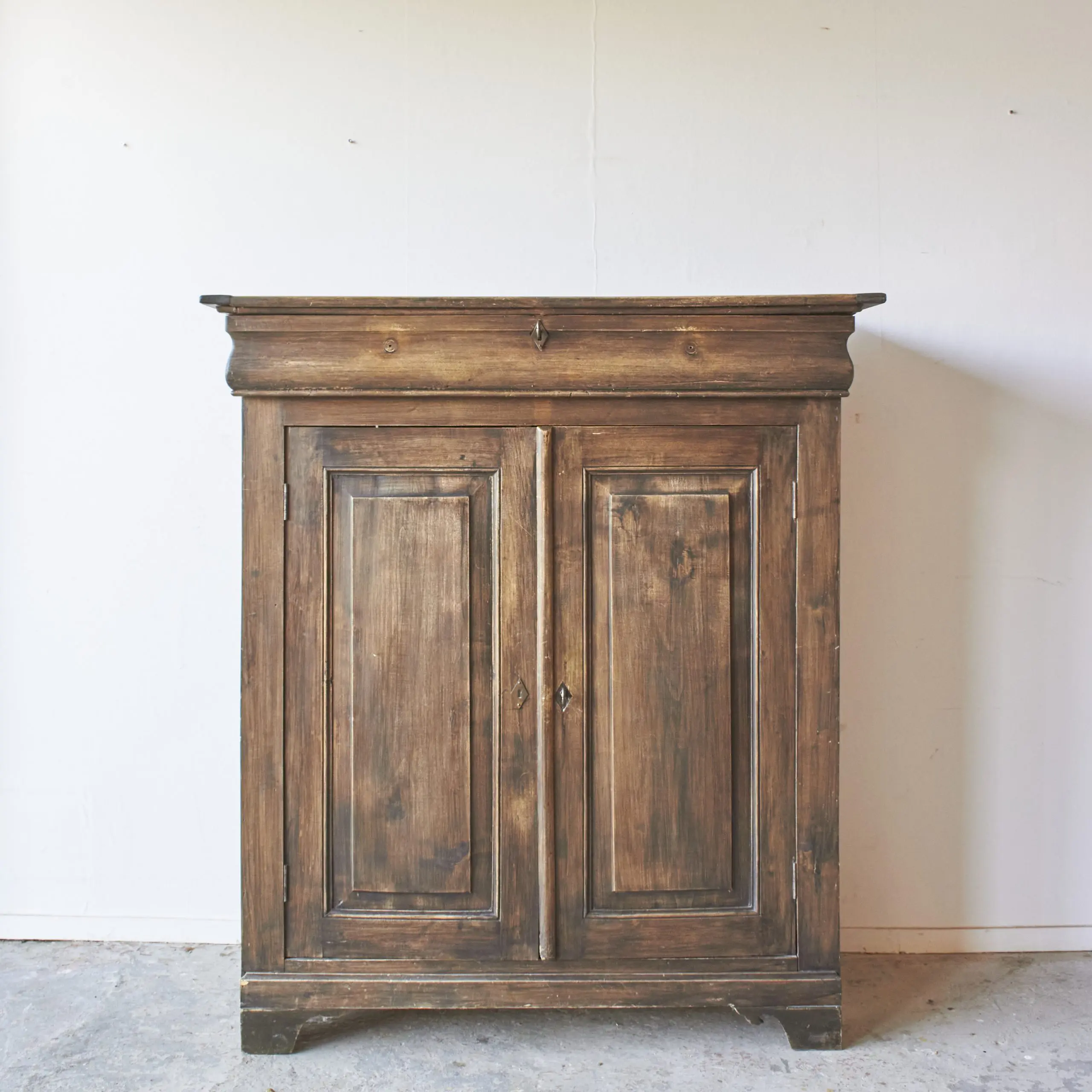 Wat een mooie, authentieke Franse meidenkast! Wat worden we blij van deze strakke, authentieke uitstraling. Achter de paneeldeuren en in de brede lade is er veel opbergruimte. Deze meidenkast is helemaal naar jouw wens samen te stellen.