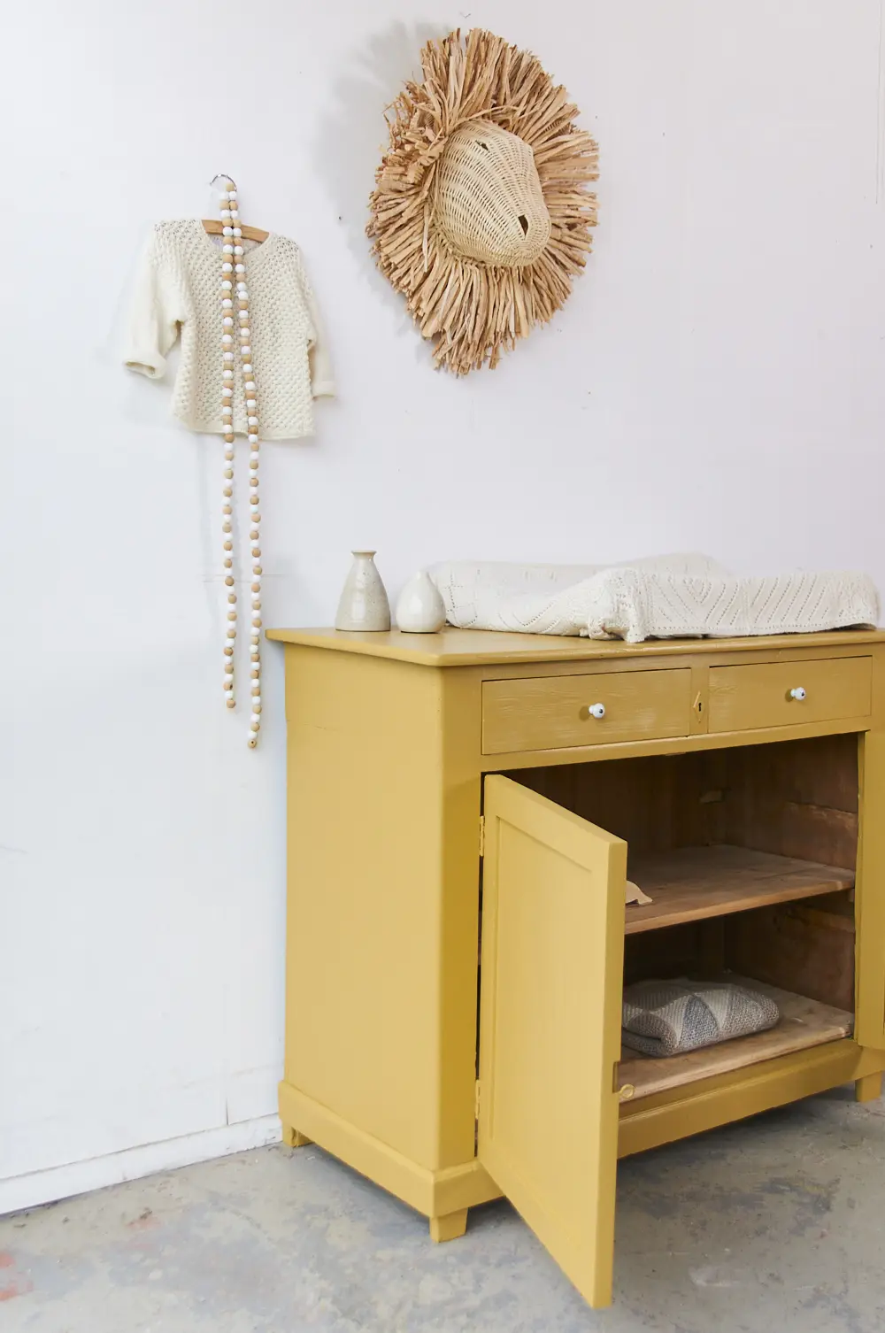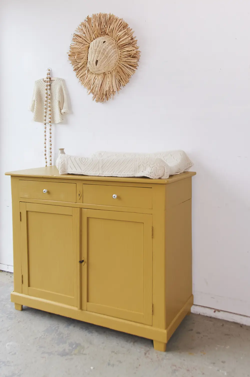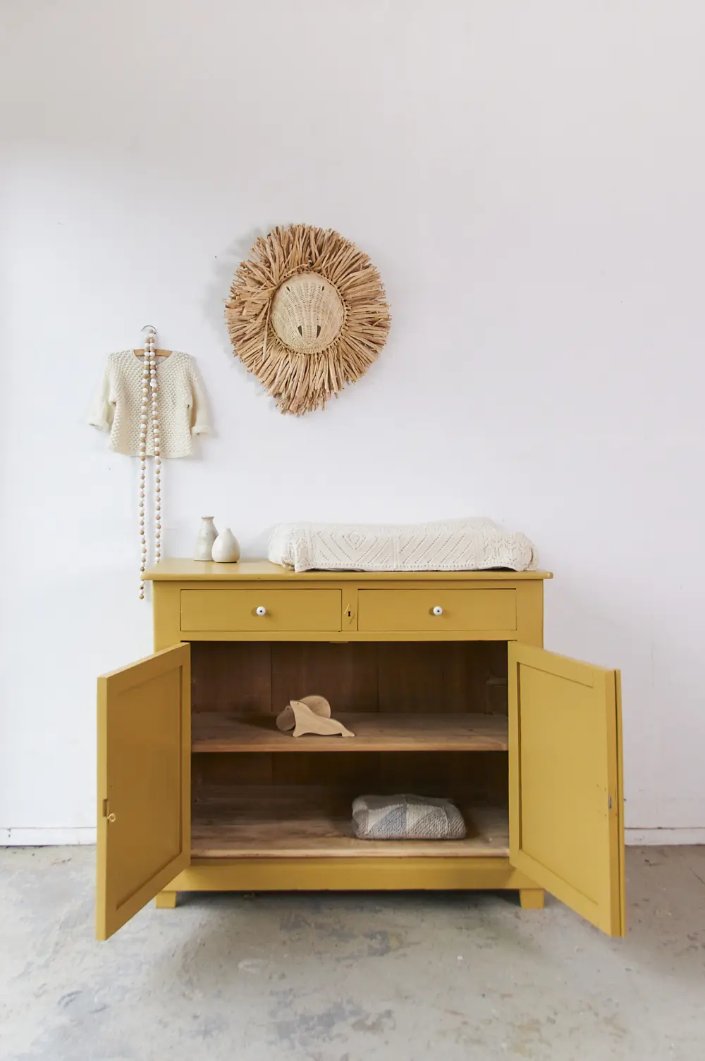 Wat een fijne vintage commode is dit. Wij hebben hem in onze werkplaats grondig schoongemaakt en helemaal nagelopen. Met twee lades en een legplank. Lekker veel ruimte om alle babykleertjes in op te bergen! Wij hebben de commode deze geweldige gele kleur gegeven, die wij “saffraan’ noemen. De deuren sluiten weer goed. Tot slot zijn er op de twee laden sierlijke knopjes van porselein gezet. En zo is deze mooie vintage commode klaar om te schitteren op een mooie babykamer. De stoere leeuw aan de muur is ook bij ons te koop. Die tovert de kamer van je kindje in één keer om tot een echt dierenparadijs. Hij is helemaal gemaakt van rotan en is daardoor niet zwaar. Klik HIER!
