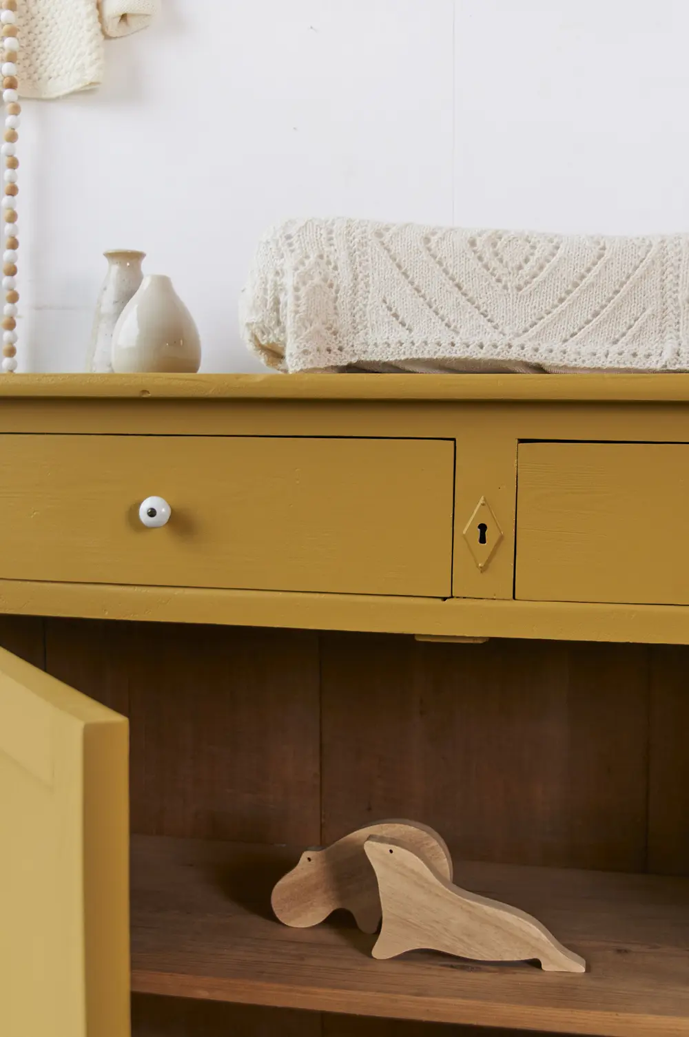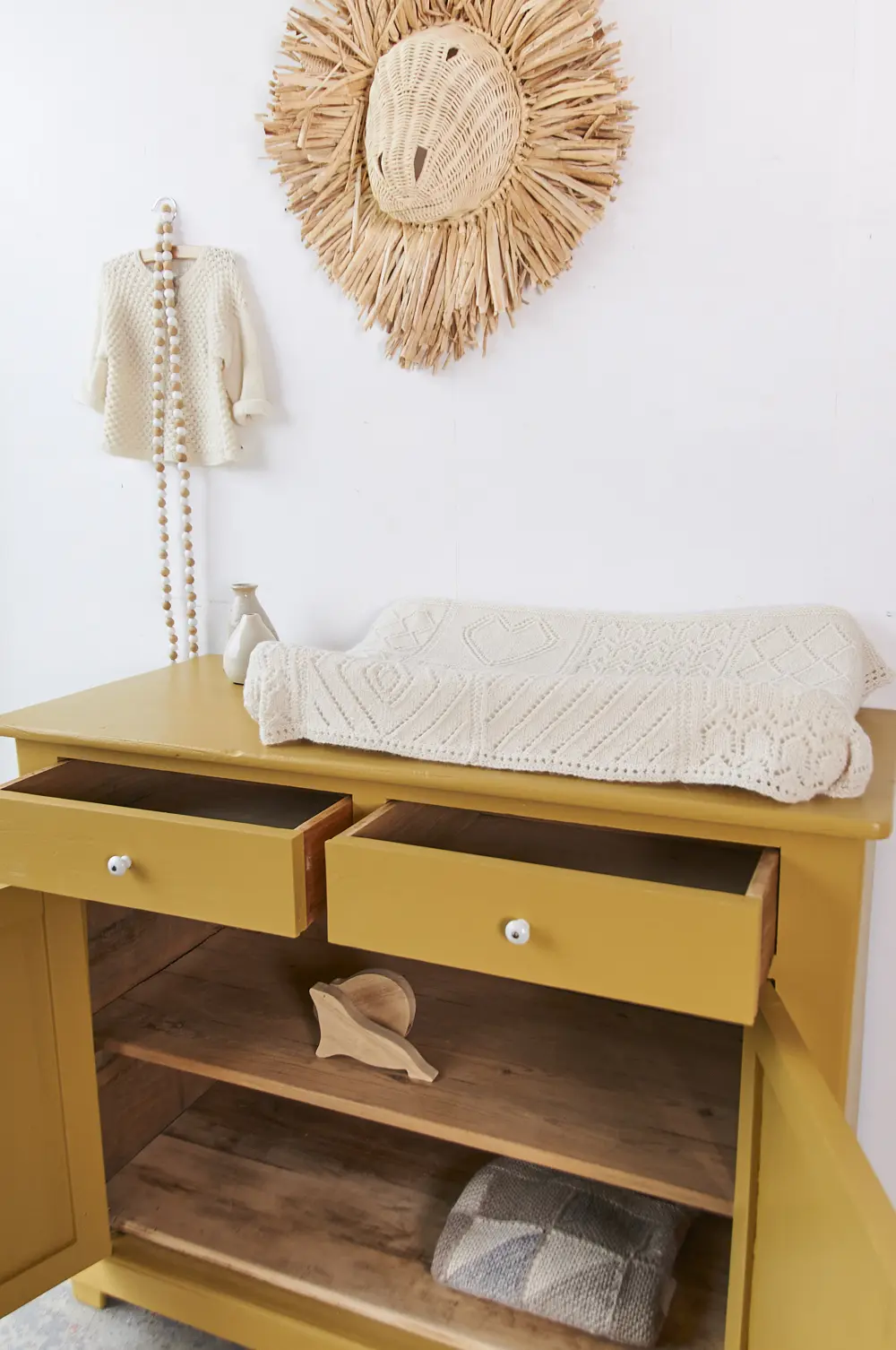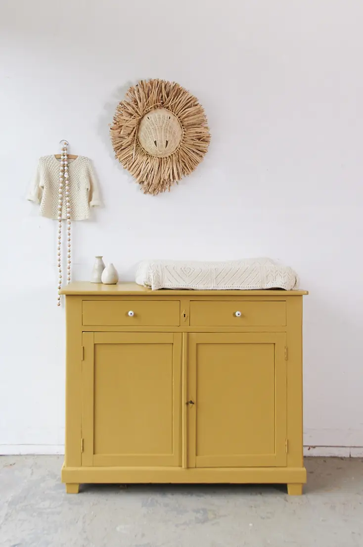 Wat een fijne vintage commode is dit. Wij hebben hem in onze werkplaats grondig schoongemaakt en helemaal nagelopen. Met twee lades en een legplank. Lekker veel ruimte om alle babykleertjes in op te bergen! Wij hebben de commode deze geweldige gele kleur gegeven, die wij “saffraan’ noemen. De deuren sluiten weer goed. Tot slot zijn er op de twee laden sierlijke knopjes van porselein gezet. En zo is deze mooie vintage commode klaar om te schitteren op een mooie babykamer. De stoere leeuw aan de muur is ook bij ons te koop. Die tovert de kamer van je kindje in één keer om tot een echt dierenparadijs. Hij is helemaal gemaakt van rotan en is daardoor niet zwaar. Klik HIER!