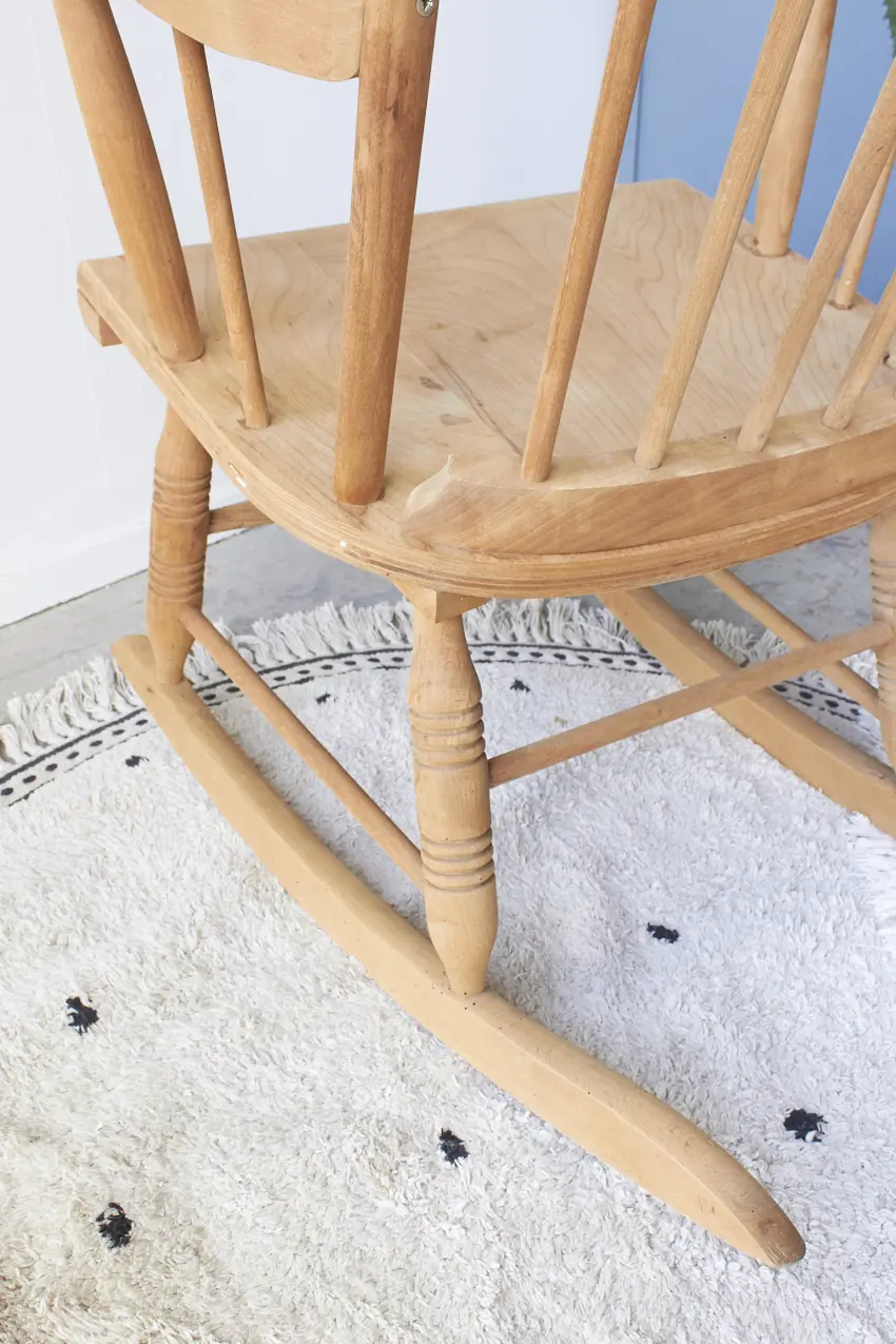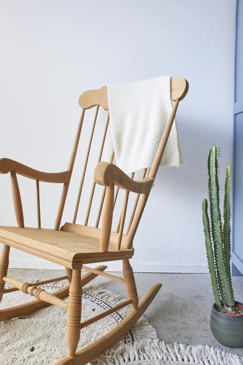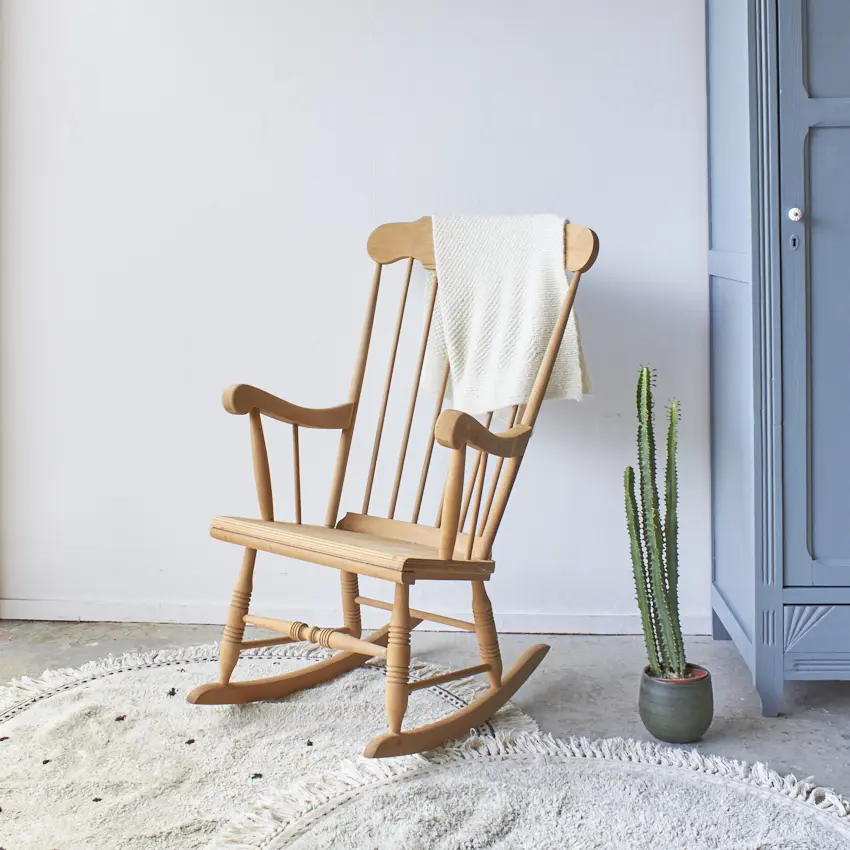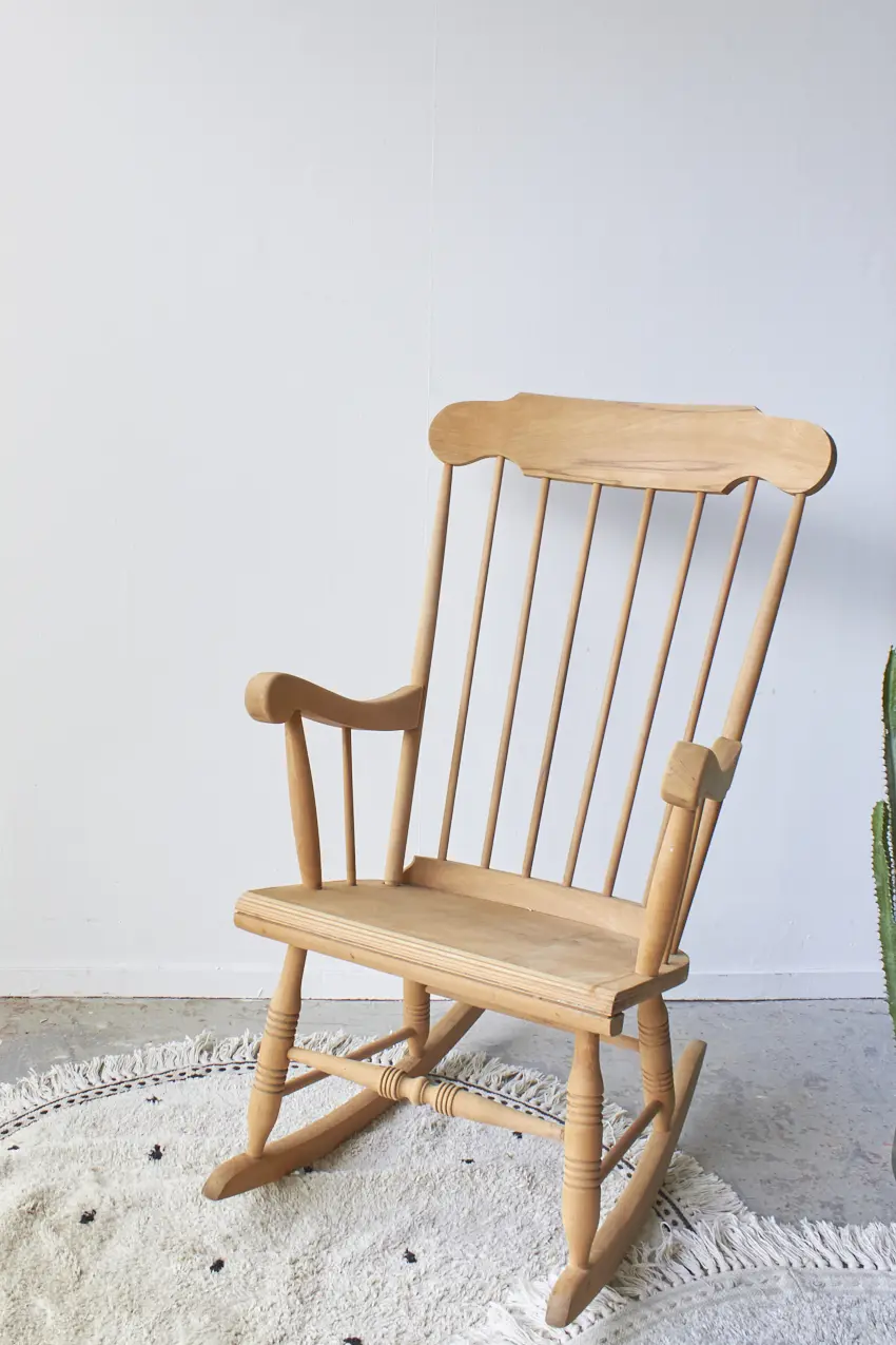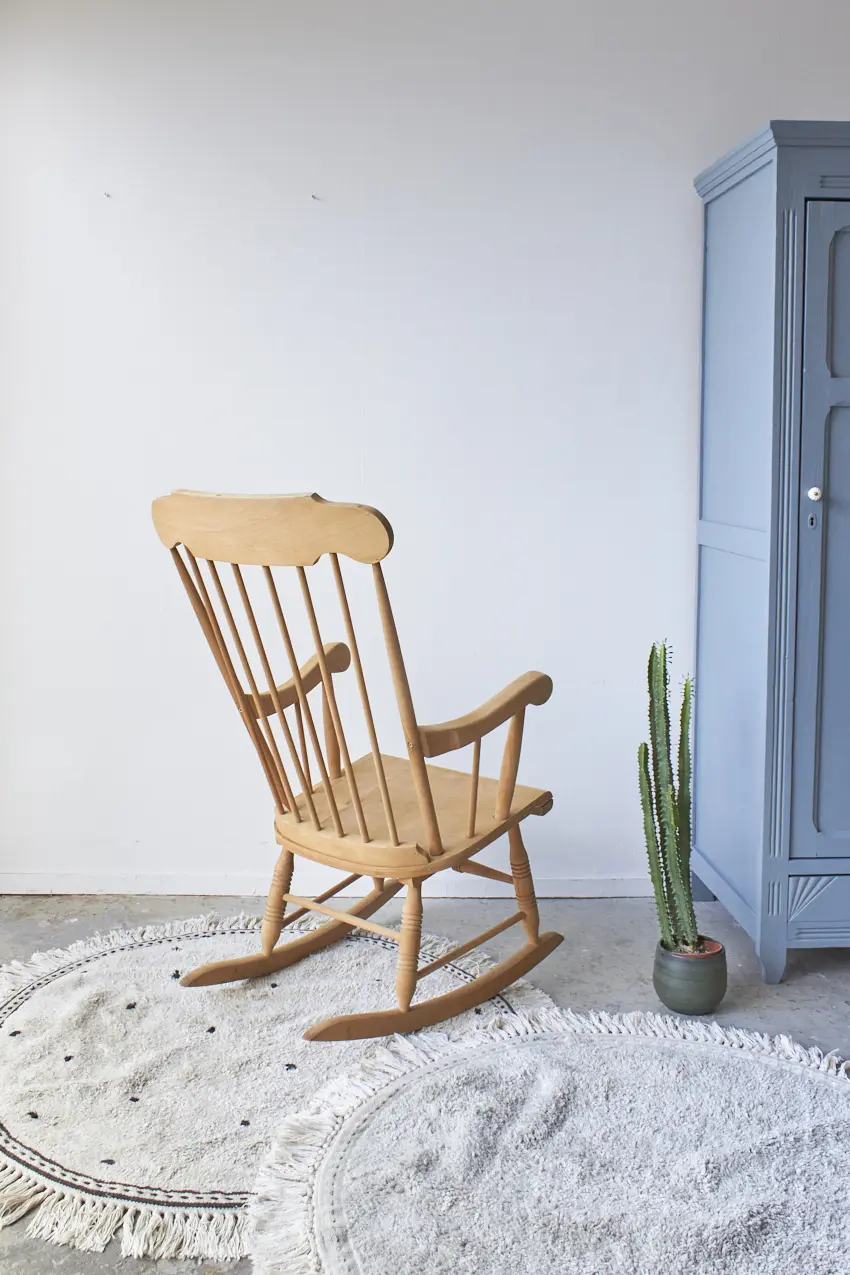 Wat een mooierd, deze vintage schommelstoel uit Frankrijk. Toen hij binnen kwam hebben we hem meteen onder handen genomen. We hebben hem goed schoongemaakt en behandeld tegen houtworm. Deze schommelstoel is nog in goede staat. Er zitten hier en daar wat charmante kleine vlekjes in het hout. Een fijne stoel voor op de babykamer of gewoon in de woonkamer!