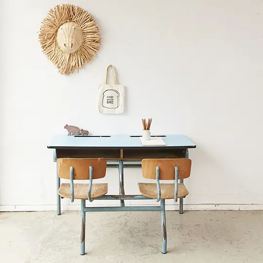 Wat een lieve vintage schoolbank is dit! We hebben het bankje, samen met nog veel andere banken, tafels en stoelen, uit een voormalig klooster / lagere school in Tongeren mogen halen. Wat waren we blij met deze aanwinst! We hebben het schoolbankje goed schoongemaakt en helemaal nagelopen. En zo is dit Belgische schoolbankje met blauw formica blad weer helemaal klaar voor gebruik! Leuk voor kinderen vanaf een jaar of vier. Omdat we in één klap een heleboel van dit soort schoolbankjes konden inkopen, kunnen we ze tijdelijk aanbieden voor een wat scherpere prijs. NB: We hebben meer van deze schoolbanken op voorraad, gebruikssporen kunnen dus wat verschillen.