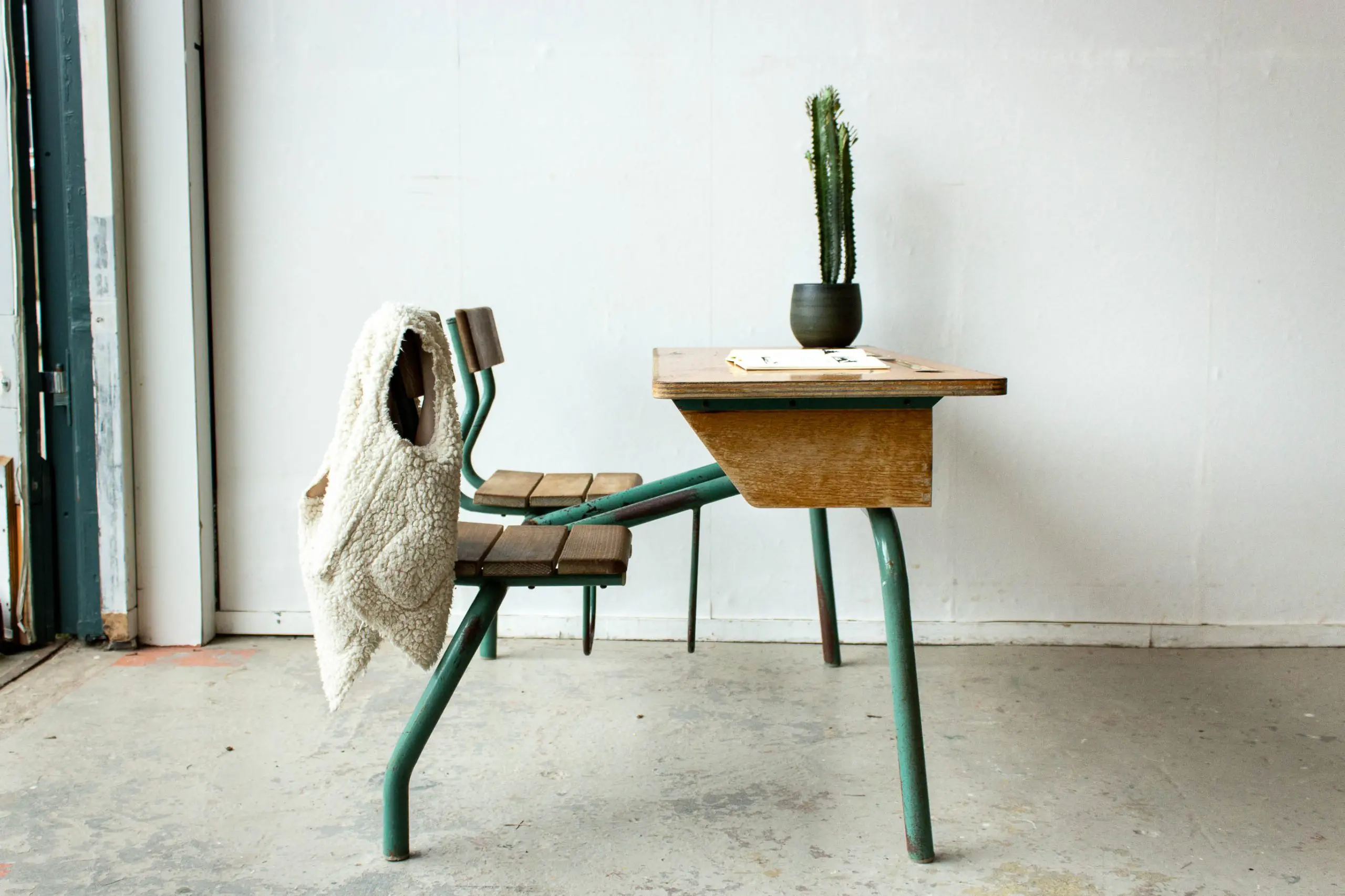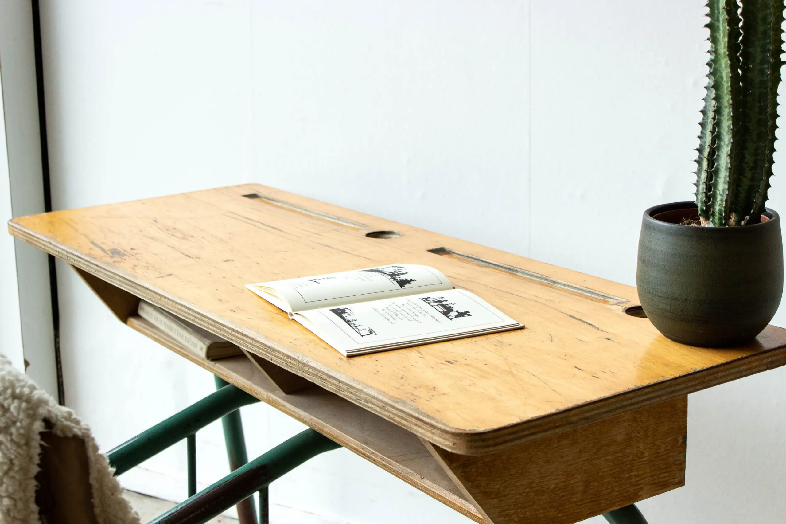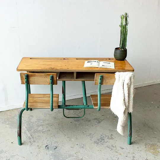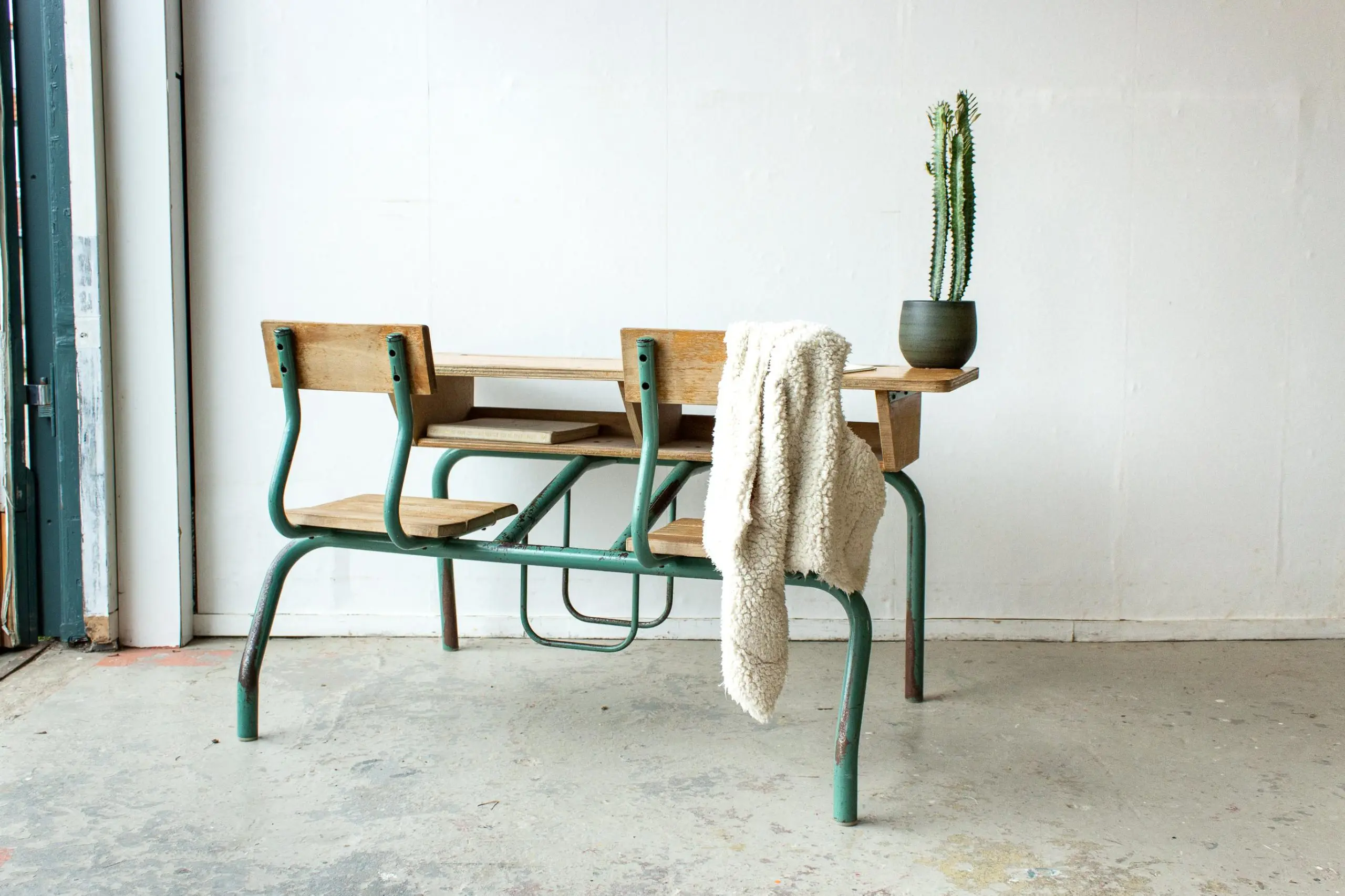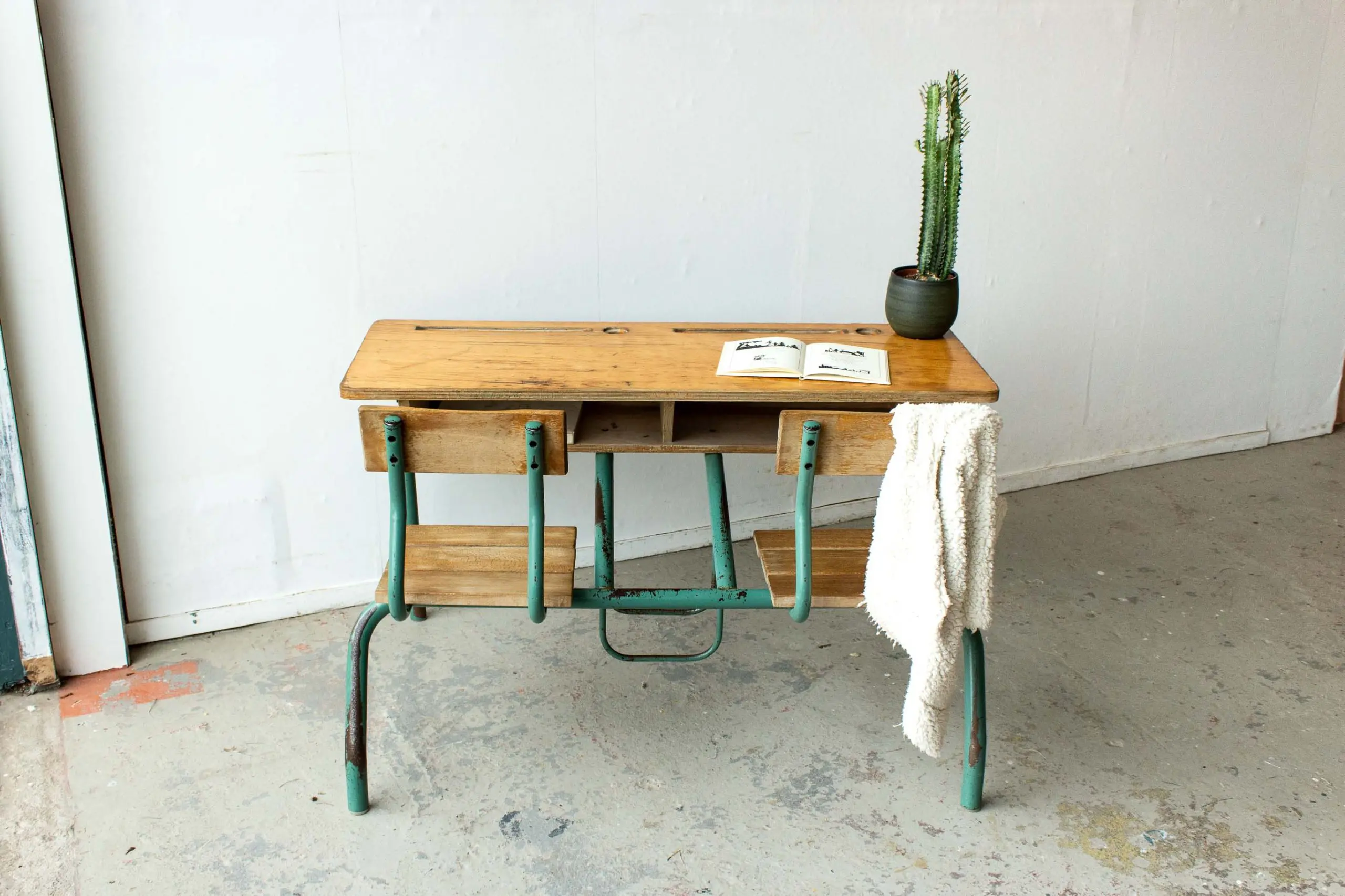 Een leuke vintage schoolbank uit Noord Frankrijk. Jarenlang heeft hij op een Franse lagere school gestaan en hebben er vele kinderen aan zitten werken. Wij hebben de schoolbank helemaal nagelopen en grondig schoongemaakt. Daarna is zowel het hout als het groene metalen frame met een voedende natuurlijke olie behandeld. Heel handig zijn de opbergruimtes onder de werkbladen. Ideaal om alle tekenspullen in op te bergen. En nu is ie weer helemaal klaar om een plekje te krijgen op een leuke kinderkamer!