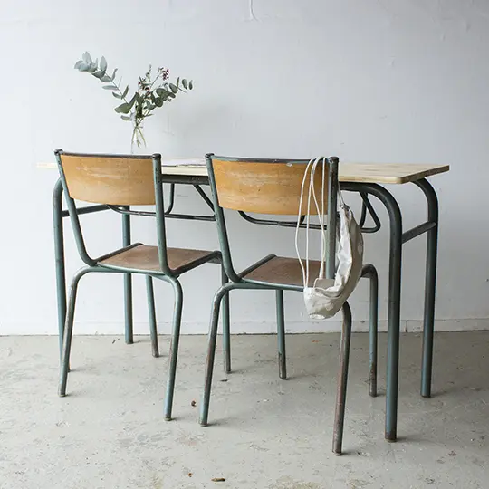 Wat een leuke vintage schooltafel. Deze tafel komt van een school in de buurt van Limoges. De zolder werd daar leeggehaald en wij konden een partij tafels en stoelen inslaan. Wat een geluk, want wat zijn ze leuk! Omdat het blad van deze tafel flink beschadigd was, hebben we er een nieuw stevig houten blad op gezet. Deze hebben we vervolgens in de blanke lak gezet. Onder het blad bevinden zich twee originele opbergvakken, waar tekenblokken en boeken in gelegd kunnen worden. Net als de stoelen, is het frame van de tafel grijsgroen. En zo is het setje weer helemaal klaar voor gebruik. Leuk voor kinderen vanaf 6 jaar, om aan te knutselen en tekenen bijvoorbeeld. De stoelen zijn bij de prijs inbegrepen.