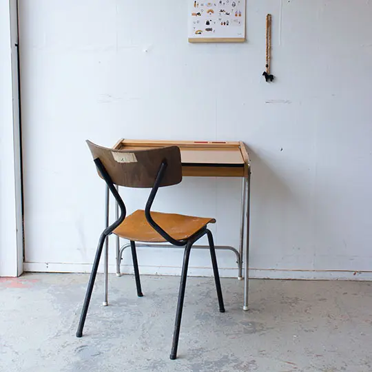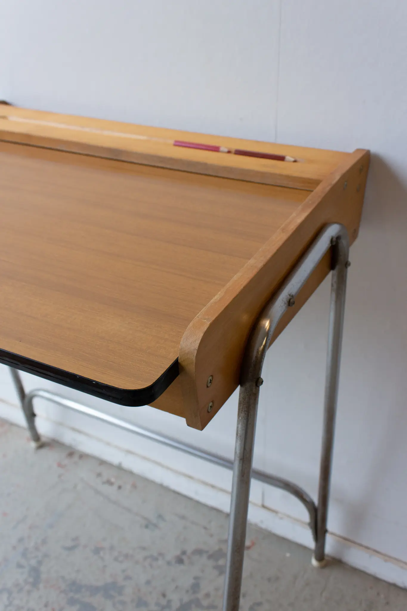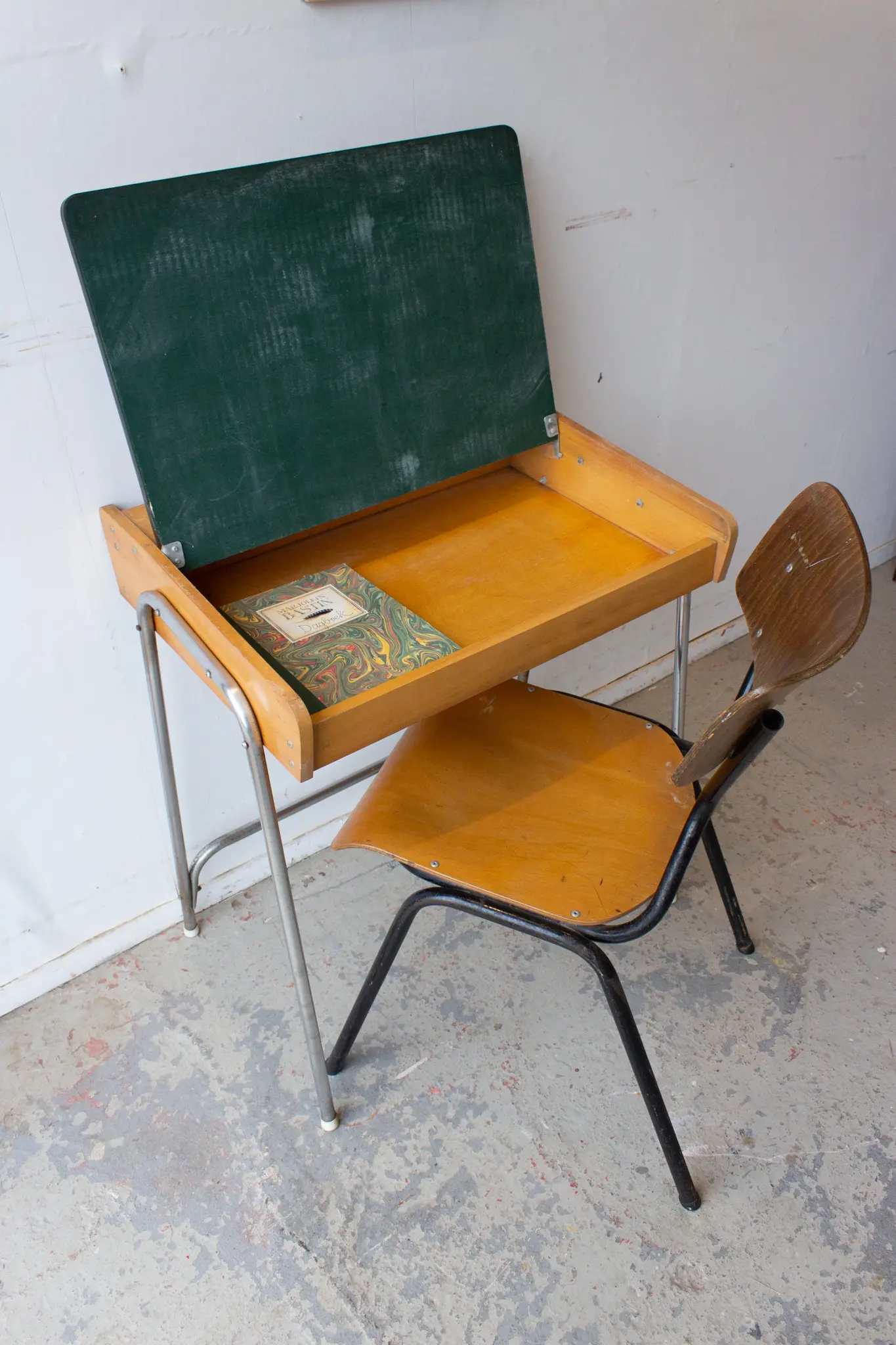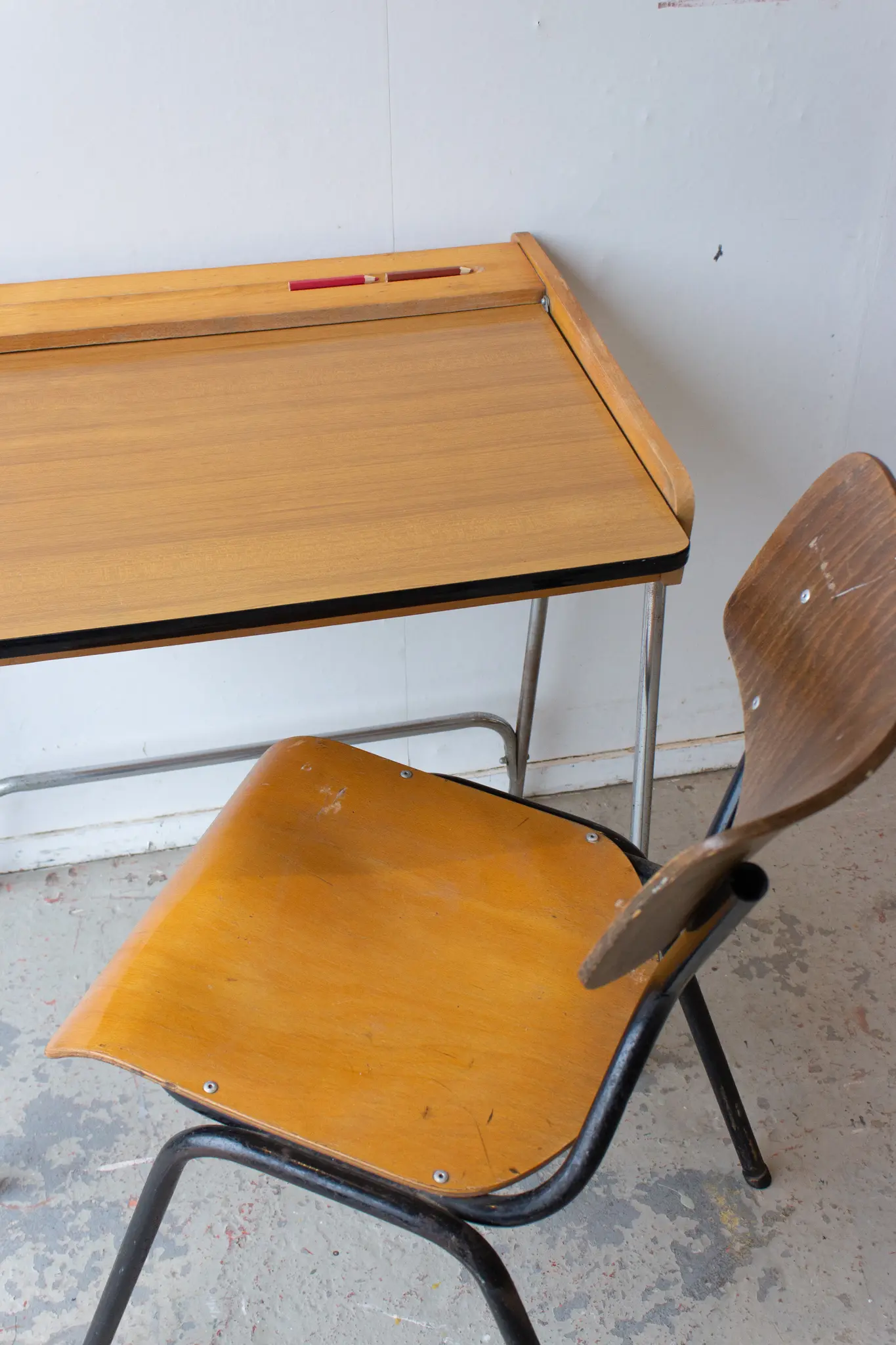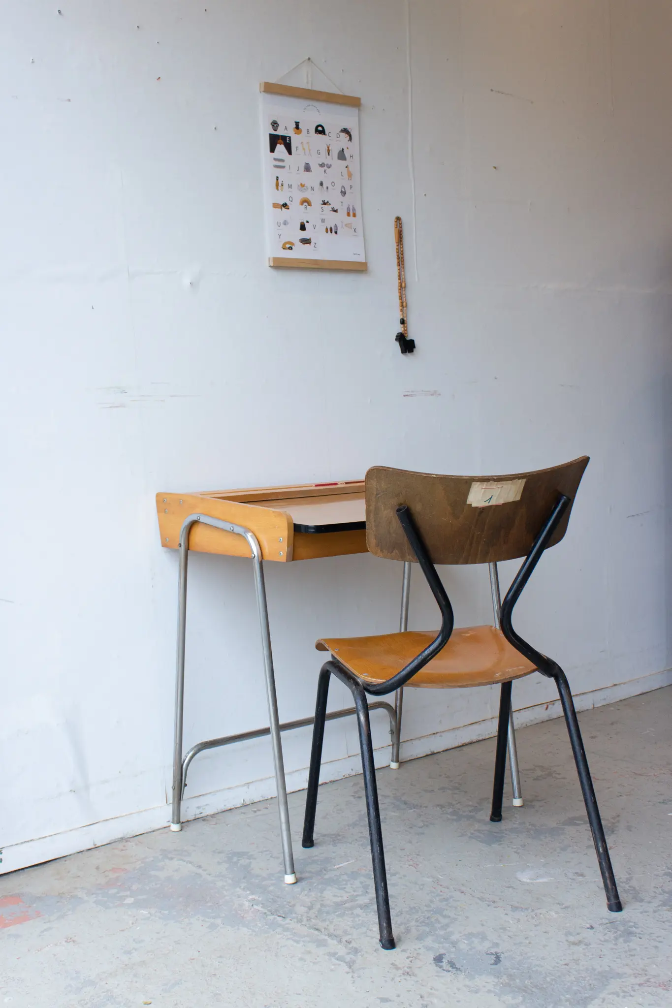 Wat een mooie ruime eenpersoons schooltafel is dit. Hij is nog in zo’n goede staat! Onder de klep is er genoeg ruimte voor alle boeken en tekenspullen. Samen met deze stoel is dit een heel leuk setje voor een kind vanaf een jaar of 6.