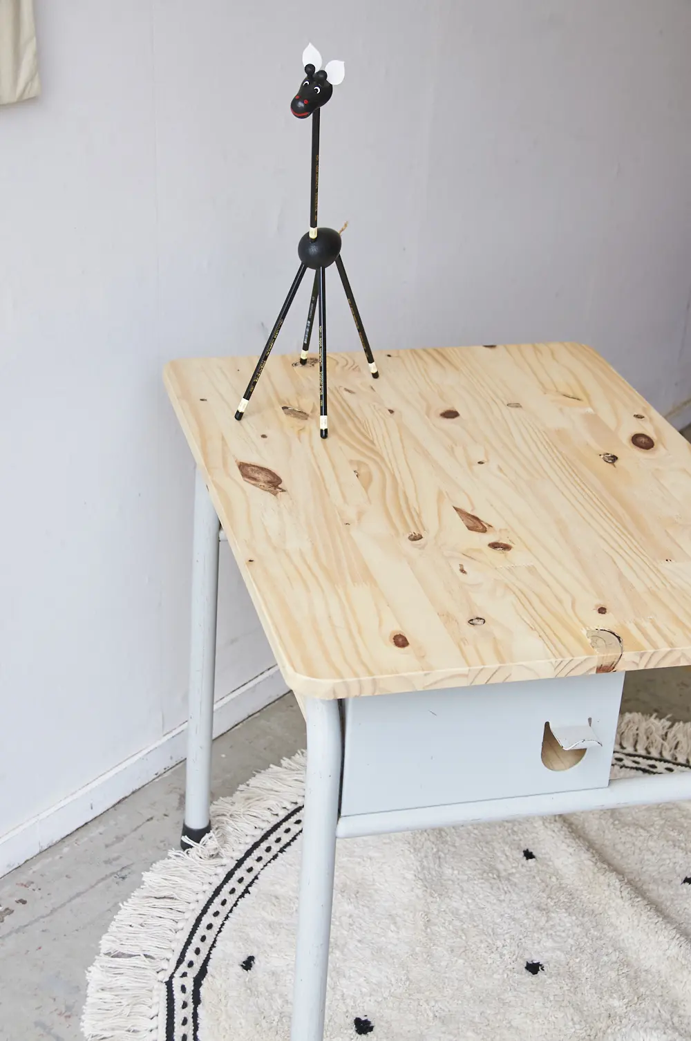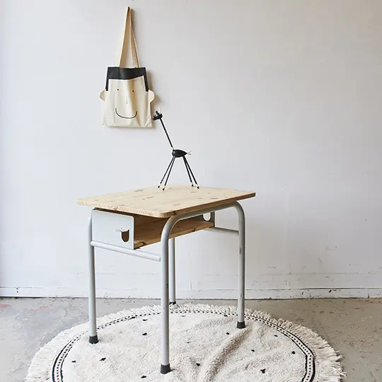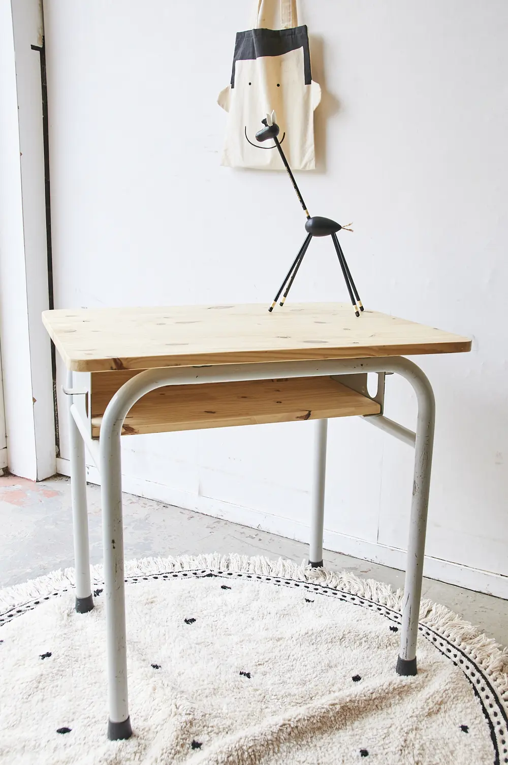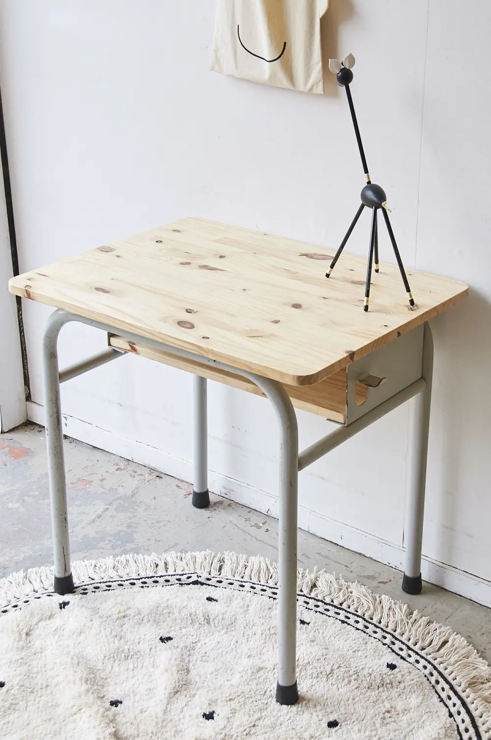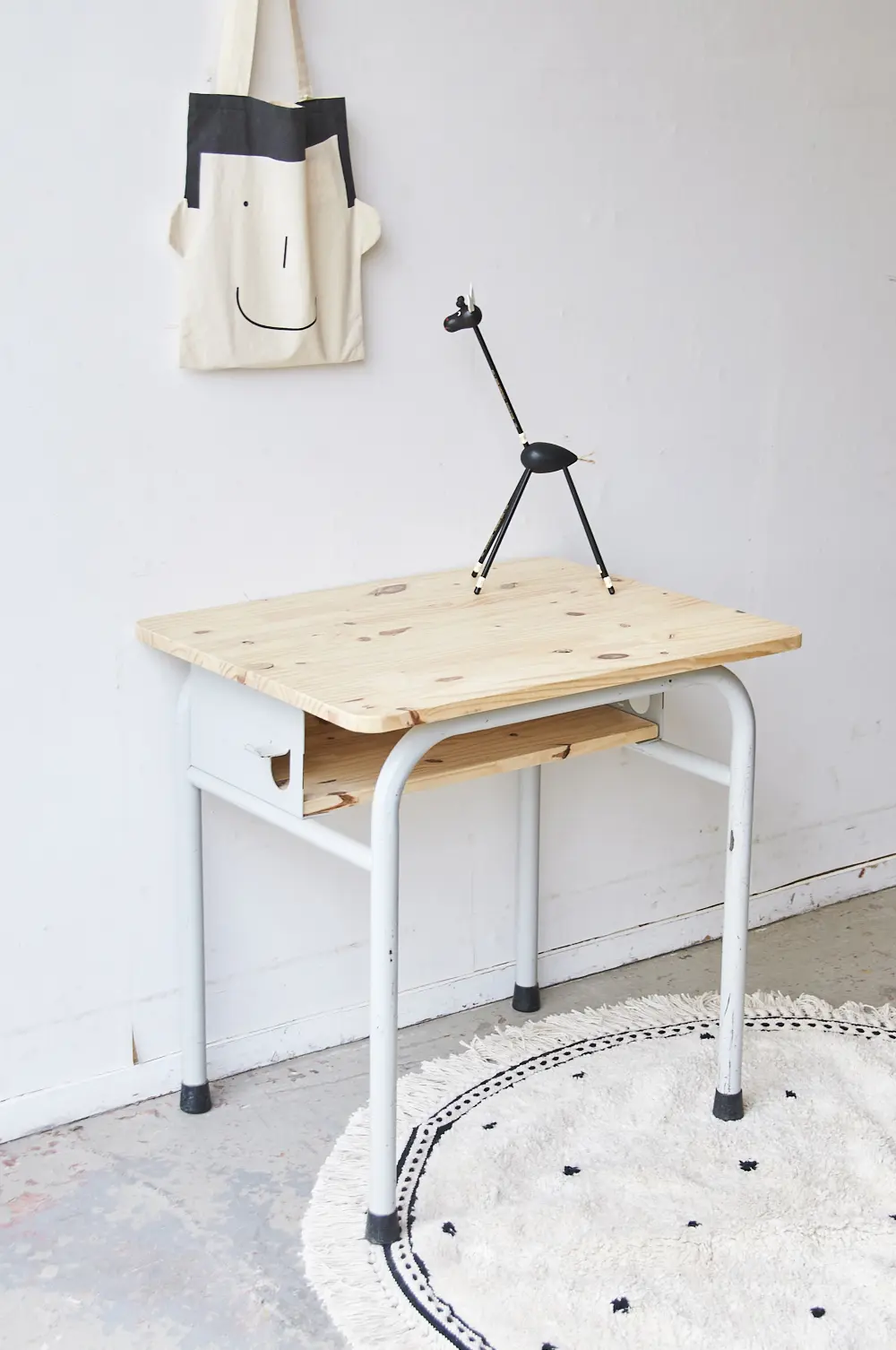 Dit leuke vintage schooltafeltje komt uit Midden-Frankrijk, uit de buurt van Limoges. Daar wisten we een stel van dit soort tafels in meerdere kleuren in te slaan. Het werkblad en het vak eronder waren niet mooi meer, dus die hebben wij vervangen. En daarna met een beschermende transparante lak behandeld, zodat het weer tegen een stootje kan.