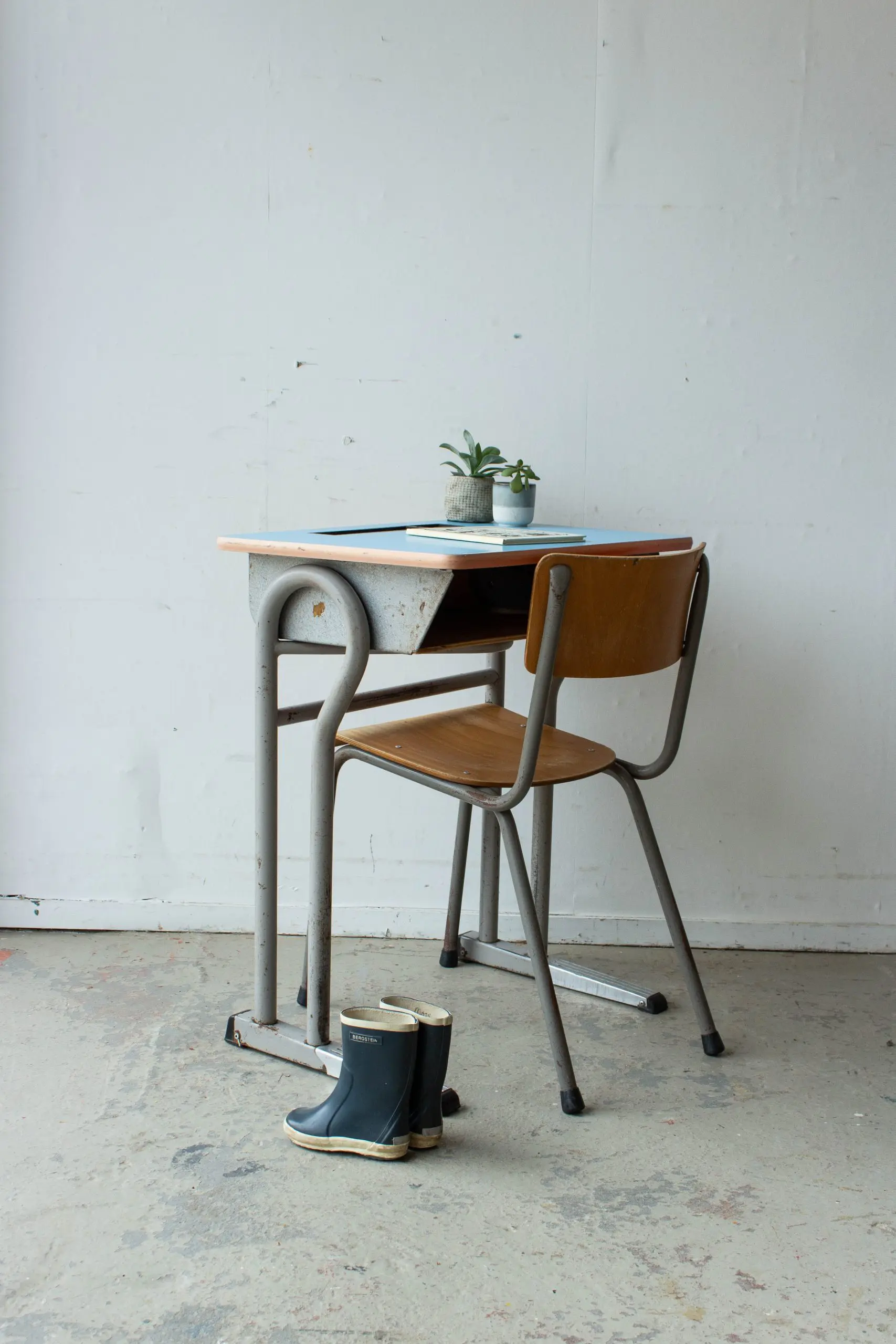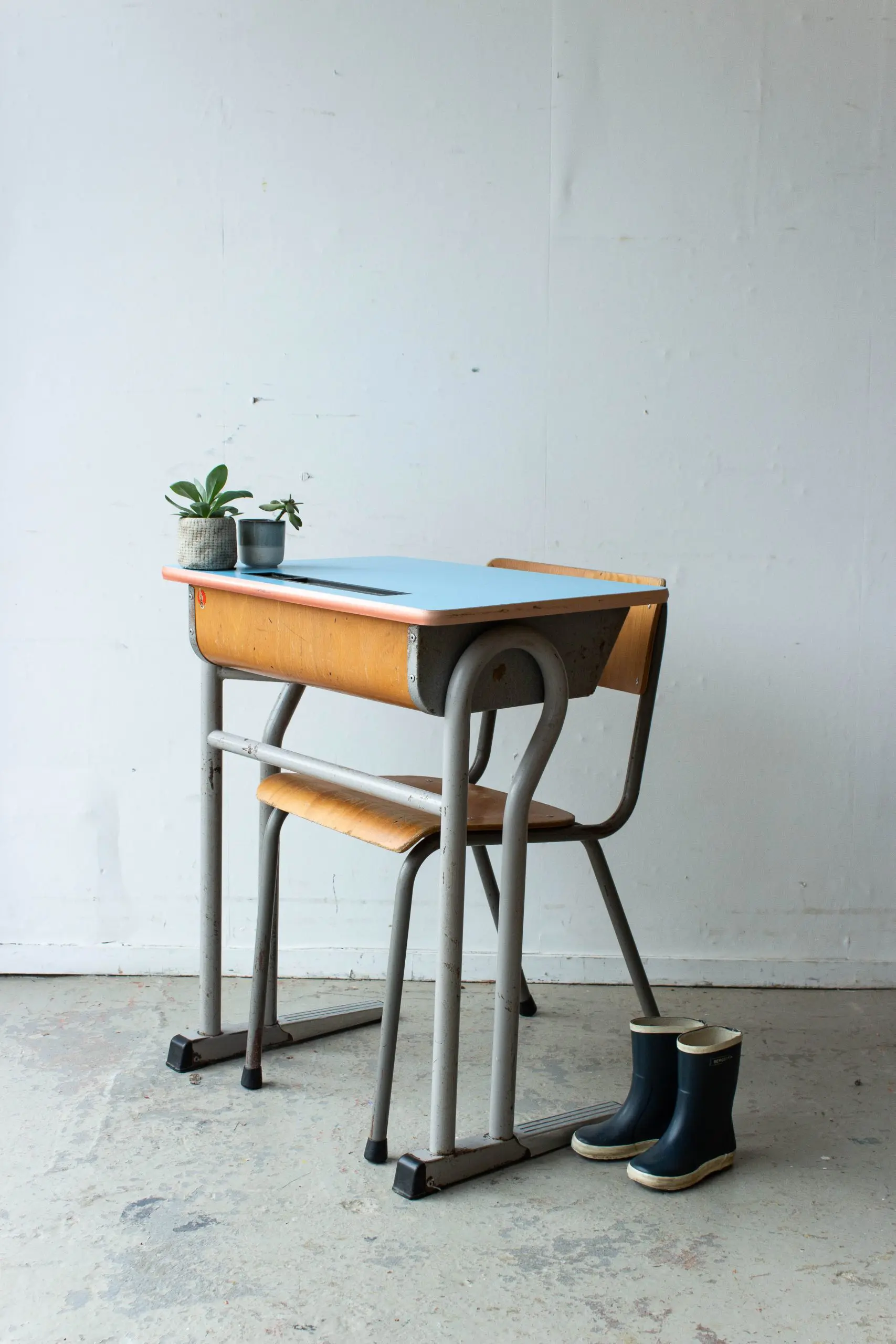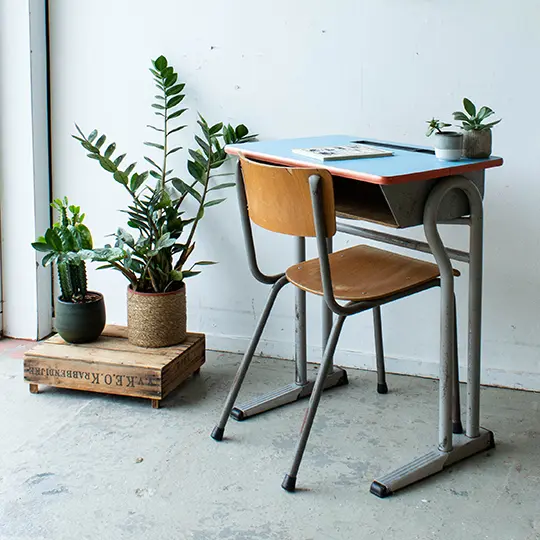 Wat een lief vintage schooltafeltje is dit! We hebben het tafeltje, samen met nog veel tafels en stoelen, uit een voormalig klooster / lagere school in Tongeren mogen halen. Wat waren we blij met deze aanwinst! We hebben het schooltafeltje goed schoongemaakt en helemaal nagelopen. En zo is dit Belgische schooltafeltje met blauw blad weer helemaal klaar voor gebruik! Leuk voor kindjes tussen de vier en acht jaar.