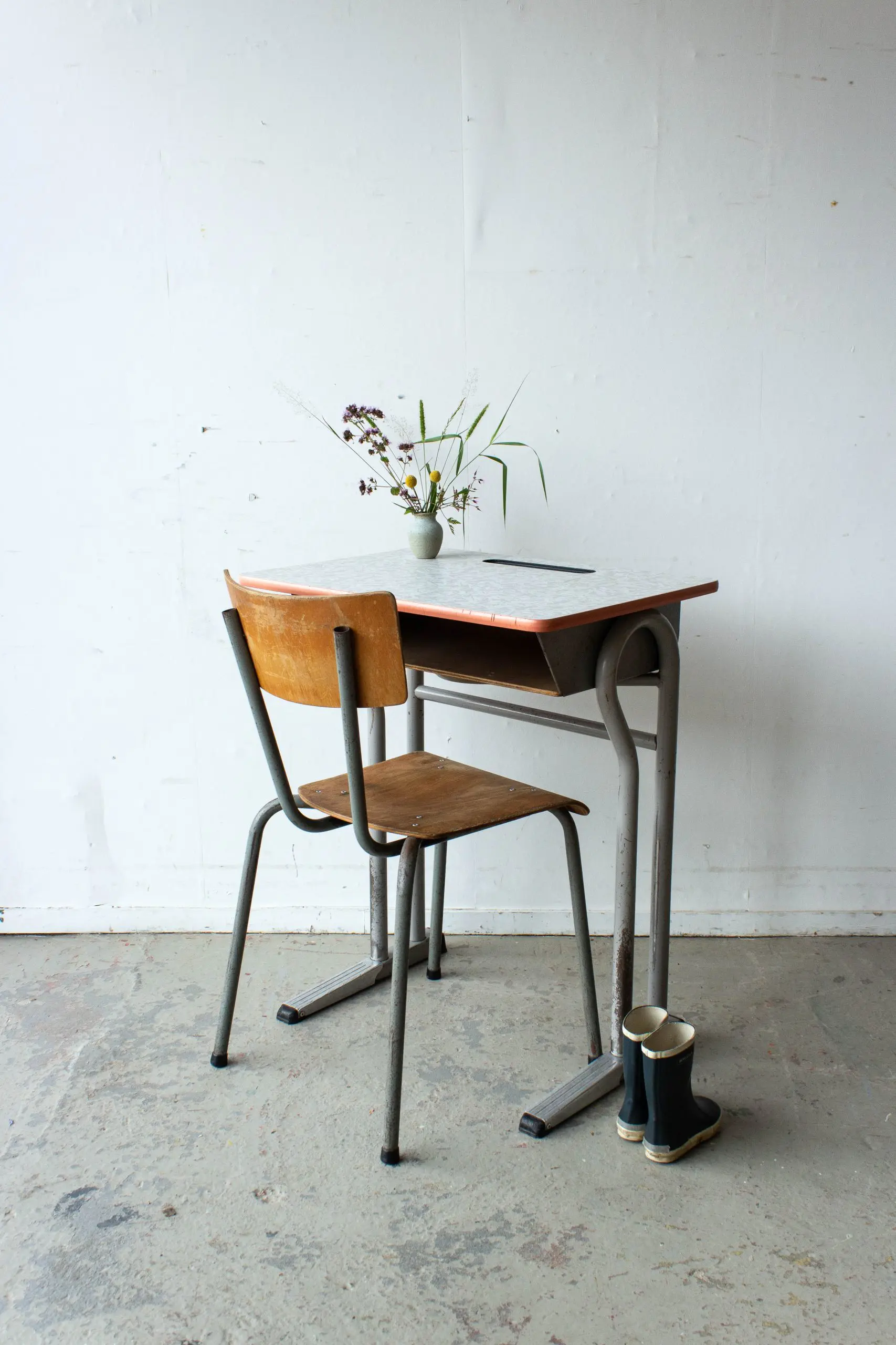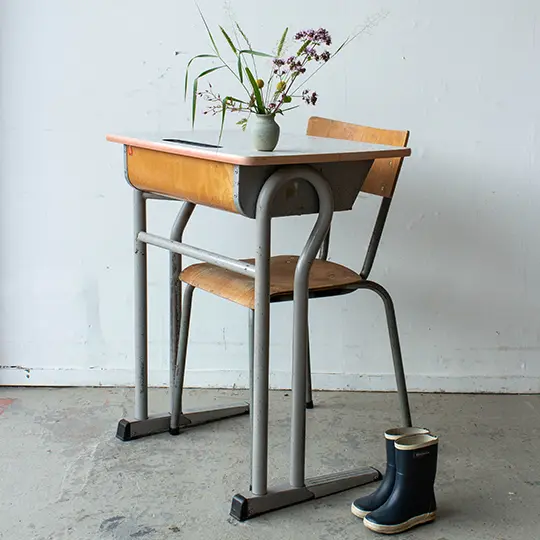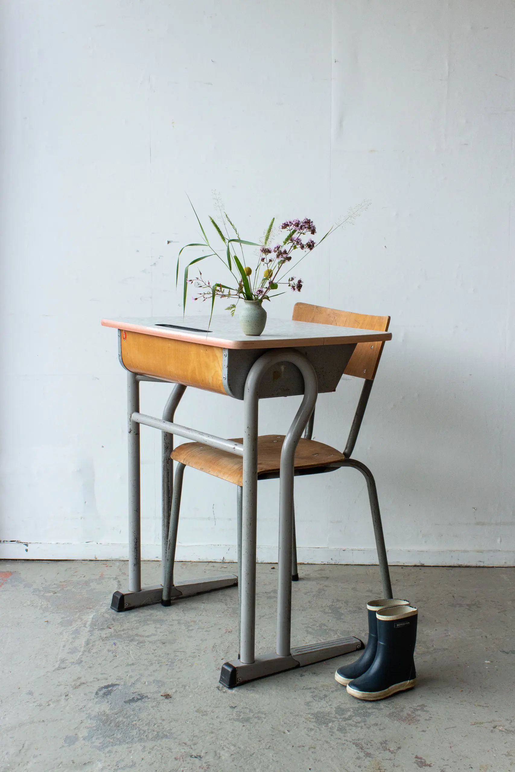 Wat een lief vintage schooltafeltje is dit! We hebben het tafeltje, samen met nog veel tafels en stoelen, uit een voormalig klooster / lagere school in Tongeren mogen halen. Wat waren we blij met deze aanwinst! We hebben het schooltafeltje goed schoongemaakt en helemaal nagelopen. En zo is dit Belgische schooltafeltje met lichtgrijs blad weer helemaal klaar voor gebruik! Leuk voor kindjes tussen de vier en negen jaar.