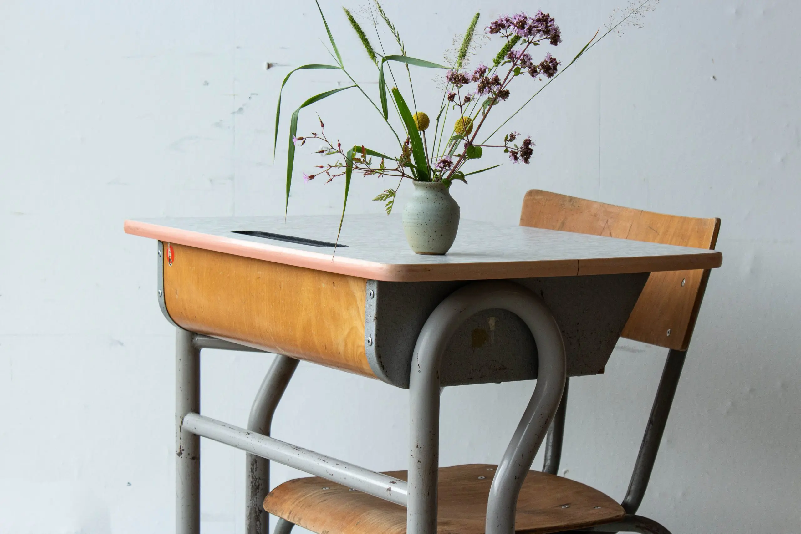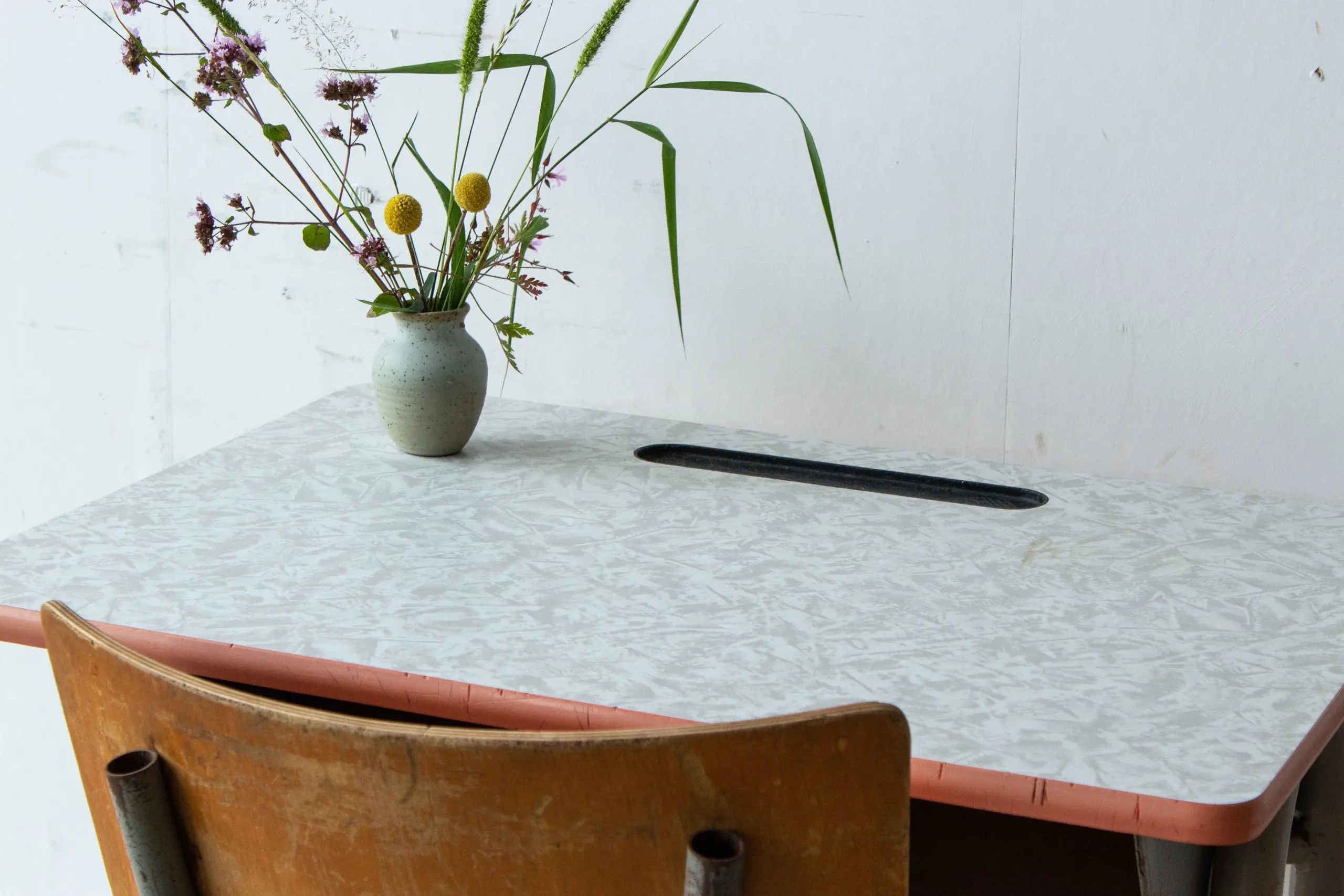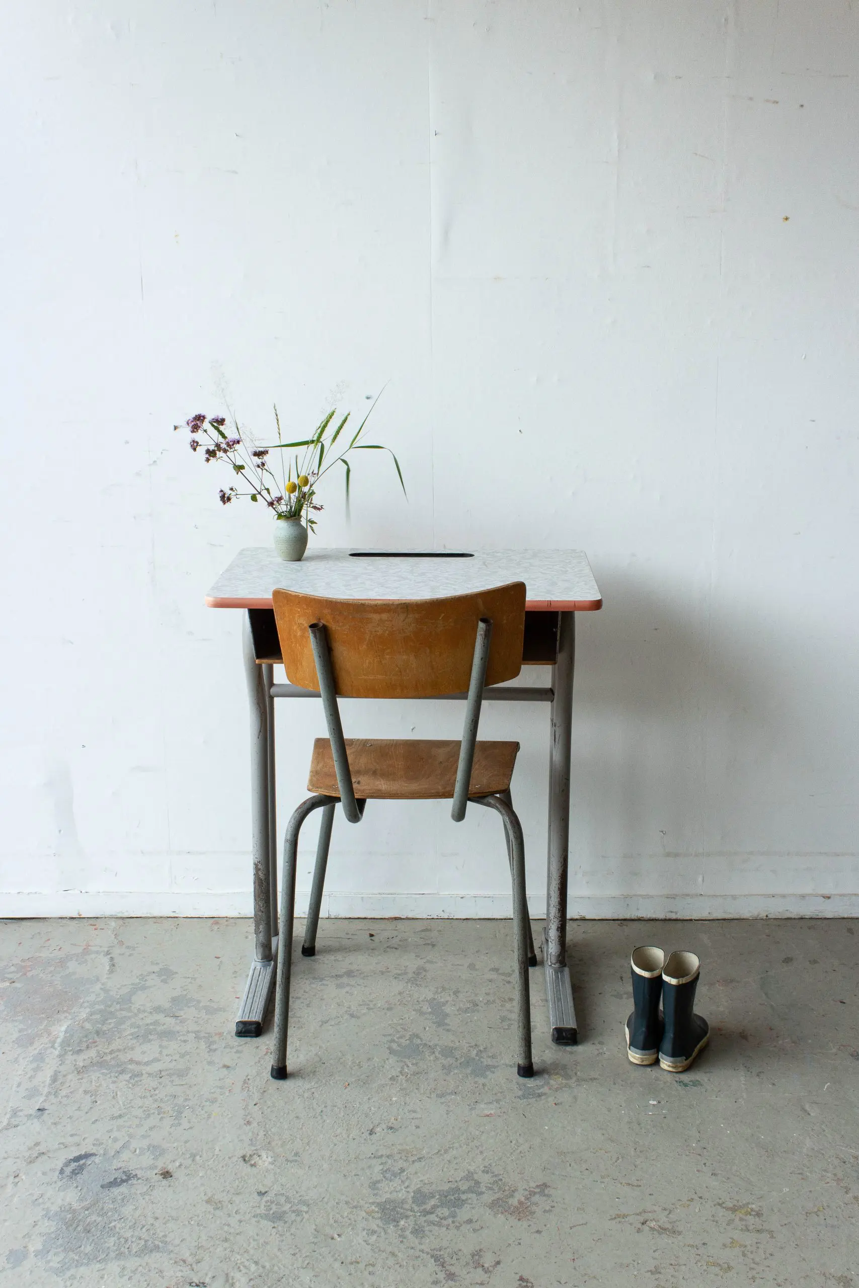 Wat een lief vintage schooltafeltje is dit! We hebben het tafeltje, samen met nog veel tafels en stoelen, uit een voormalig klooster / lagere school in Tongeren mogen halen. Wat waren we blij met deze aanwinst! We hebben het schooltafeltje goed schoongemaakt en helemaal nagelopen. En zo is dit Belgische schooltafeltje met lichtgrijs blad weer helemaal klaar voor gebruik! Leuk voor kindjes tussen de vier en negen jaar.